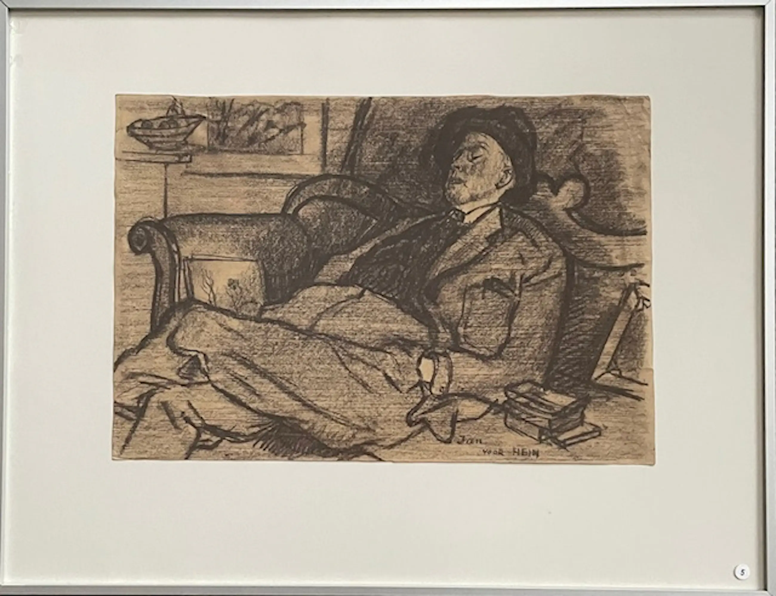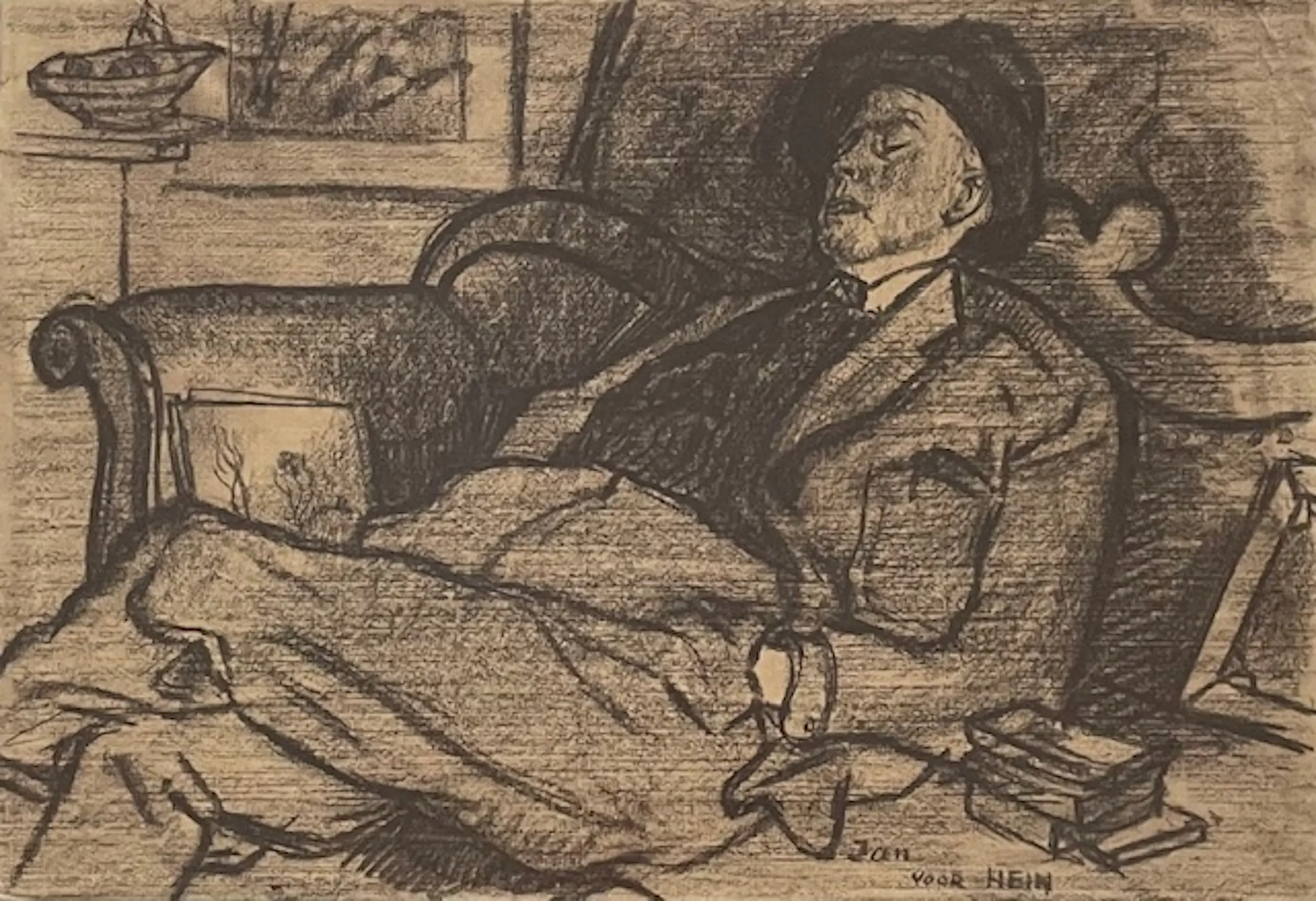 Tekening van jan voor Hein. Jan van Anrooy tekende zijn vriend Hein van Schuppen die bij hem in slaap gevallen was.