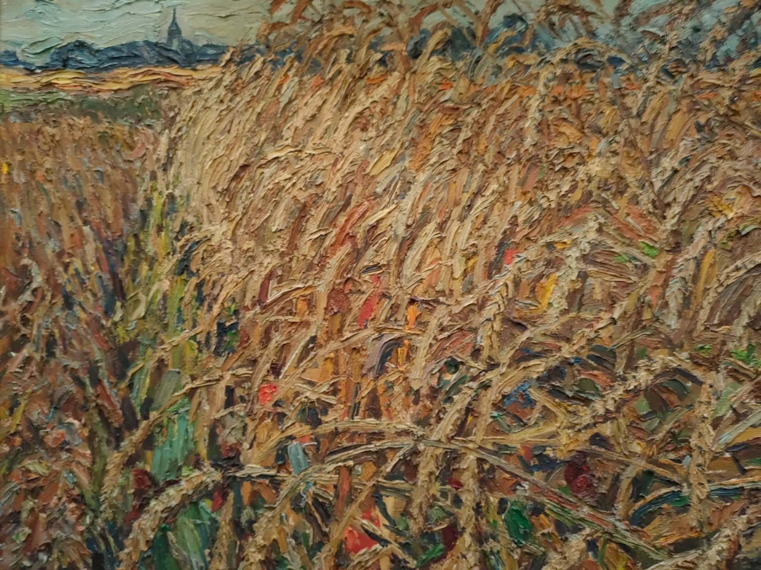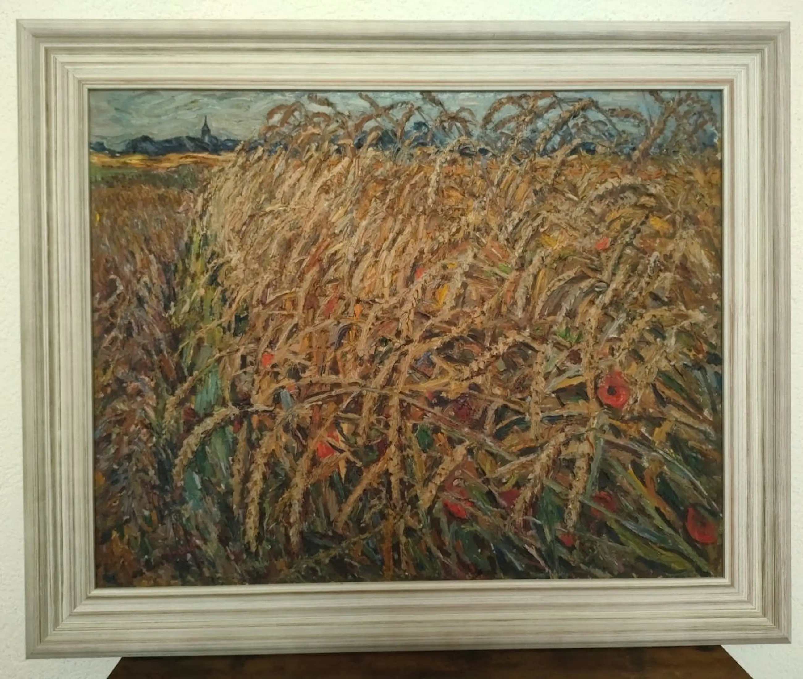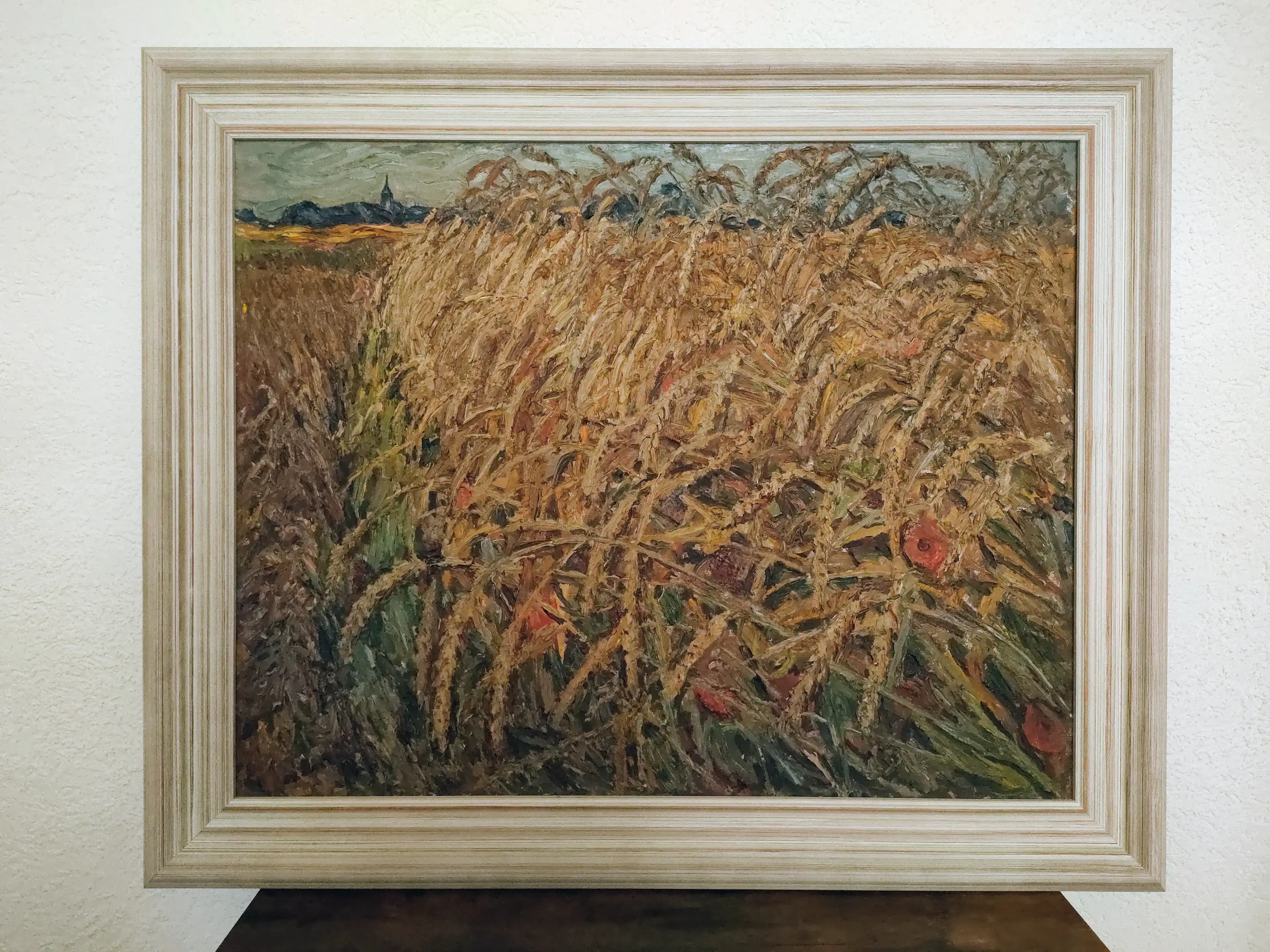 Schilderij van de bekende Betuwse kunstschilder Jan van Anrooy (Zaltbommel 1901 - Tricht 1988) Een koren/graanveld in de Betuwe, close up geschilderd. De verf is dik opgezet met veel reliëf. Linksonder gesigneerd. Van Anrooy deed zijn opleiding aan de Koninklijke Academie te Den Bosch en aan de Kunstgewerbe Schule in Wenen. Als een rasechte Betuwenaar schilderde hij voornamelijk (rivier)landschappen; de ‘Van Gogh van de Betuwe’ werd hij ook wel genoemd. Hij kon als geen ander de ziel van het Betuwse landschap blootleggen.