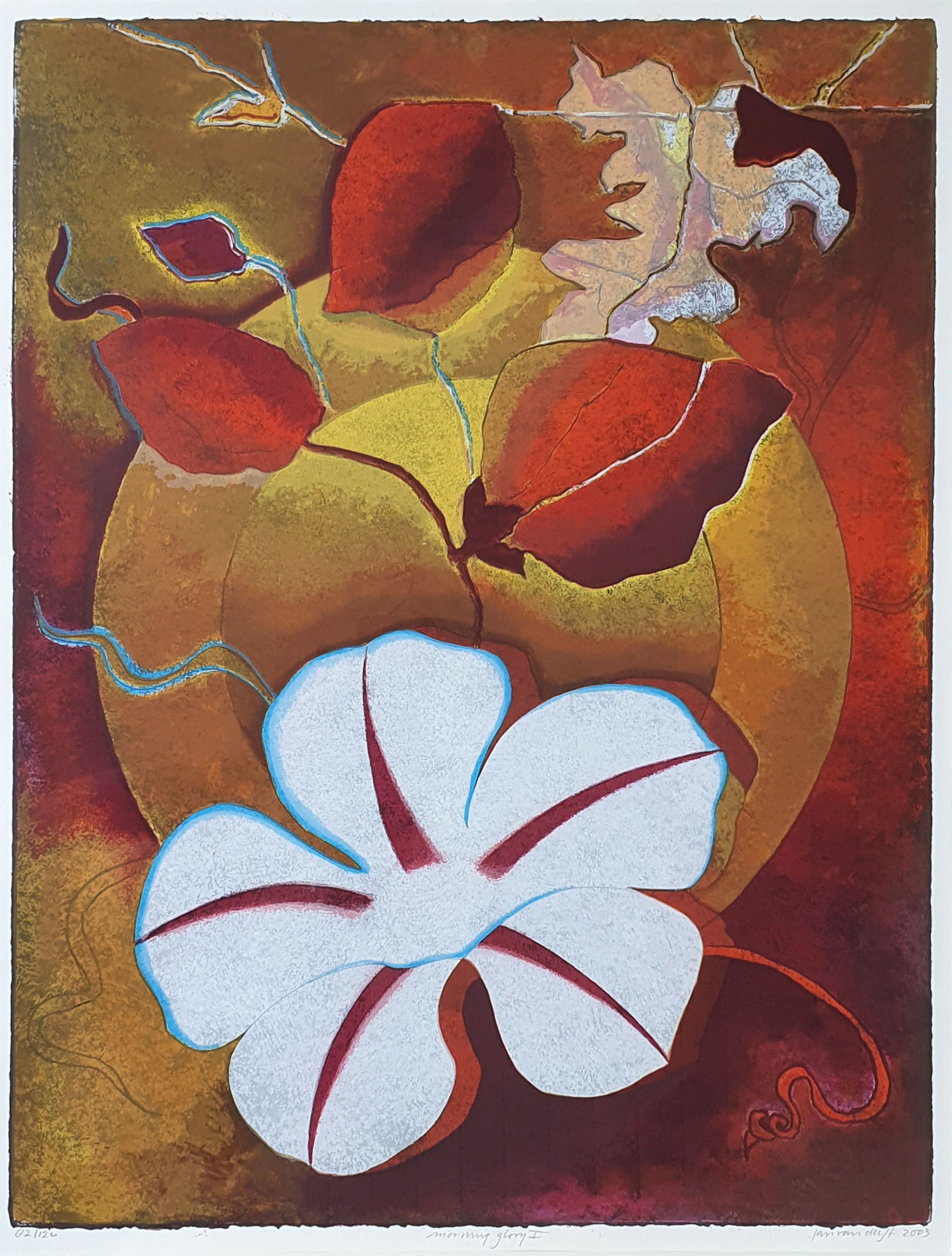 Fraaie kleurrijke zeefdruk van Jan van Delft. Rechtsonder gesigneerd Jan van Delft en genummerd 82/160.
