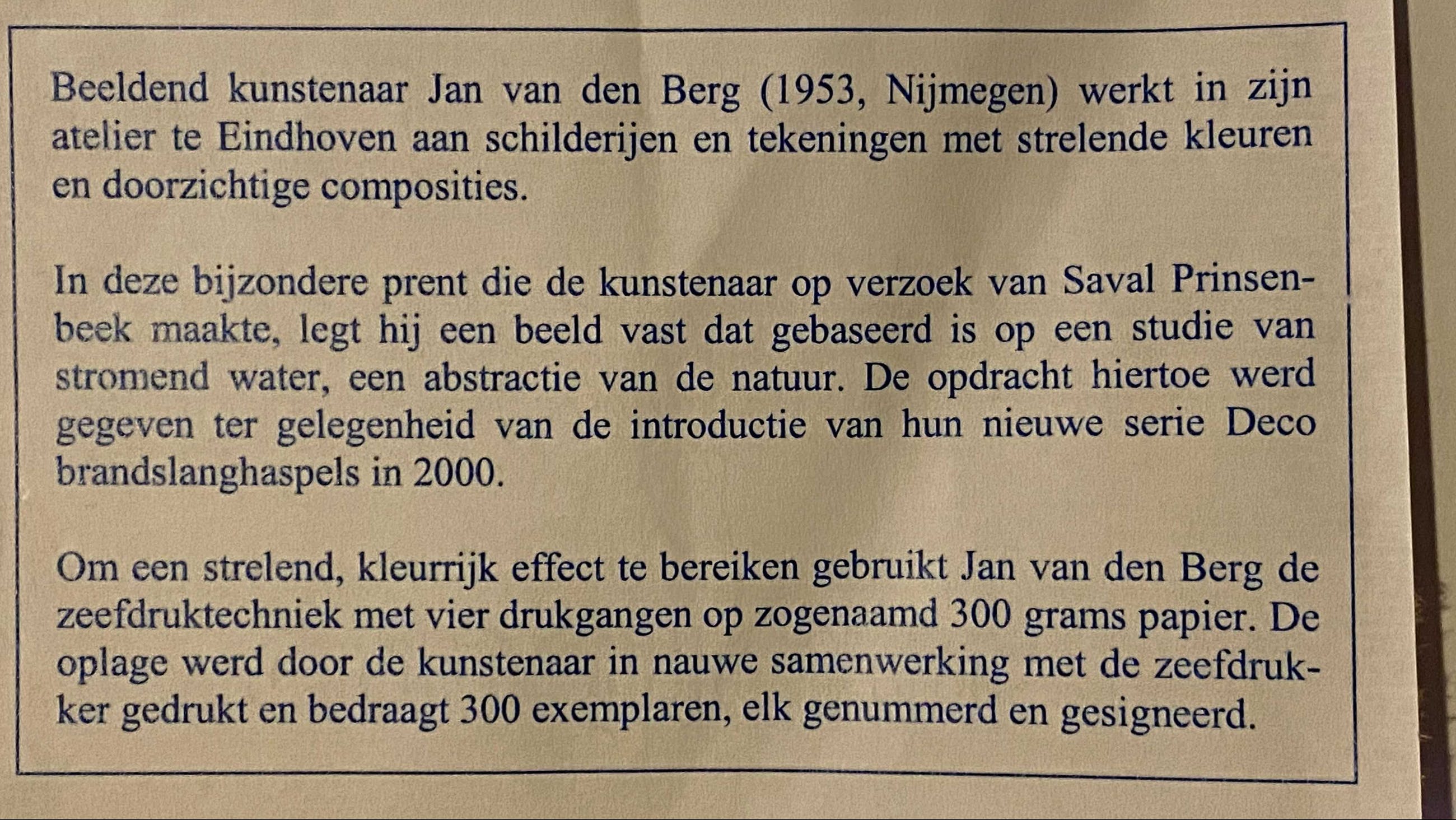 Om een strelend, kleurrijk effect te bereiken gebruikt Jan van den Berg de zeefdruk-techniek met vier drukgangen op zogenaamd 300 grams papier.'' >Bron: Achterop de lijst bijgeleverde informatie.