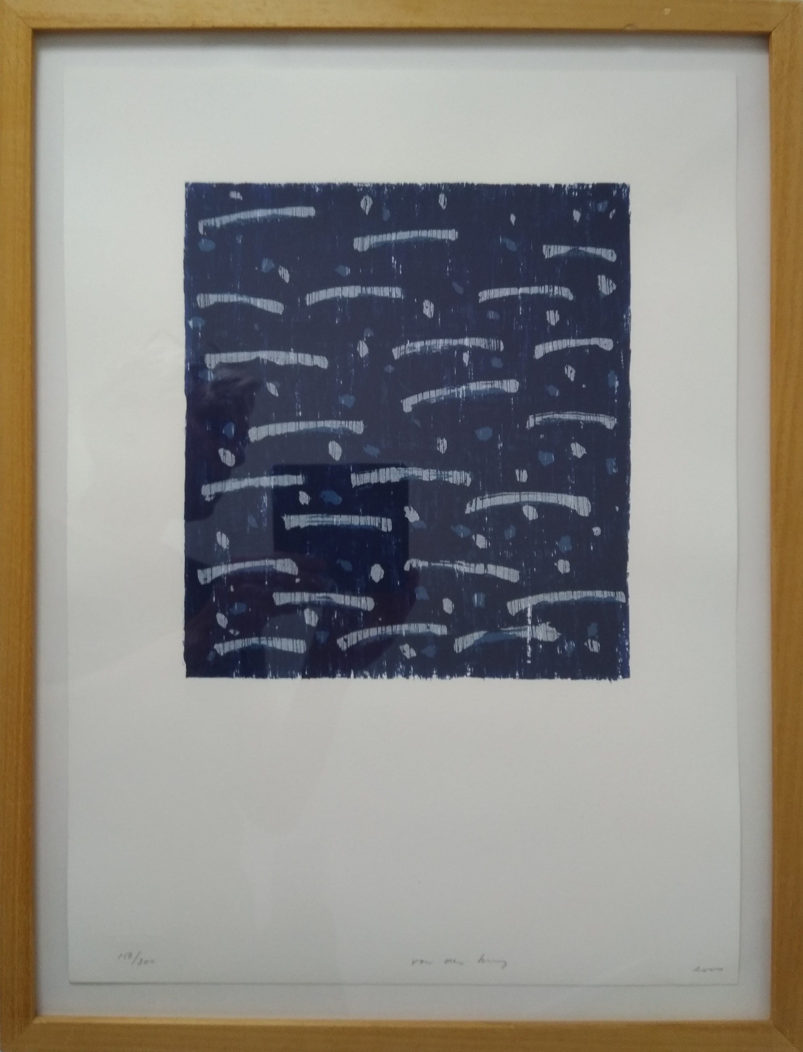 ''Beeldend kunstenaar Jan van den Berg (1953, Nijmegen) werkt in zijn atelier te Eindhoven aan schilderijen en tekeningen met strelende kleuren en doorzichtige composities. In deze bijzondere prent legt hij een beeld vast dat gebaseerd is op een studie naar stromend water, een abstractie van de natuur. Om een strelend, kleurrijk effect te bereiken gebruikt Jan van den Berg de zeefdruk-techniek met vier drukgangen op zogenaamd 300 grams papier.'' >Bron: Achterop de lijst bijgeleverde informatie.