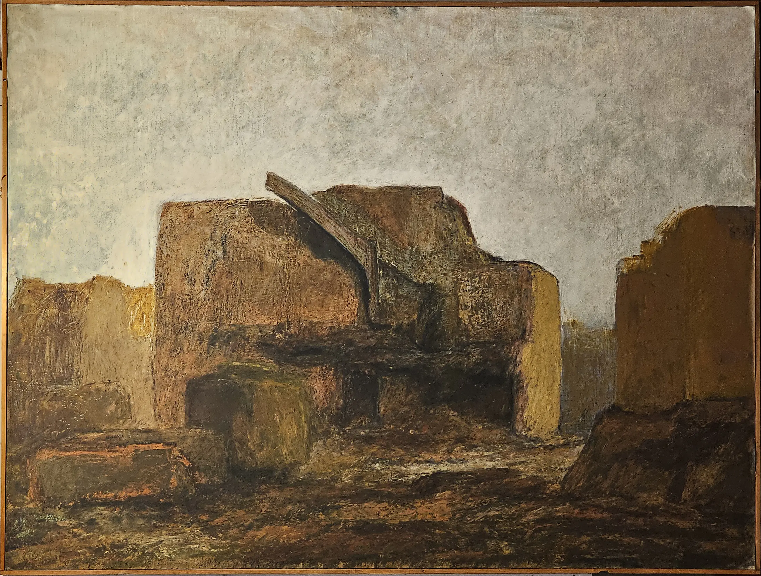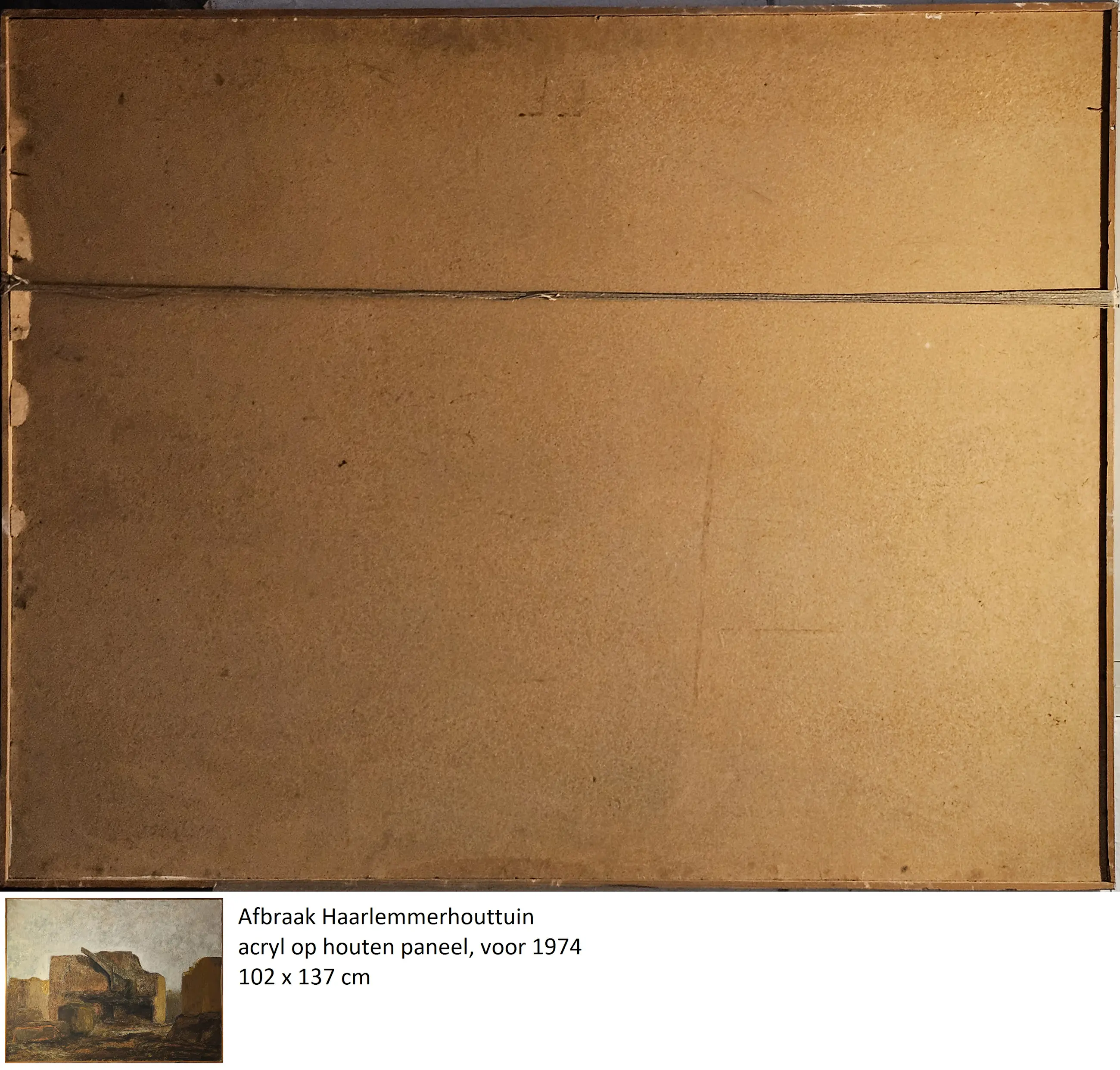 | Het schilderij zelf is in goede staat. Aan de achterkant heeft het houten bord wat afgebrokkelde randjes, zoals te zien is op de foto. Dit heeft geen invloed op de schilderzijde. | |
