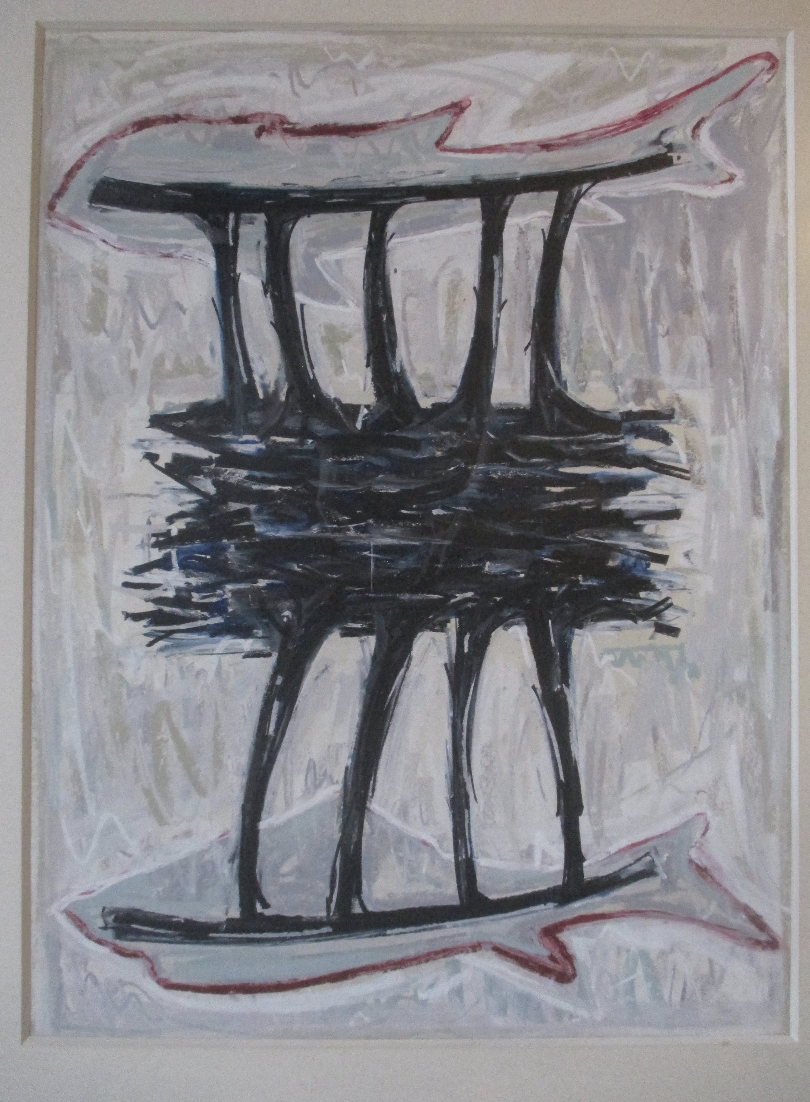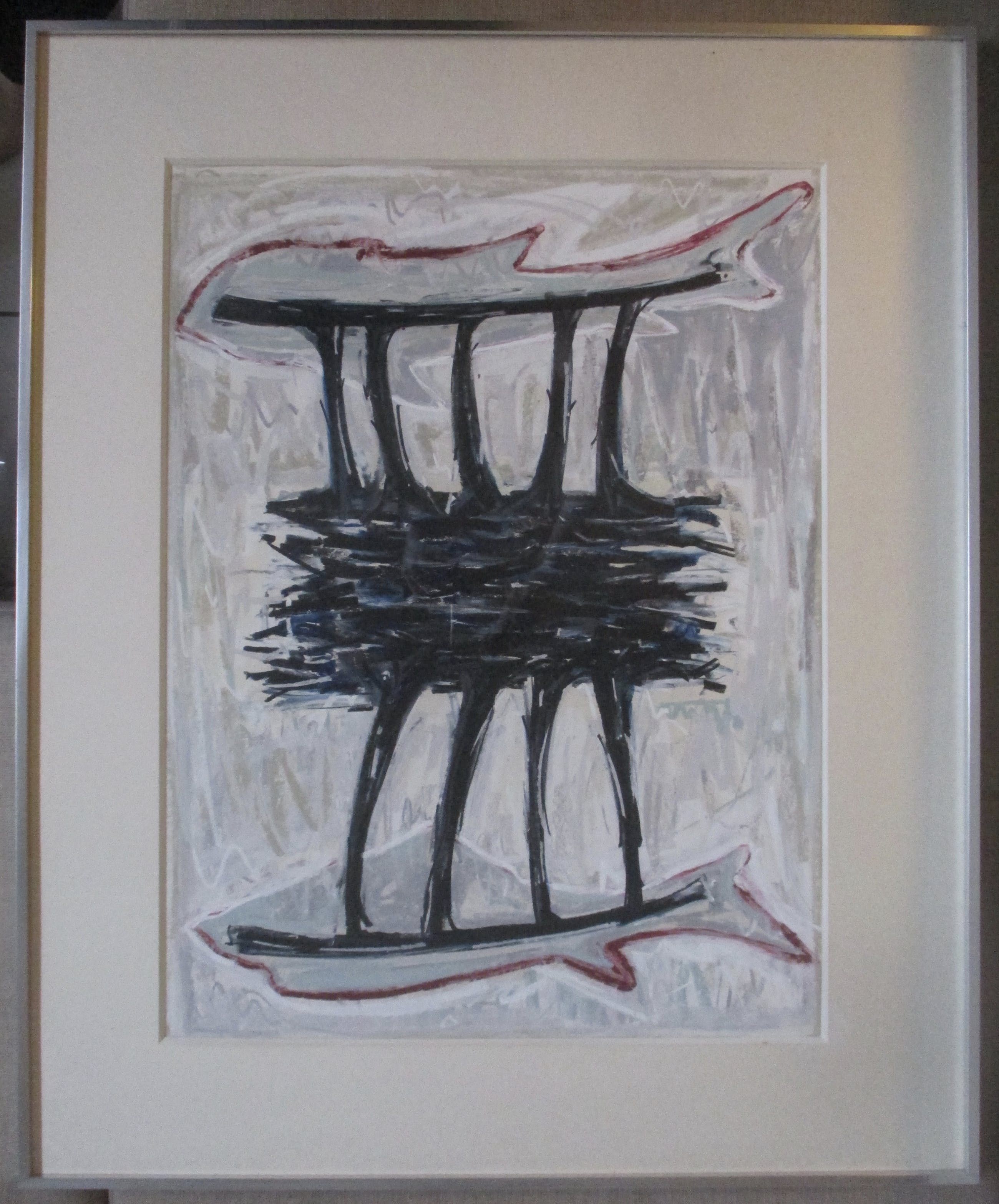 Gemengde techniek op papier van Jan van den Langenberg, ingelijst achter glas en passe-partout.