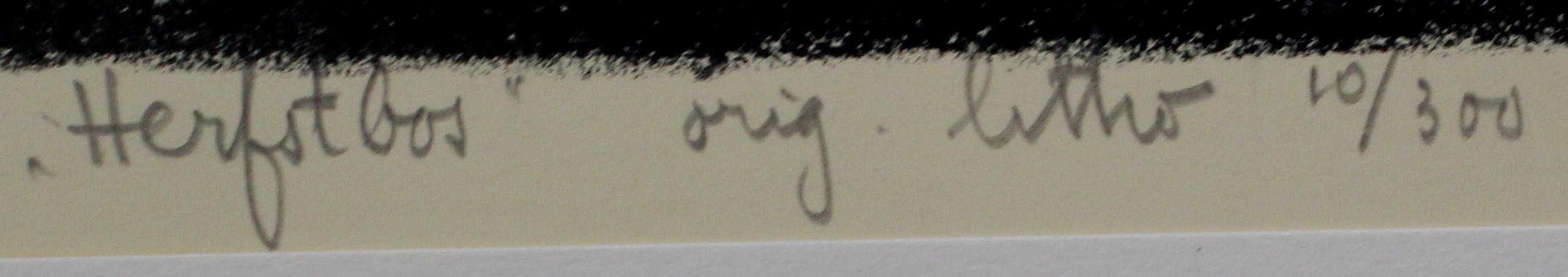 Litho van Jan van den Thillart uit 1957. Titel: Herfstbos. Oplage: 10/300. Afmetingen blad incl passepartout: H52.5 x b67cm. Afmetingen voorstelling: H34 x b47cm. Het werk is rechtsonder gesigneerd en gedateerd door de kunstenaar. De authenticiteit van dit aangeboden werk wordt volledig gegarandeerd. Een certificaat van echtheid kan, op verzoek, worden gemaild.