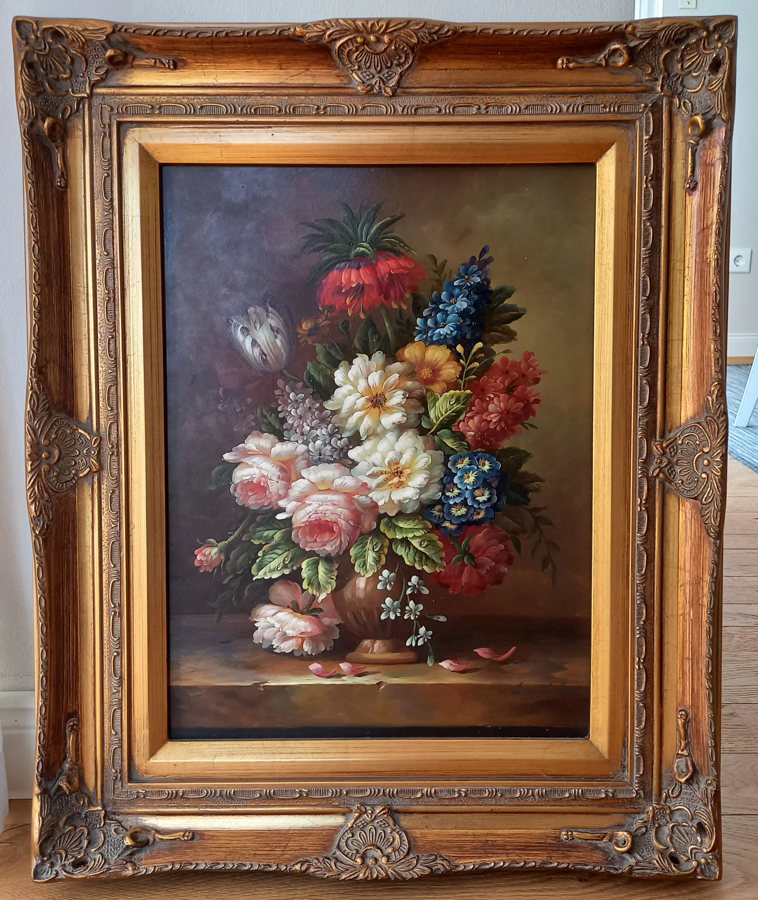 Sfeervol en decoratief bloemstilleven in staand formaat, uitgevoerd in olieverf op paneel (hout). Het werk toont een rijk en kleurrijk boeket met onder meer rozen en andere bloemen, geschikt in een klassieke vaas tegen een warme, donkere achtergrond.