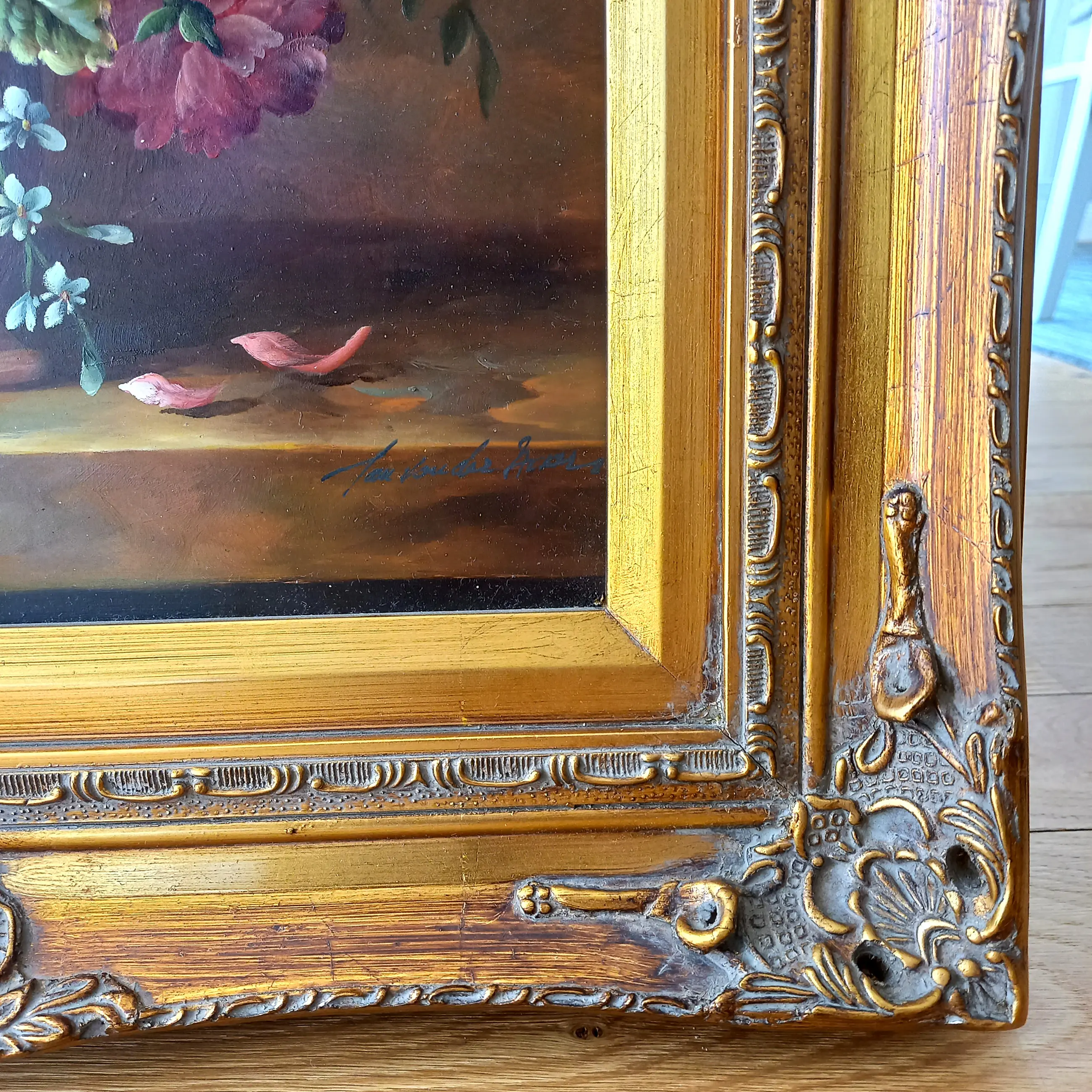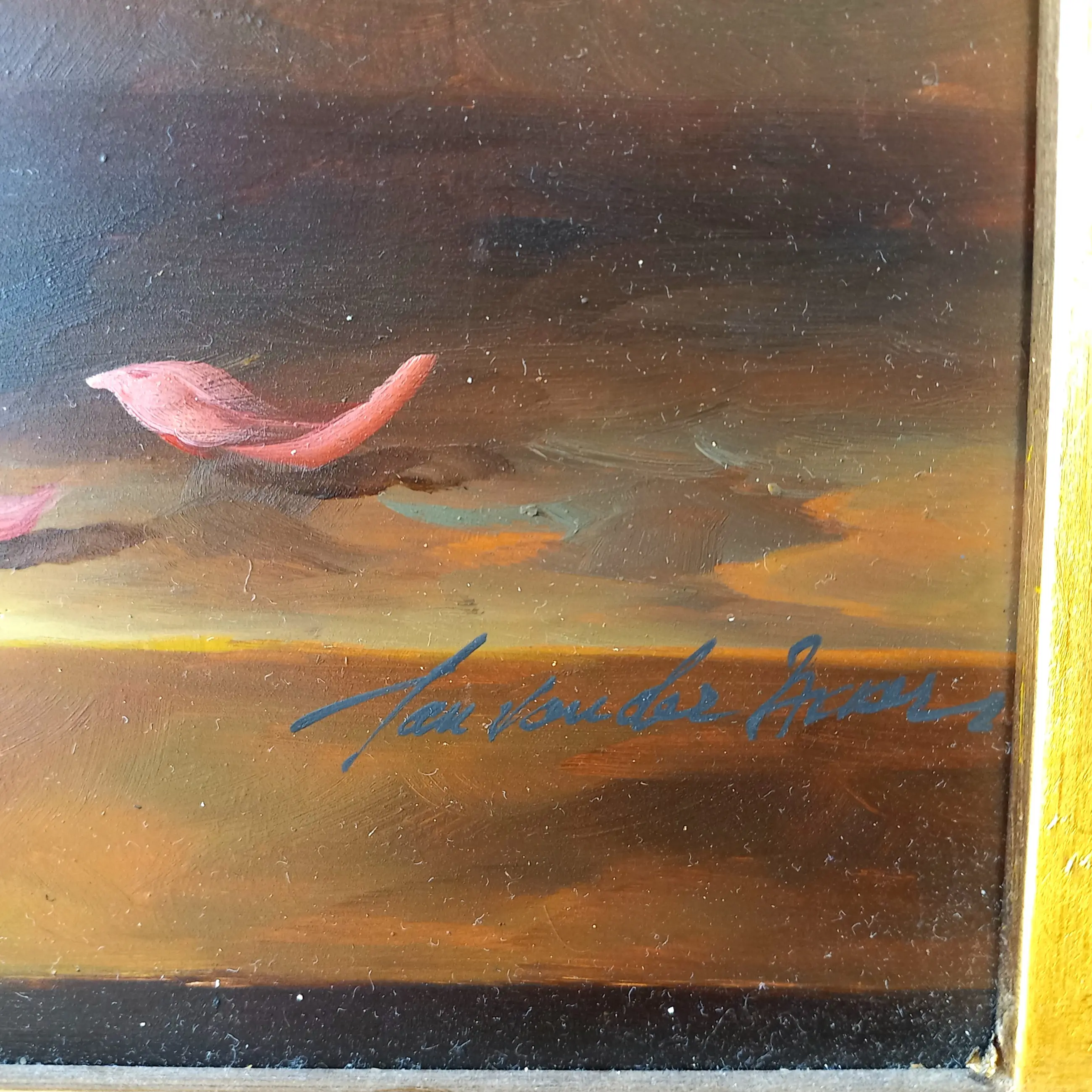 Rechtsonder gesigneerd “Jan van der Akker”. Het schilderij is geplaatst in een rijk gedecoreerde, goudkleurige lijst, die het werk een extra klassieke uitstraling geeft.