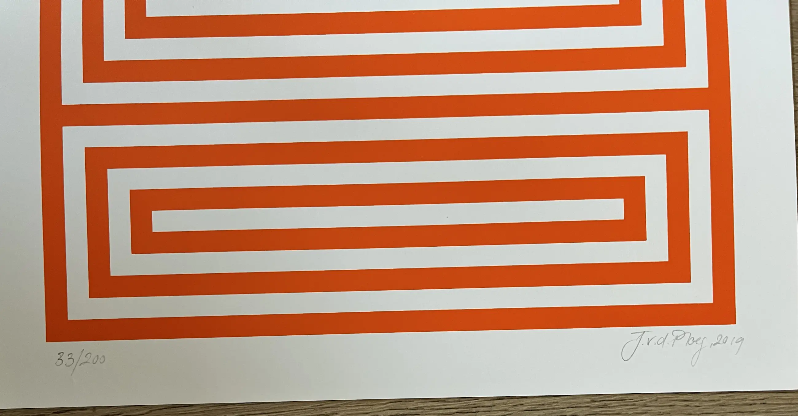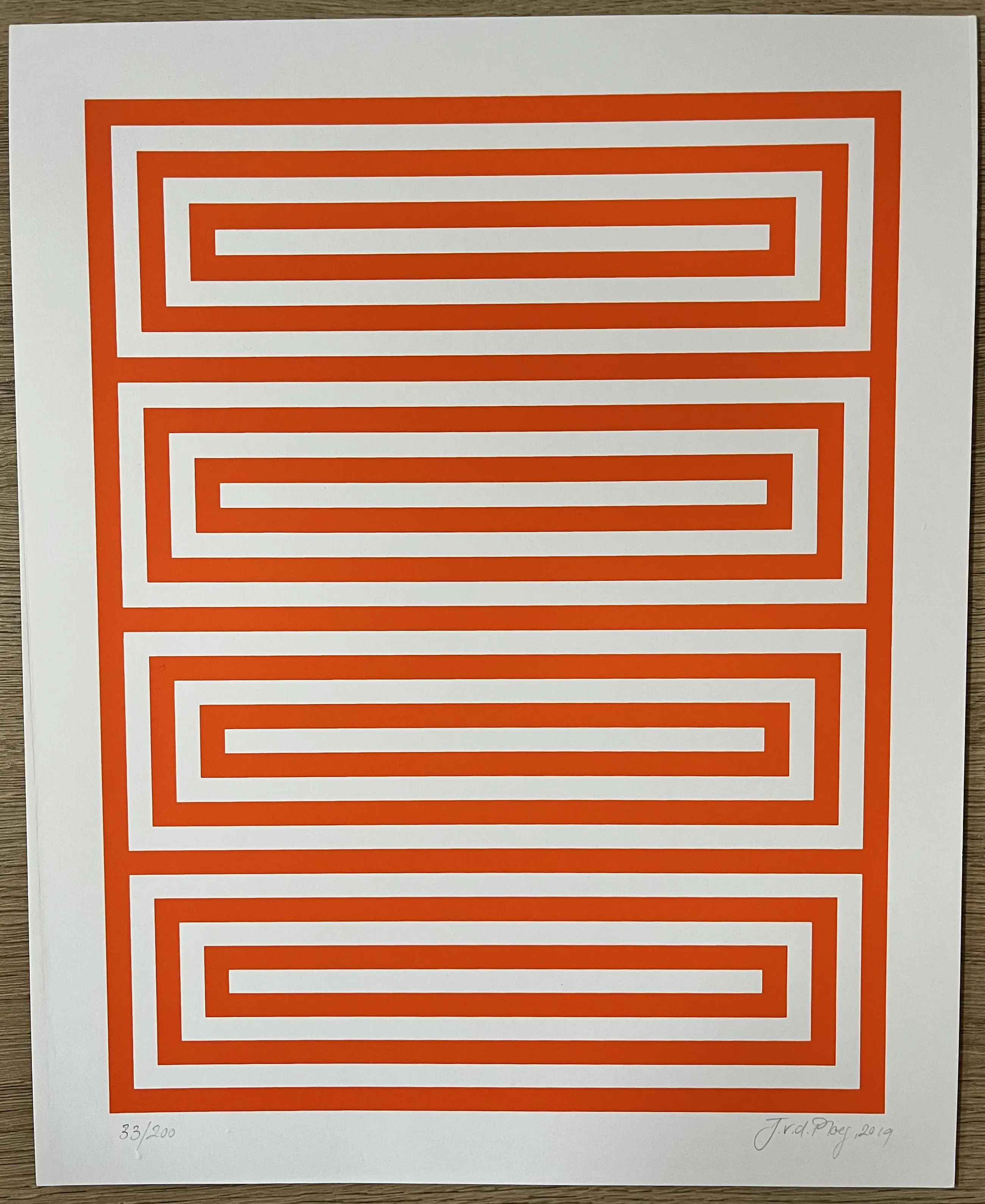 Een prachtig geometrisch abstract werk van Jan van der Ploeg. Een mooie kans om zijn werk in huis te hebben hangen. Zijn muurschilderingen zijn verbluffend.