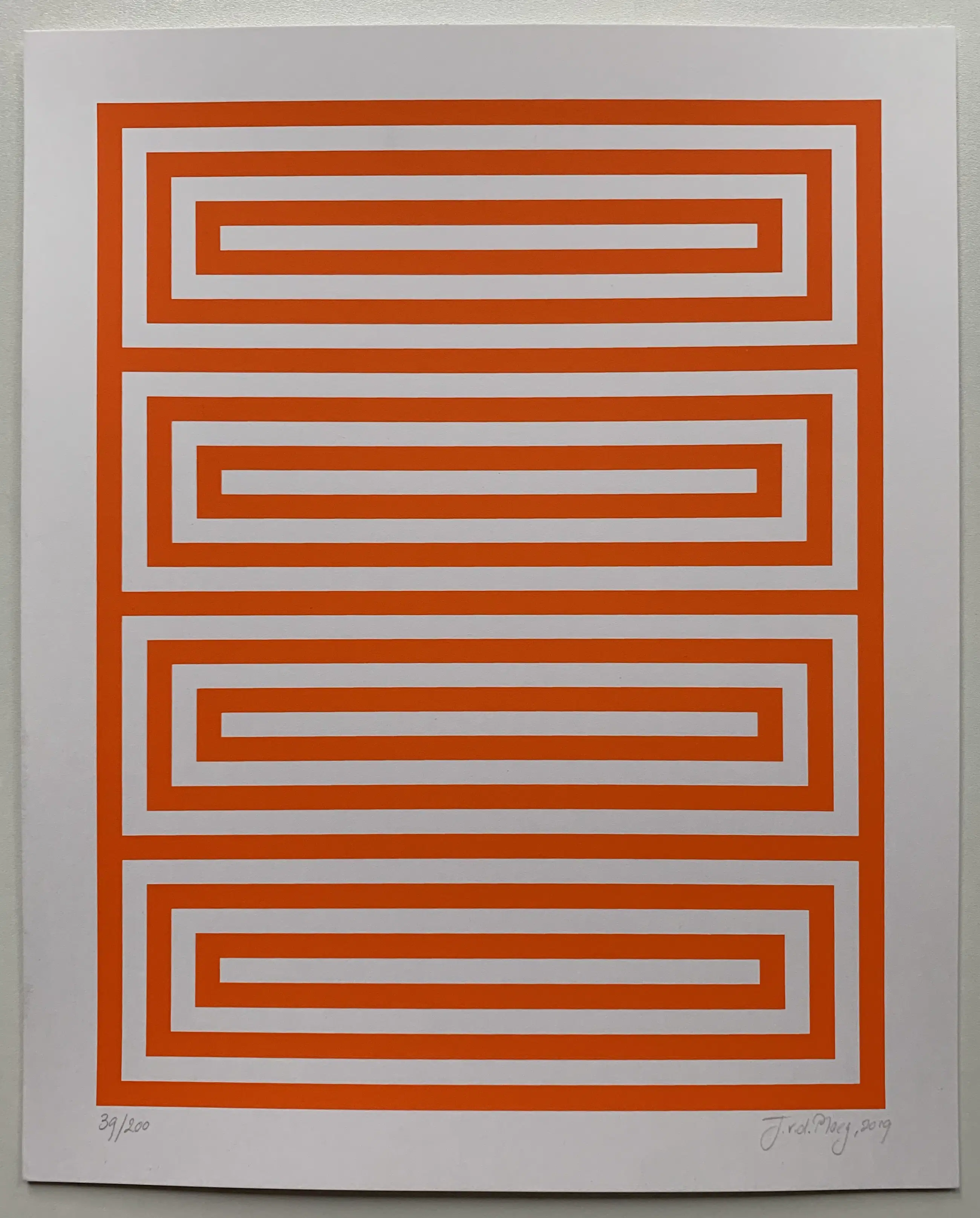 Dit werk is door hem gemaakt in 2019 en geheel in lijn met zijn beeldtaal. Door de kunstenaar met potlood gesigneerd en gedateerd. Afmeting van het blad is 36 x 29cm. Een must have voor een verzamelaar van geometrisch abstracte kunst, of gewoon voor iemand die iets heel moois aan de muur wil hebben. Nummering kan afwijken van de foto, ivm meerdere exemplaren.