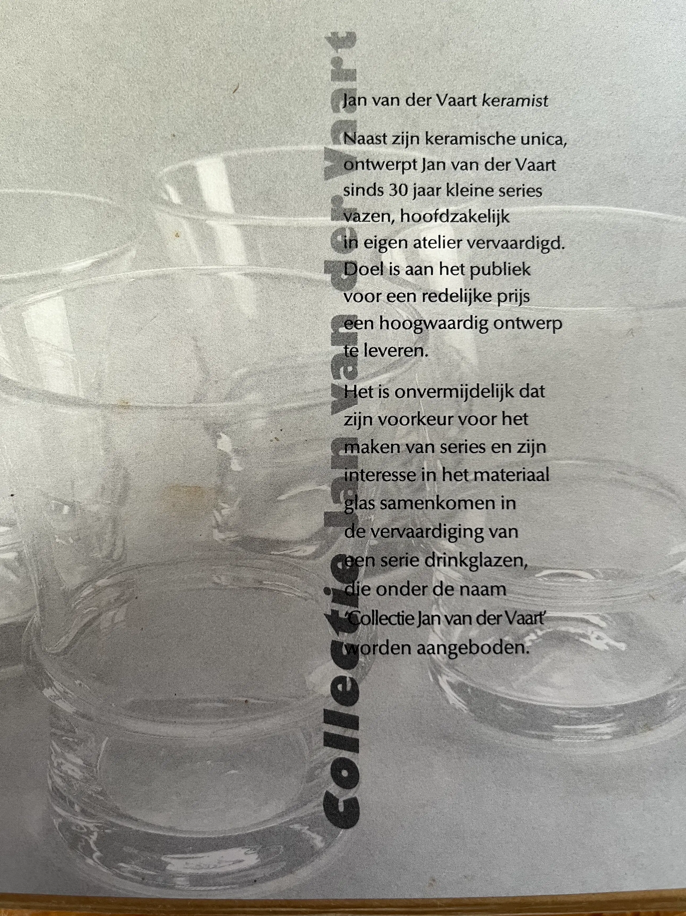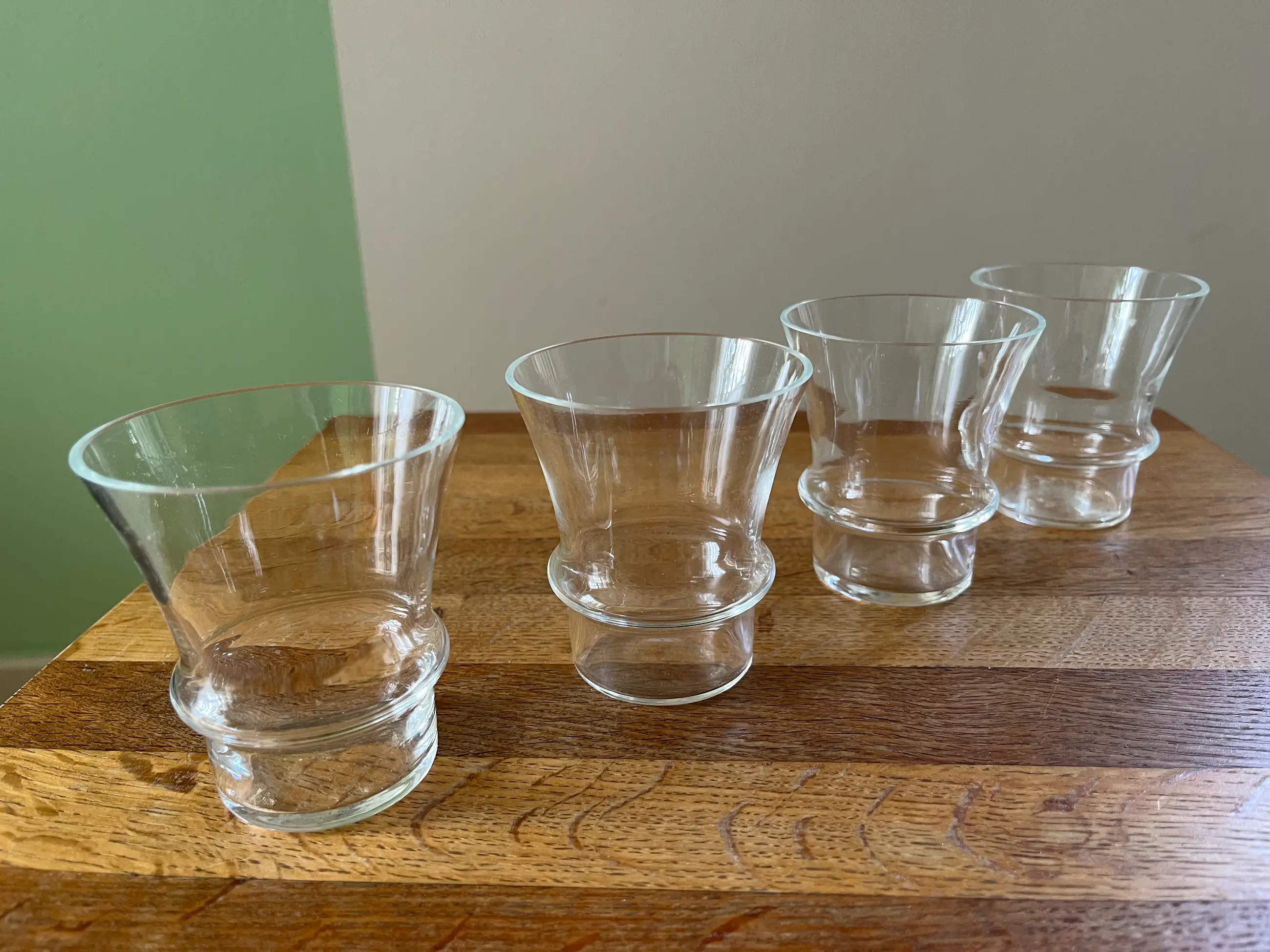 4 heldere drinkglazen in originele verpakking. Uitvoering Glasfabriek Leerdam. Gemerkt op de doos. Herkomst Carla Koch, Amsterdam. Hoogte glas 8,1 cm. Diameter 7,1 cm. Jaar van uitvoering 1995/1999.
