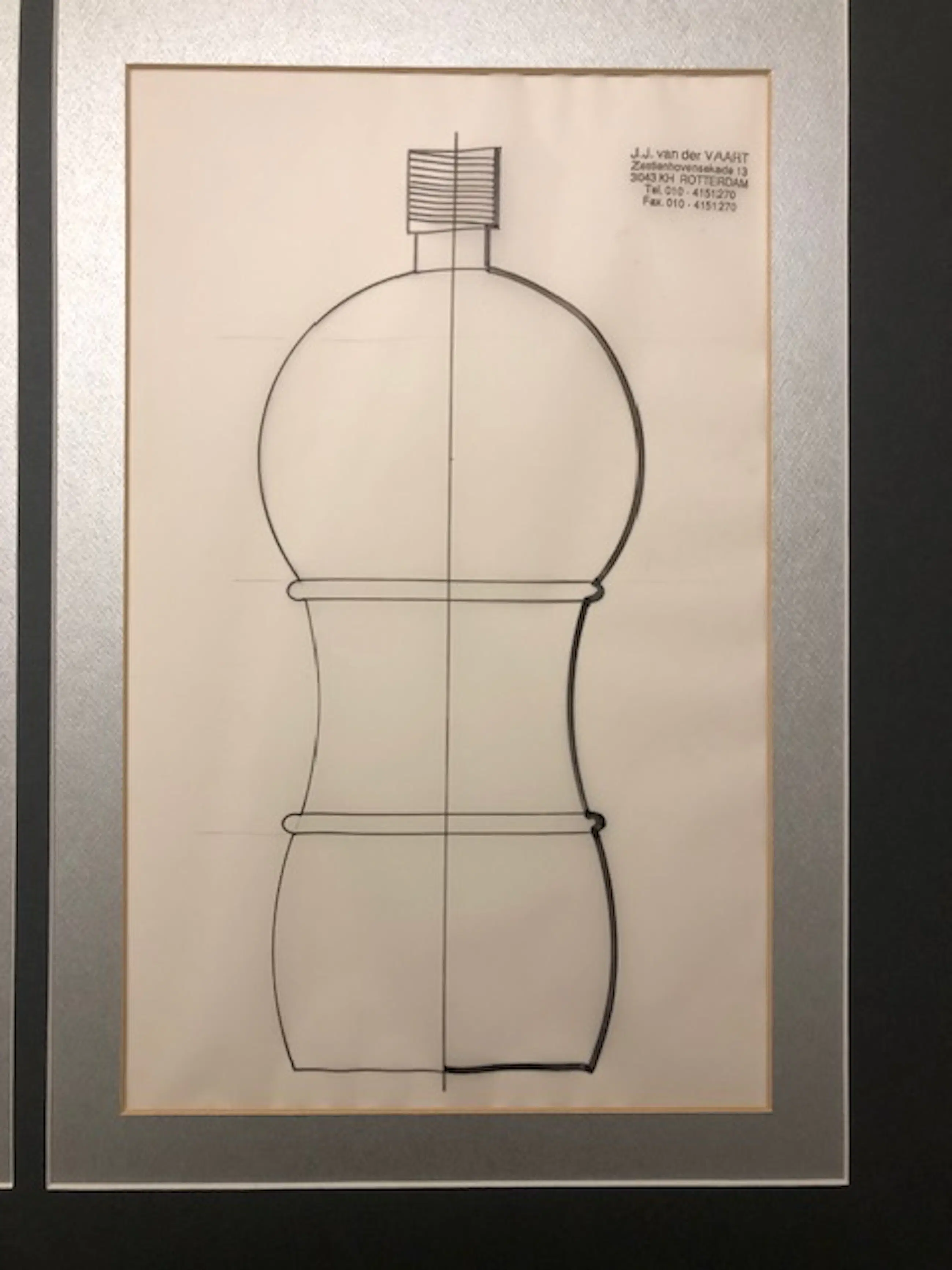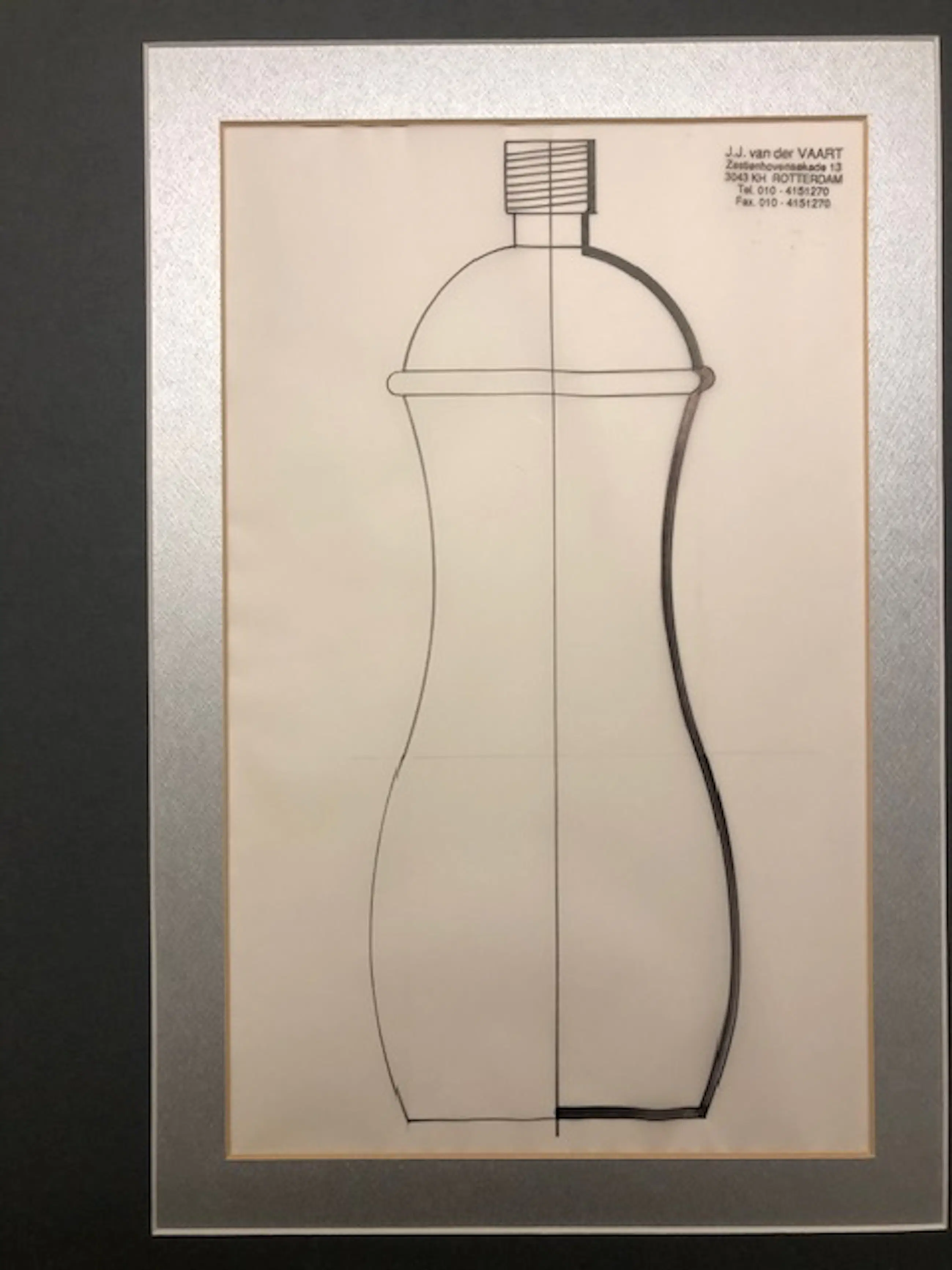 Jan Van der Vaart.(1931-2000) Ontwerptekening voor twee flessen met schroefdop. Jan Van Der Vaart was een beroemd keramist. Hij maakte ook ontwerpen voor Royal Leerdam. Mij is niet bekend of dit ontwerp gemaakt is voor Royal Leerdam. Deze ontwerptekening is uitgevoerd in inkt op transparant ontwerp papier. Gekaderd onder een dubbele passe-partout. Zonder verdere omlijsting. De afmeting is incl. kader 48 x 60 cm. Het werk is gestempeld en in onberispelijke staat. Momenteel is er in Haarlem een overzichtstentoonstelling over het werk van deze kunstenaar.