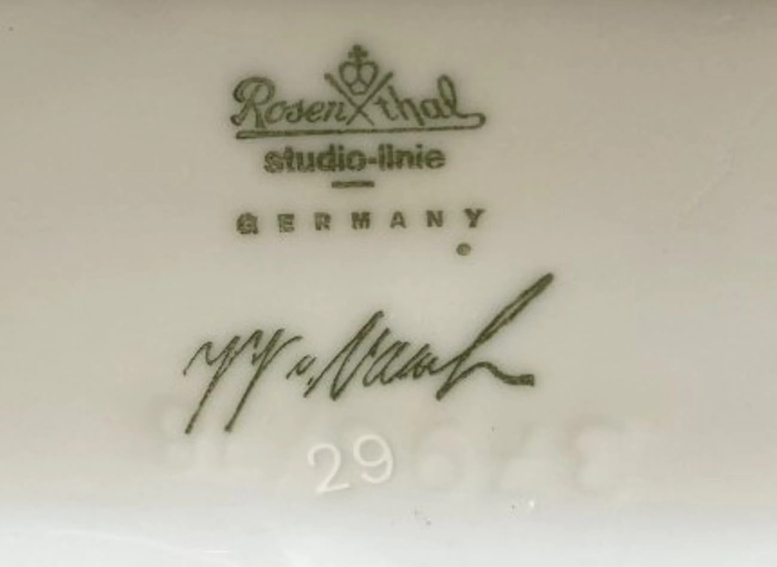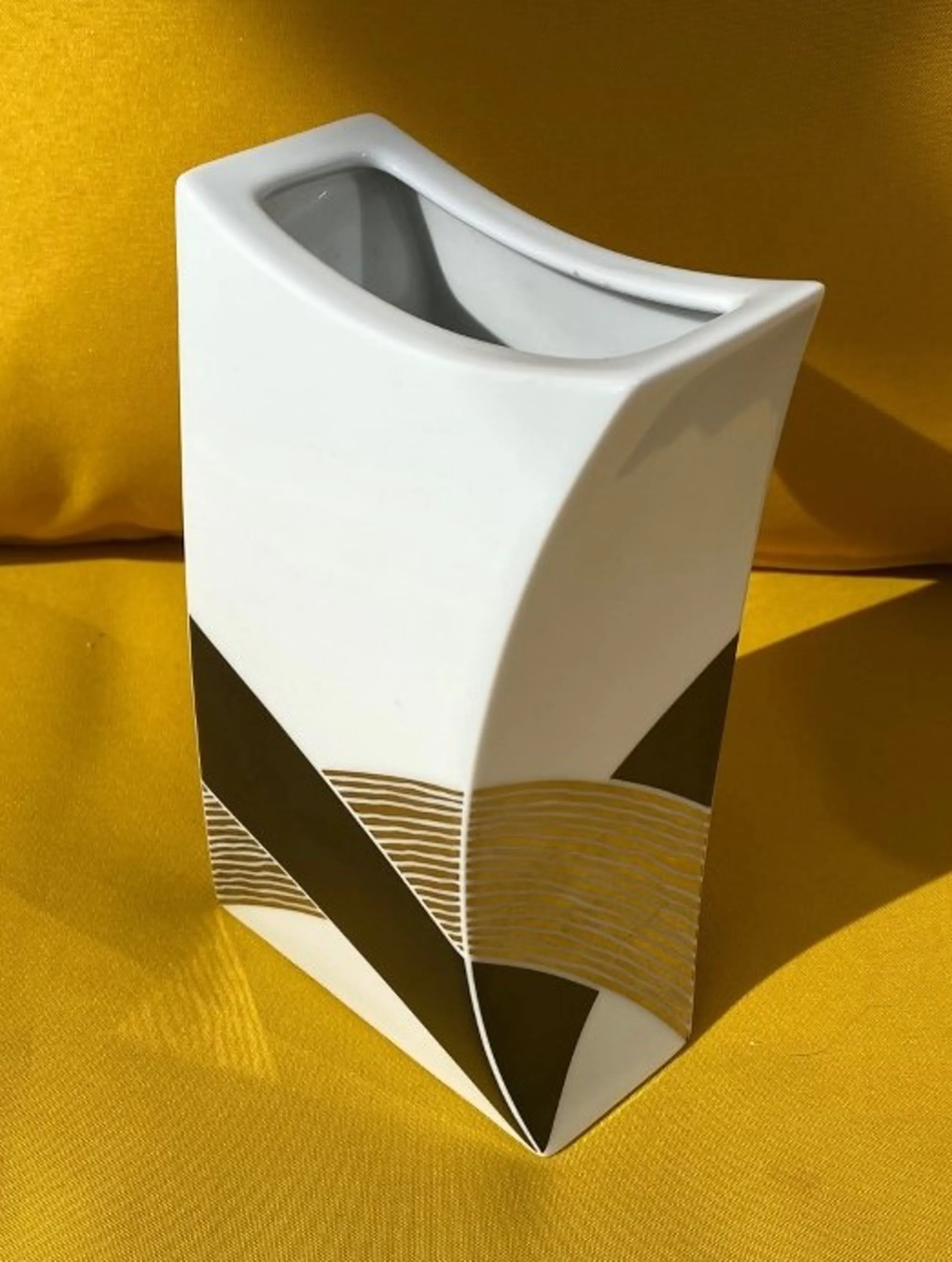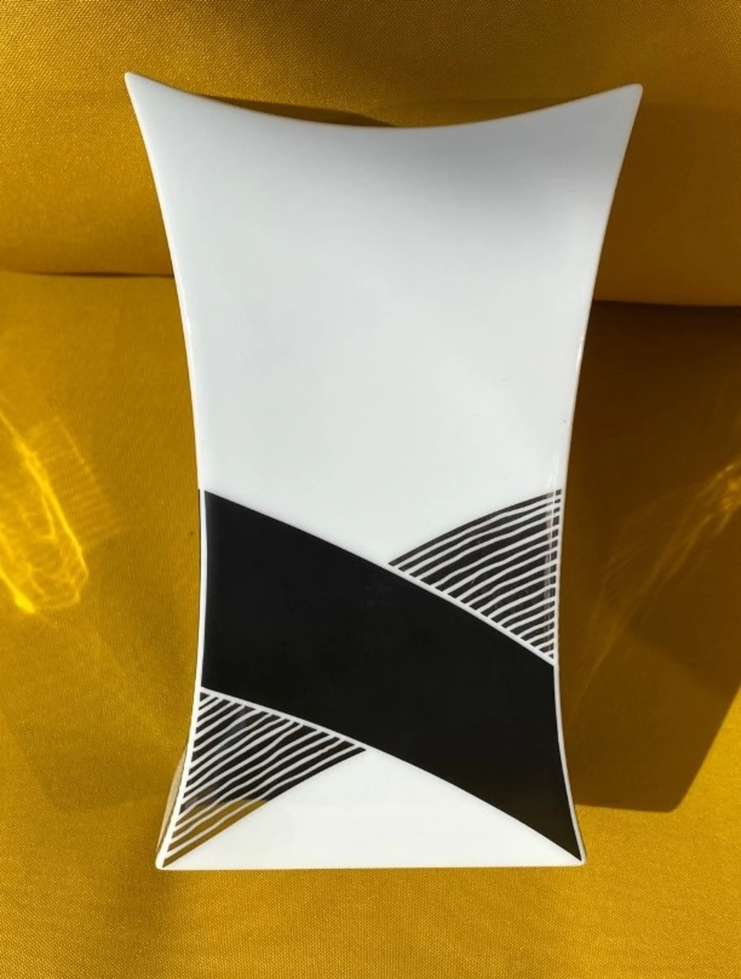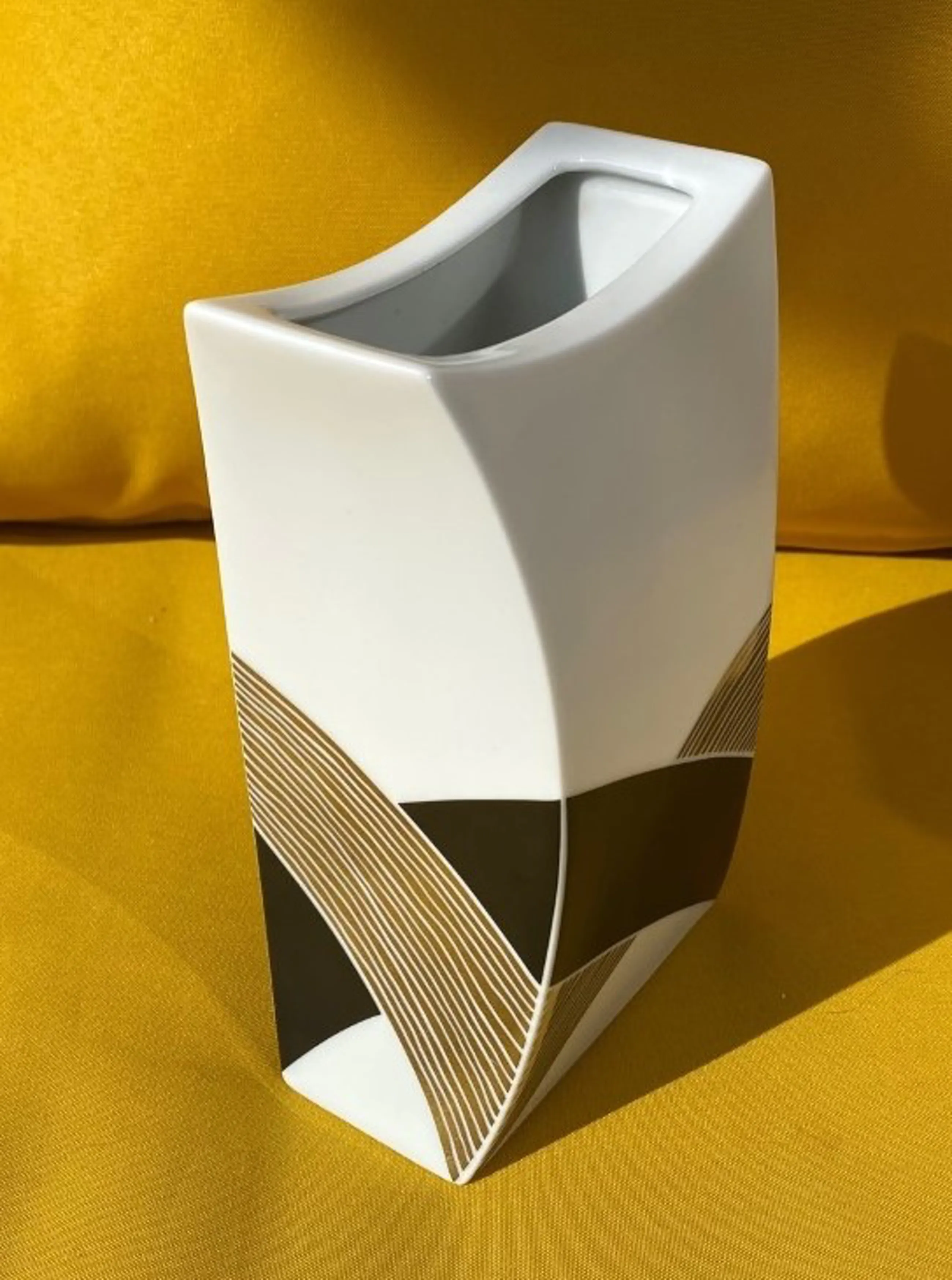 Porseleinen vaas met zwart en verguld lineair decor ontwerp Jan van der Vaart uitgevoerd voor Rosenthal. In zeer goede onbeschadigde conditie. Aan de onderzijde gesigneerd en gemerkt en ook aan een zijkant is de vaas gesigneerd.