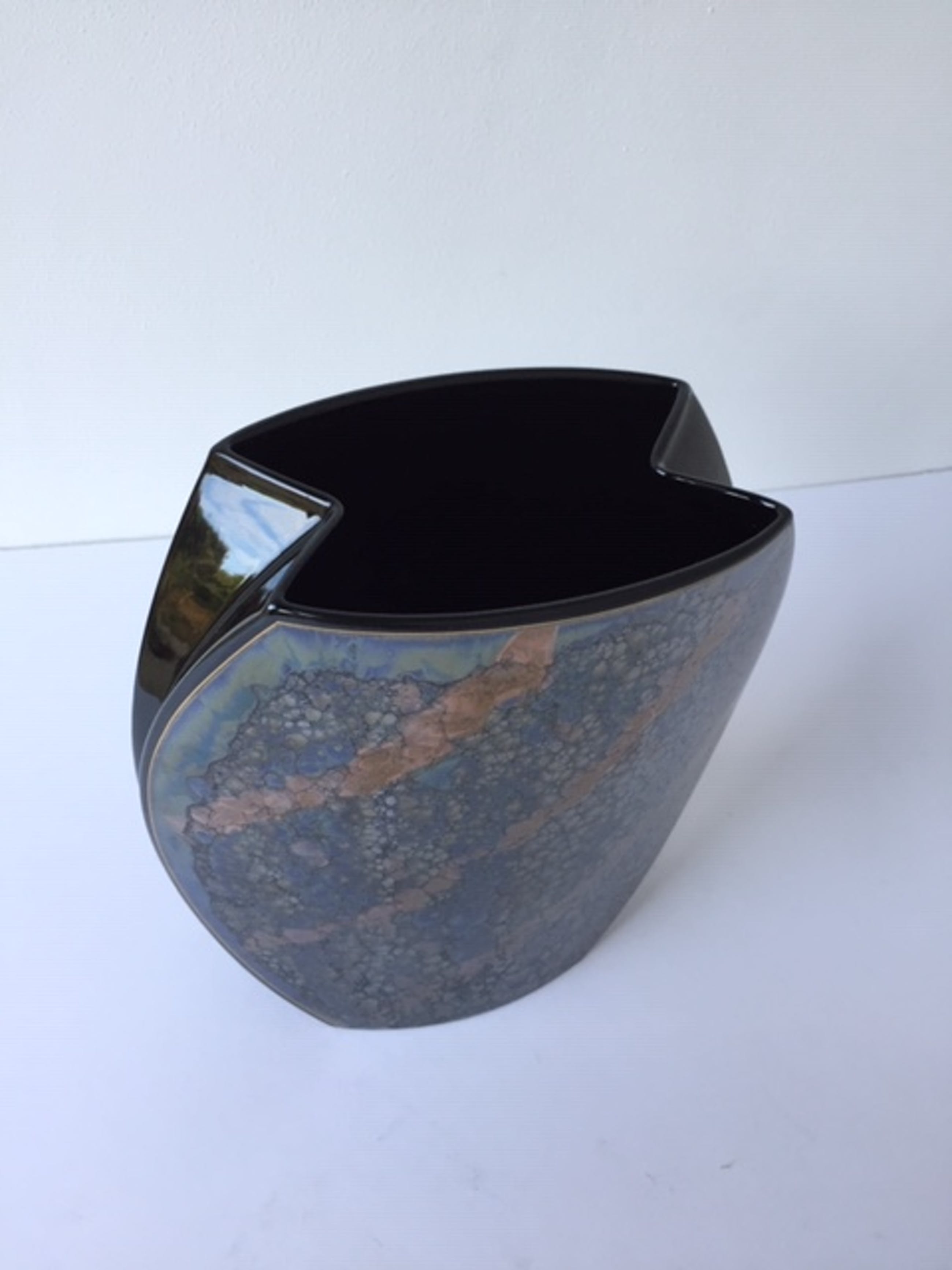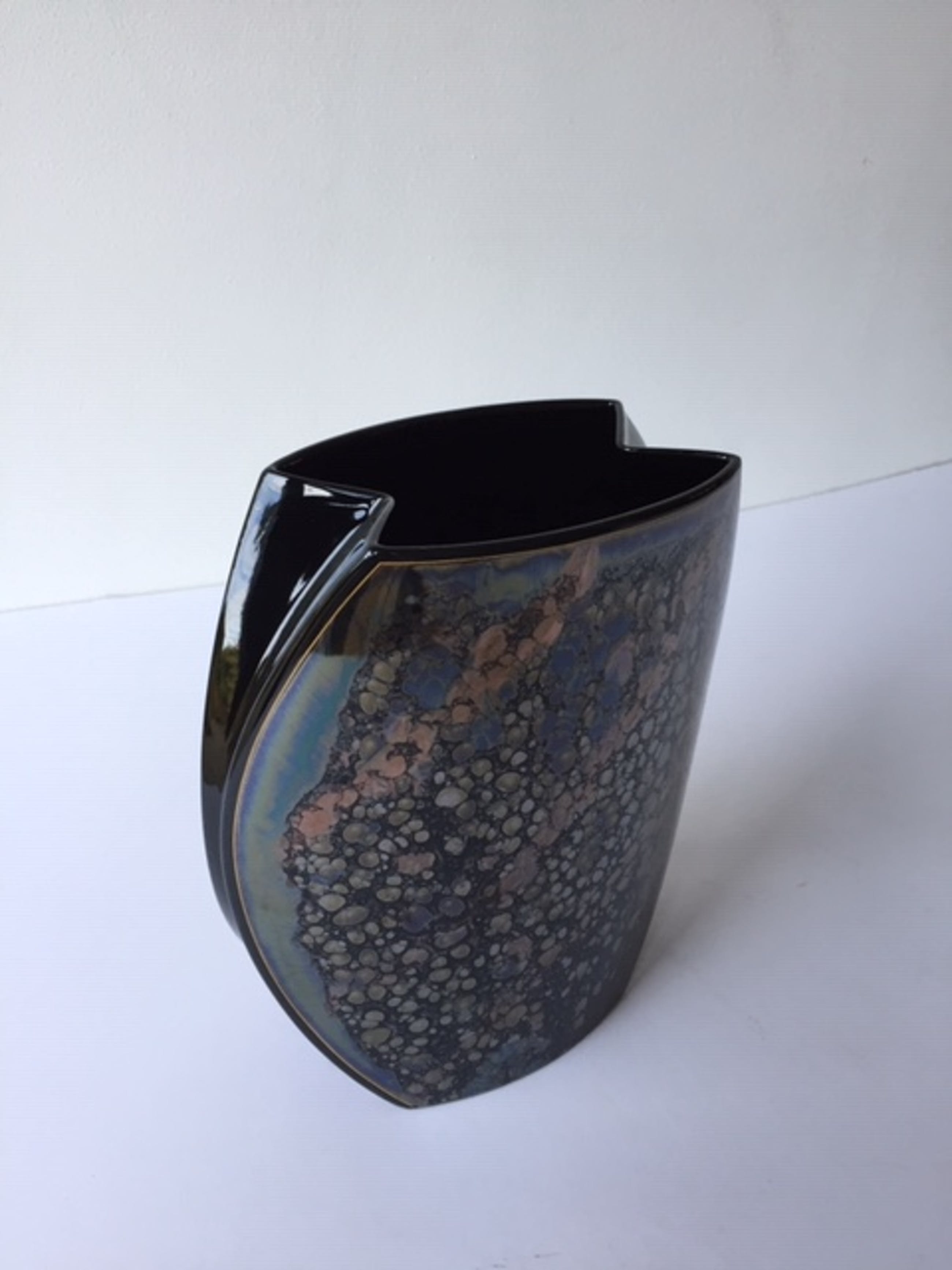 Deze prachtige, zwarte Taurusvaas van Jan van der Vaart voor Rosenthal is handgeschilderd door Helmut Drexler (1927-2016), één van de beste en bekendste (porselein)schilders van Rosenthal. Dit is het Goldfeuermotief. Vaas is aan beide zijden beschilderd. De vaas is in uitstekende conditie: geen beschadigingen.