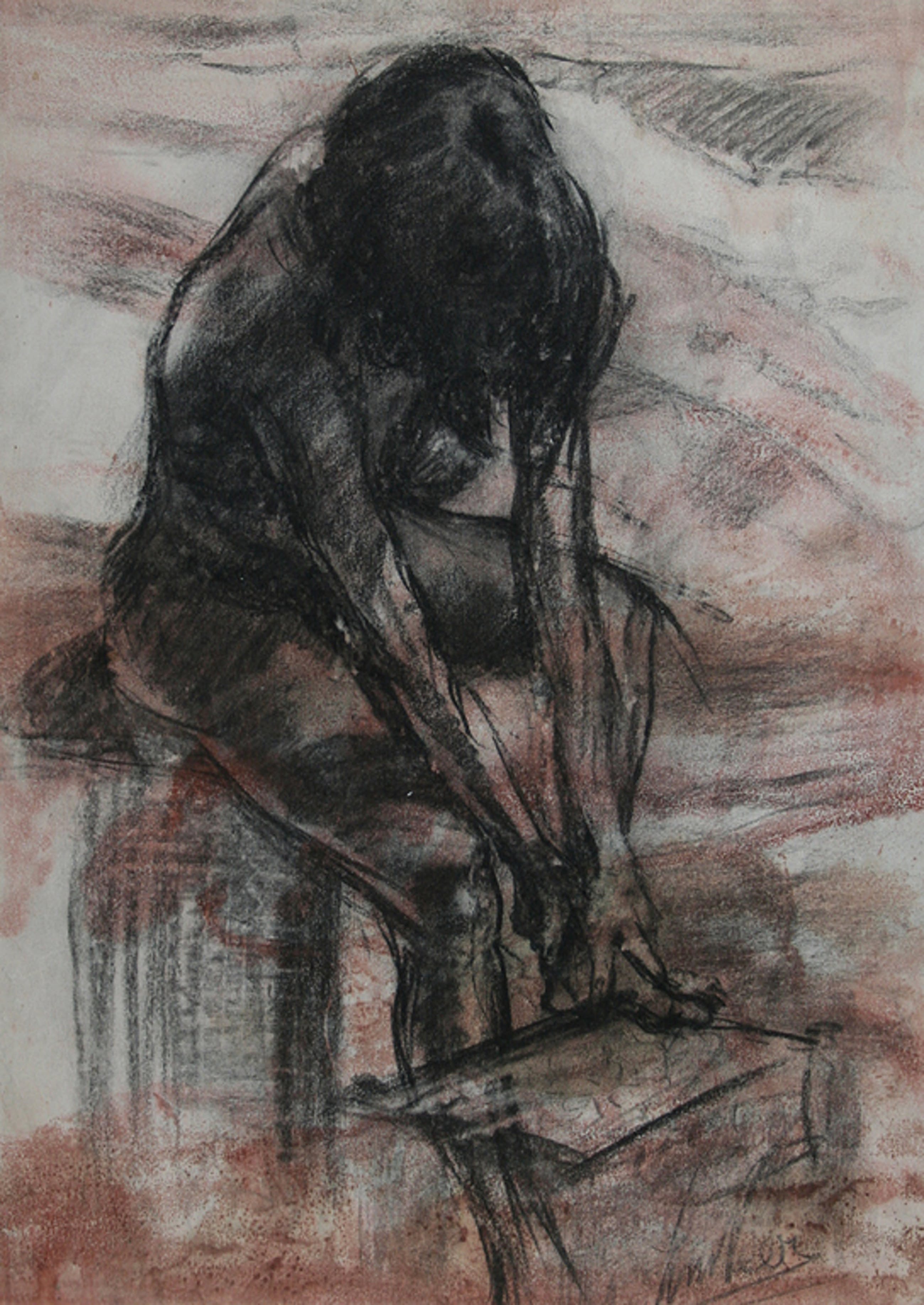 Tekening (o.a. houtskool ) op papier door de Haarlemmer Jan van de Veer. Afm. ca. 62 x 45 cm. Gesigneerd rechts onder. Van der Veer was lid van de kunstvereniging KZOD te Haarlem.