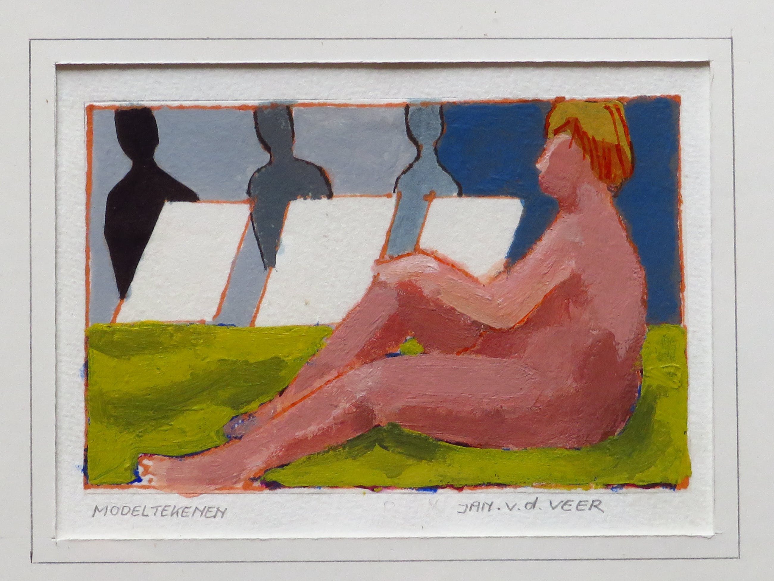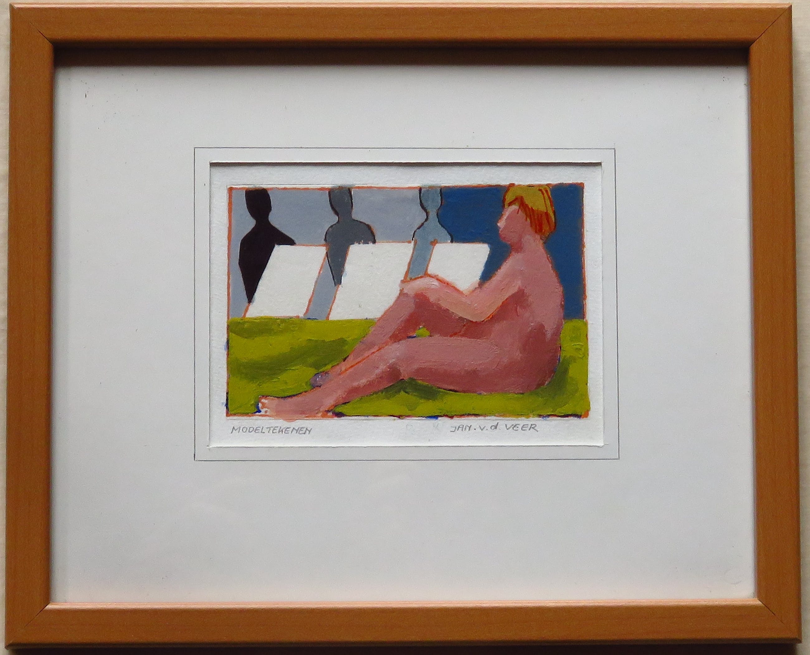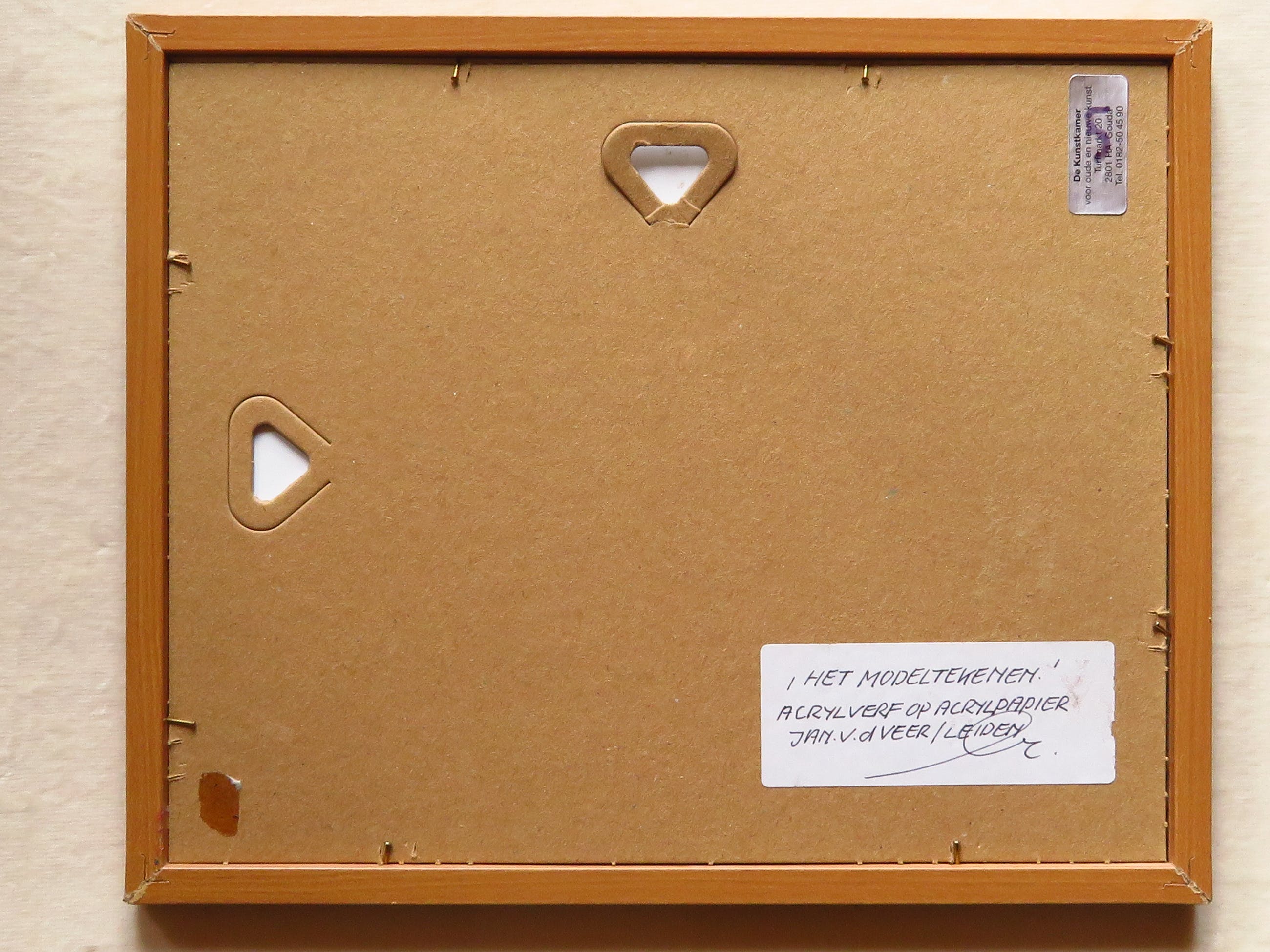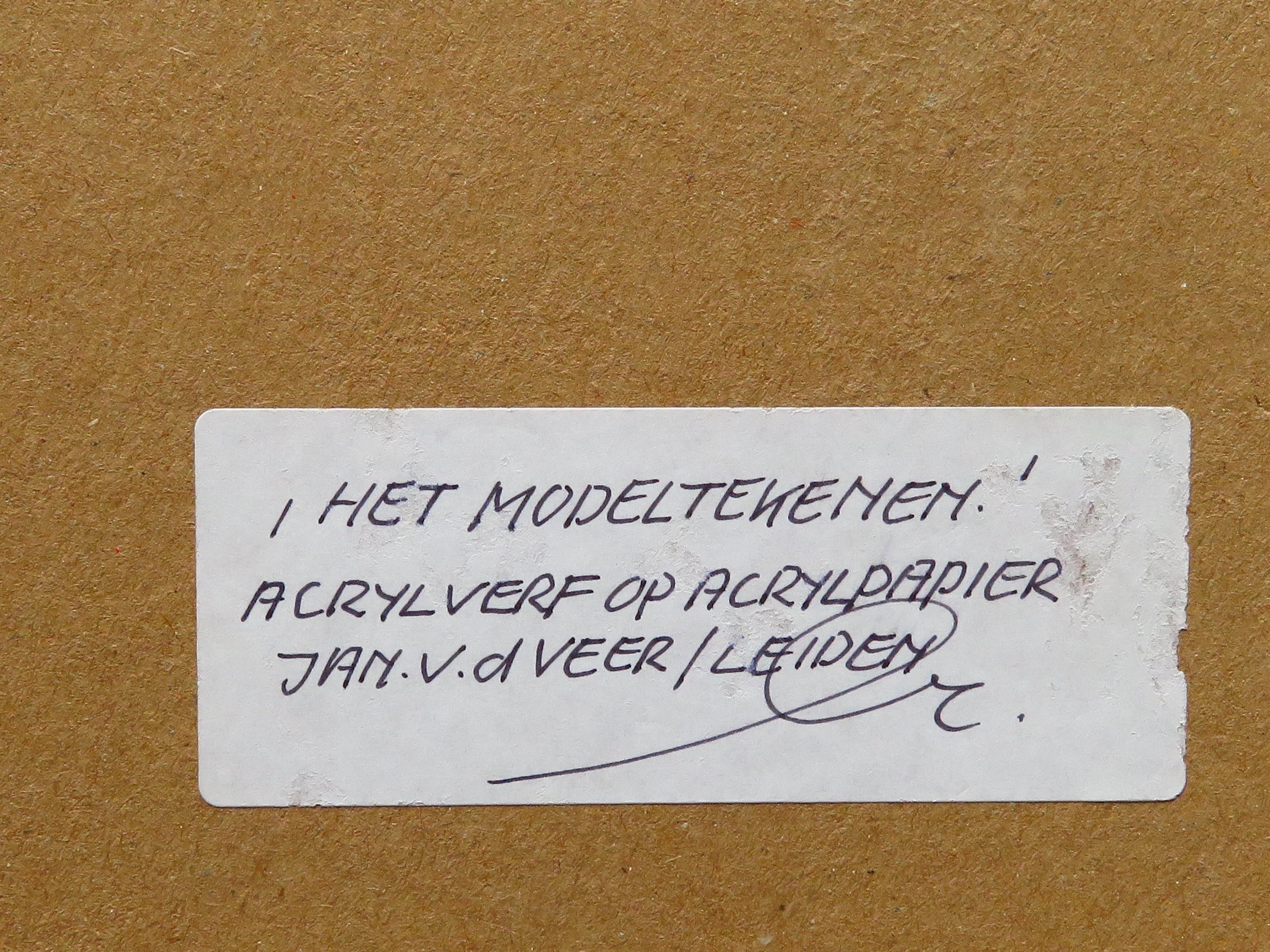 Gesigneerd: Jan v.d. Veer Titel: Modeltekenen (op achterzijde is de titel "Het Modeltekenen") Techniek: Acrylverf op acrylpapier