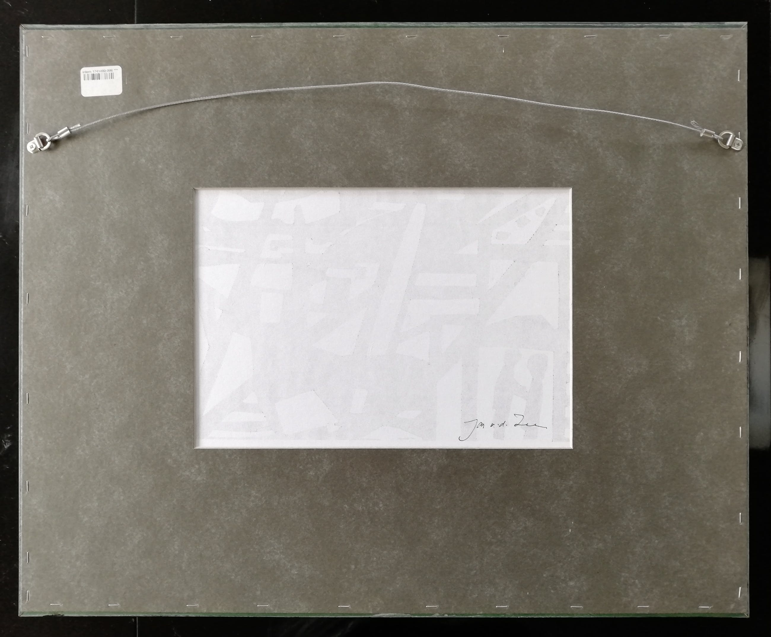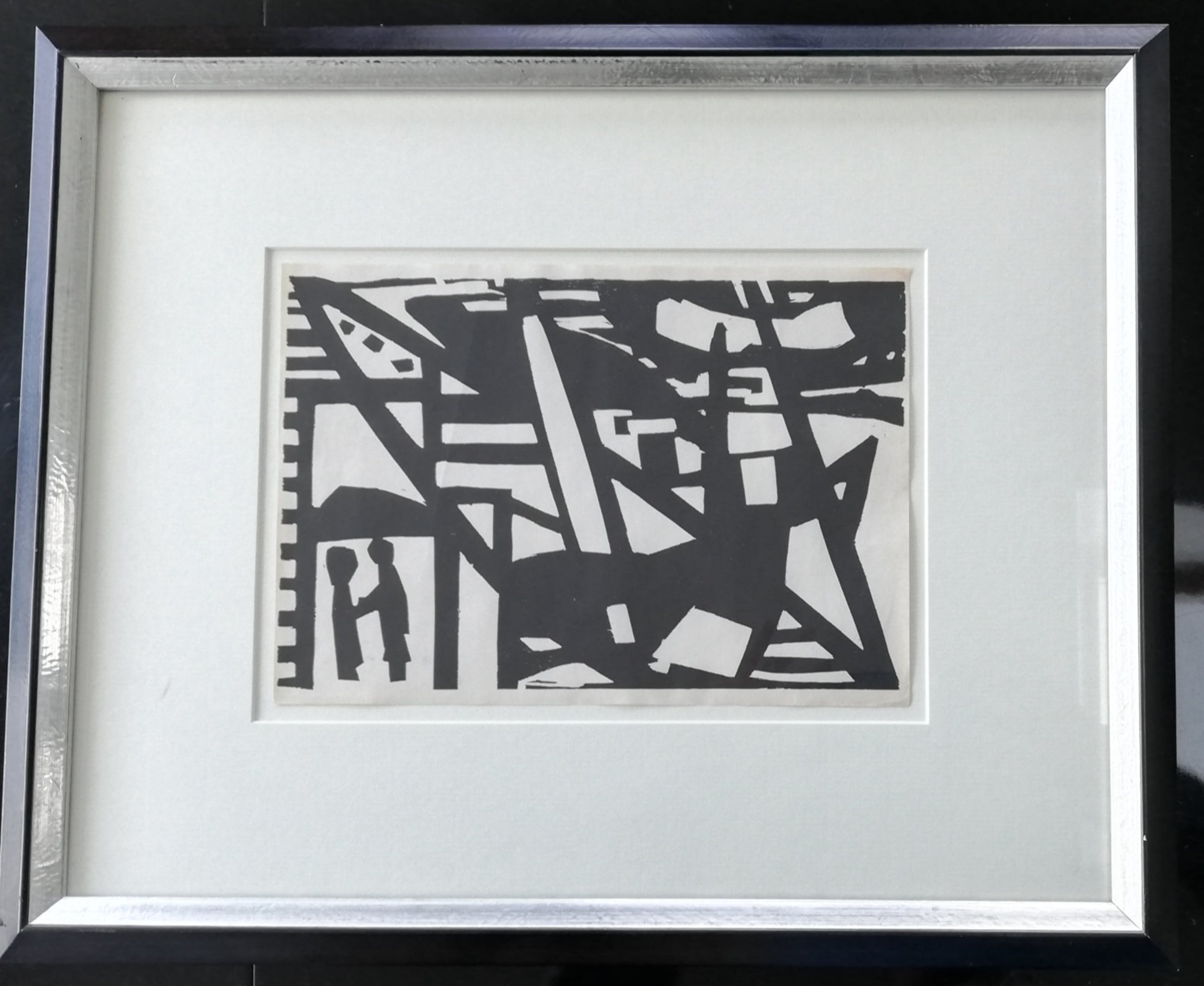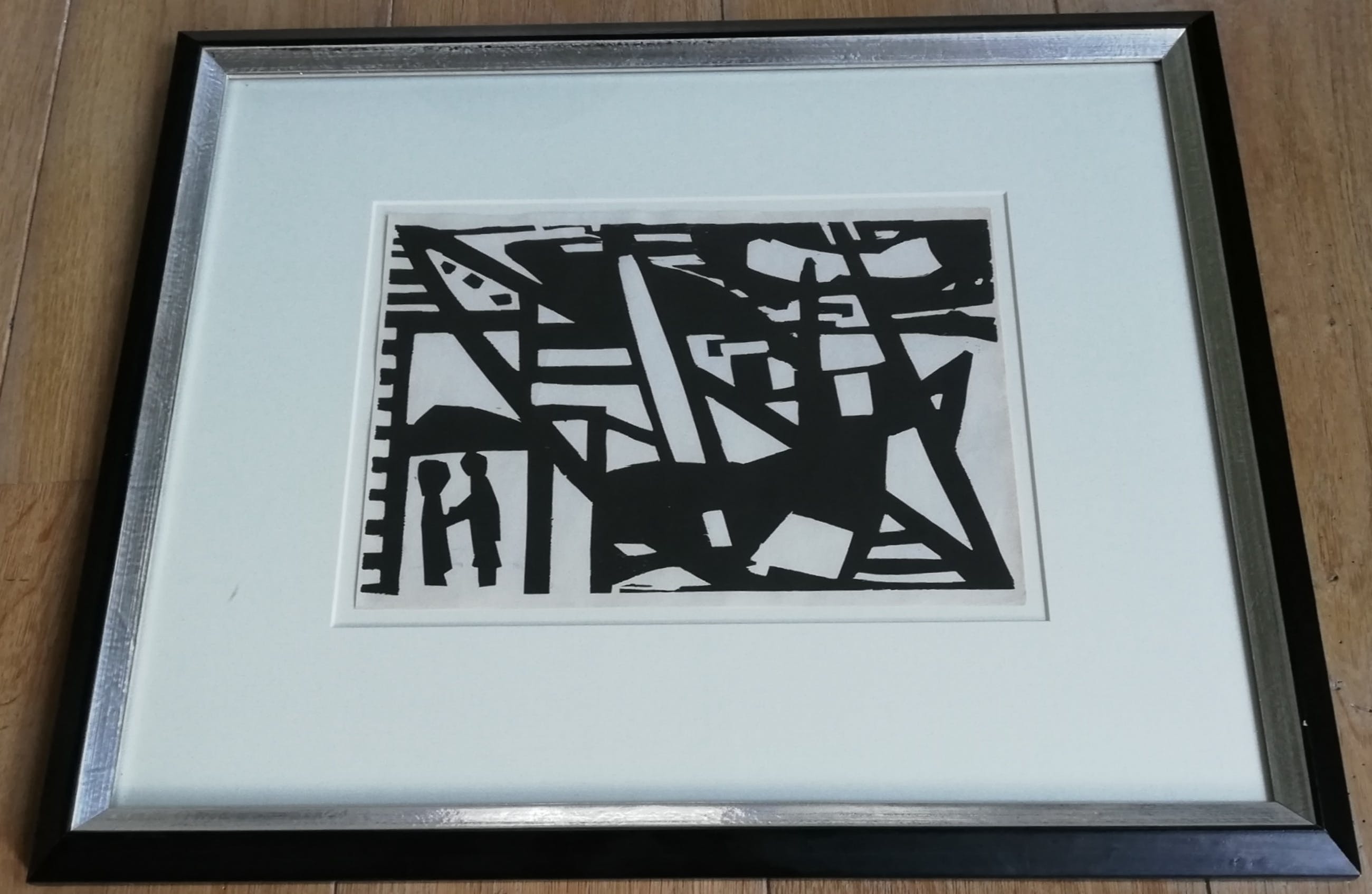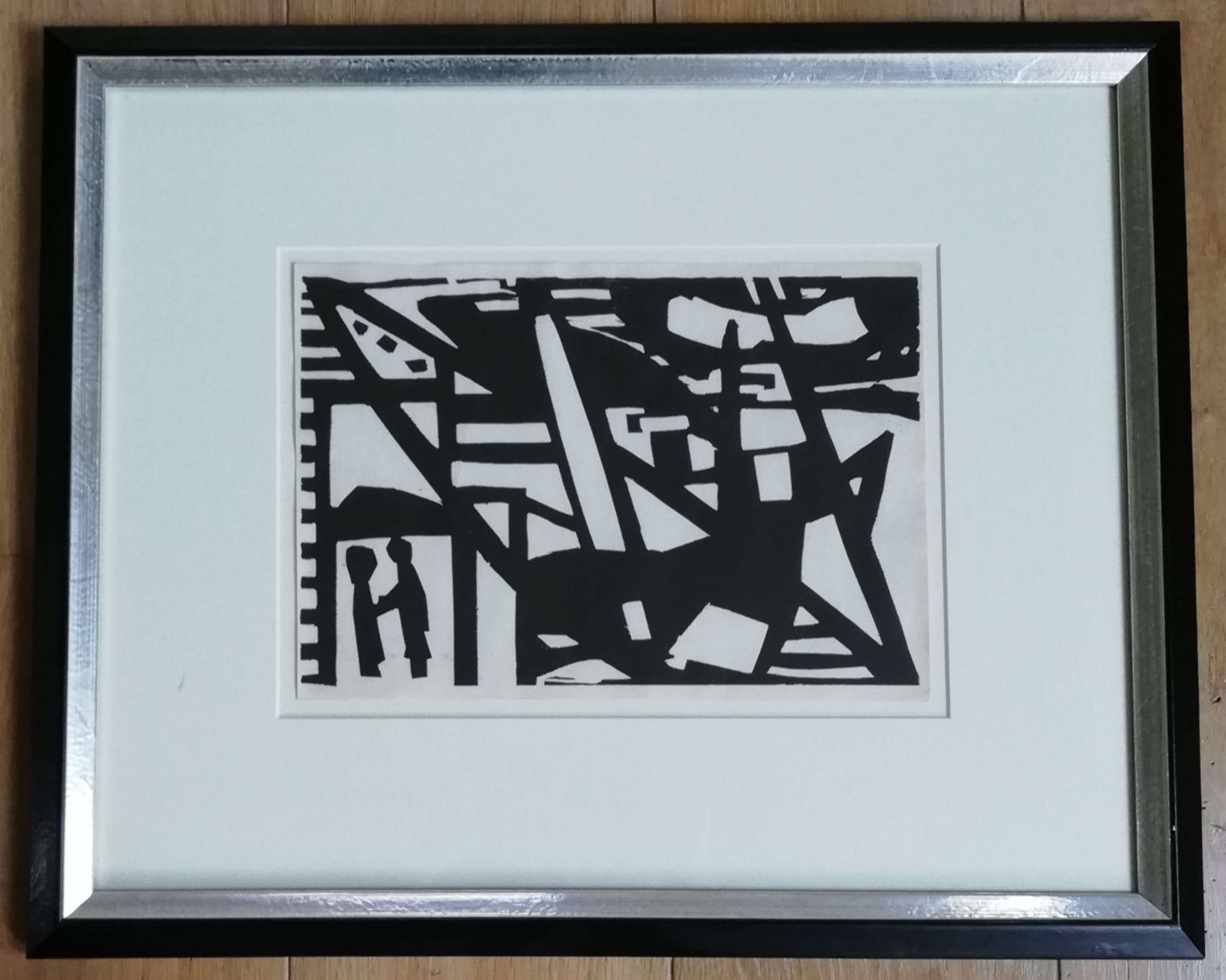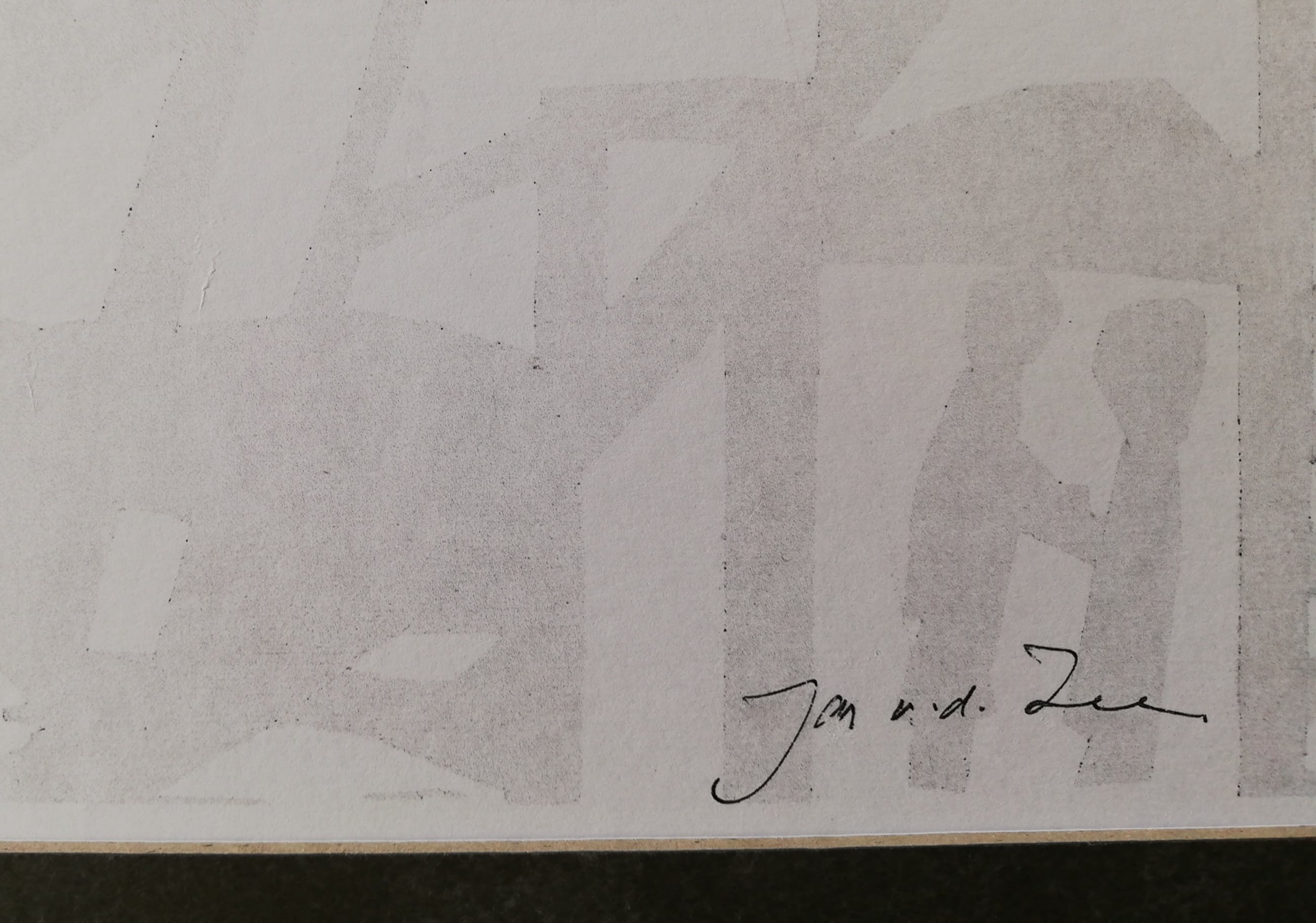 Abstracte houtsnede van Groninger Ploeg kunstenaar Jan van der Zee in zwart wit. Handgesigneerd op de achterzijde. In mooie kwaliteitslijst. Werk is niet verschenen in een genummerde oplage, derhalve schaars stuk.