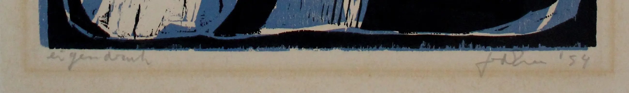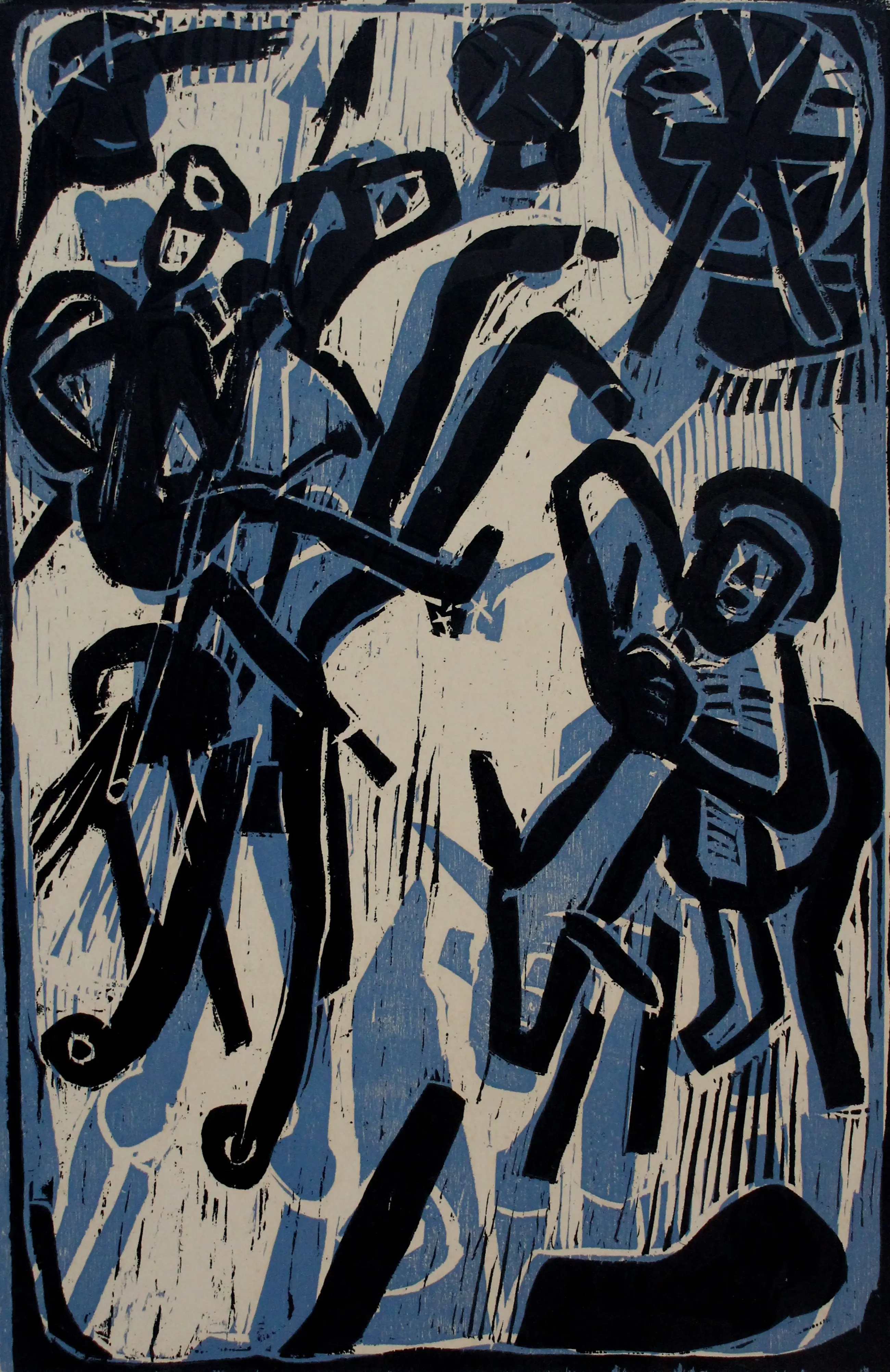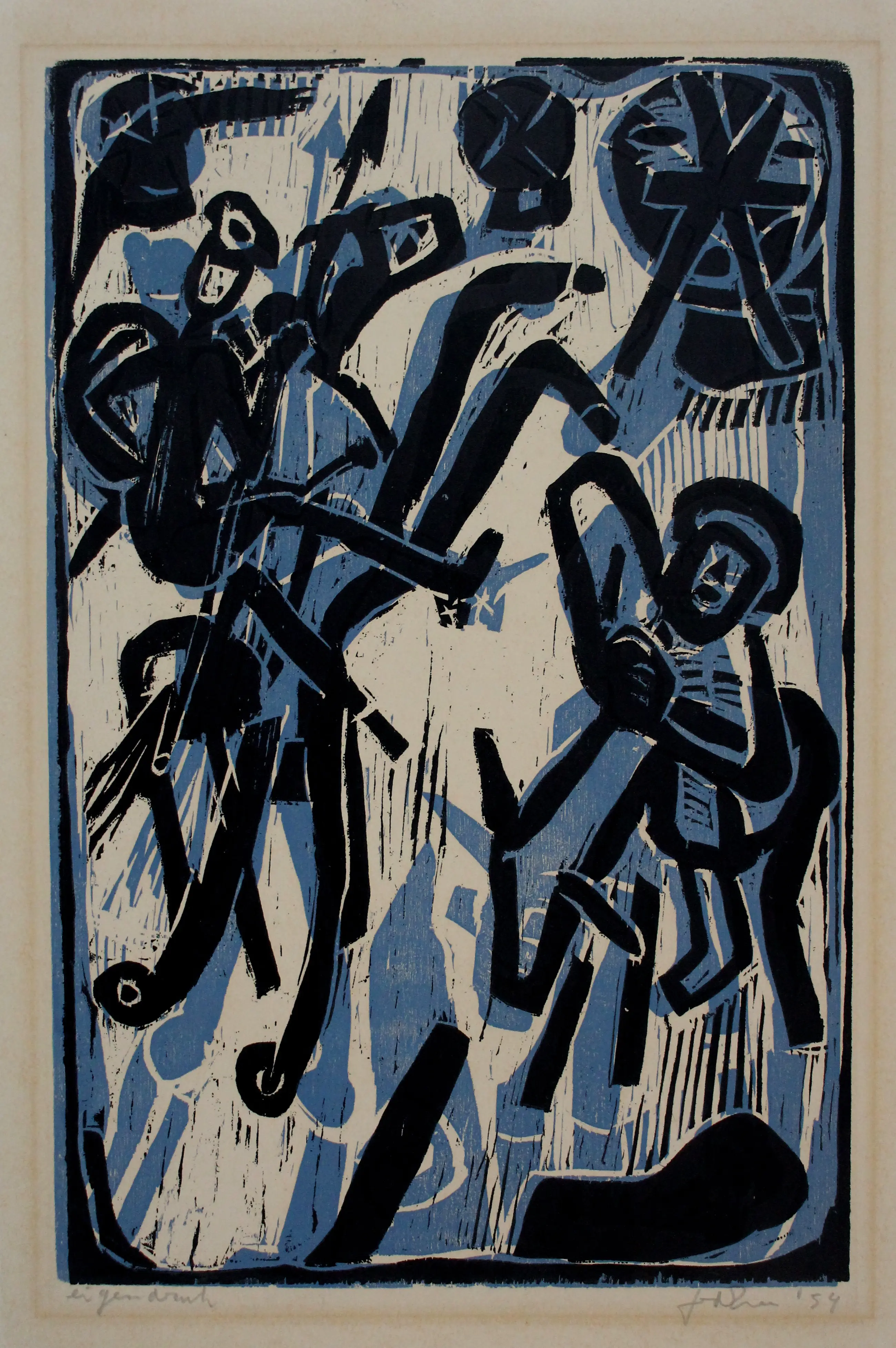 Houtsnede op papier van Jan van der Zee. Gedrukt in zwart en blauw. Titel: Ruiters. Jaar: 1954. Afmetingen blad incl passe-partout: H65 x b50cm. Afmetingen voorstelling: H39 x b25.5cm. Het werk is, rechts onderaan, gesigneerd en gedateerd door de kunstenaar. De authenticiteit van het aangeboden werk wordt volledig gegarandeerd. Een certificaat van echtheid kan, op aanvraag, worden gemaild.