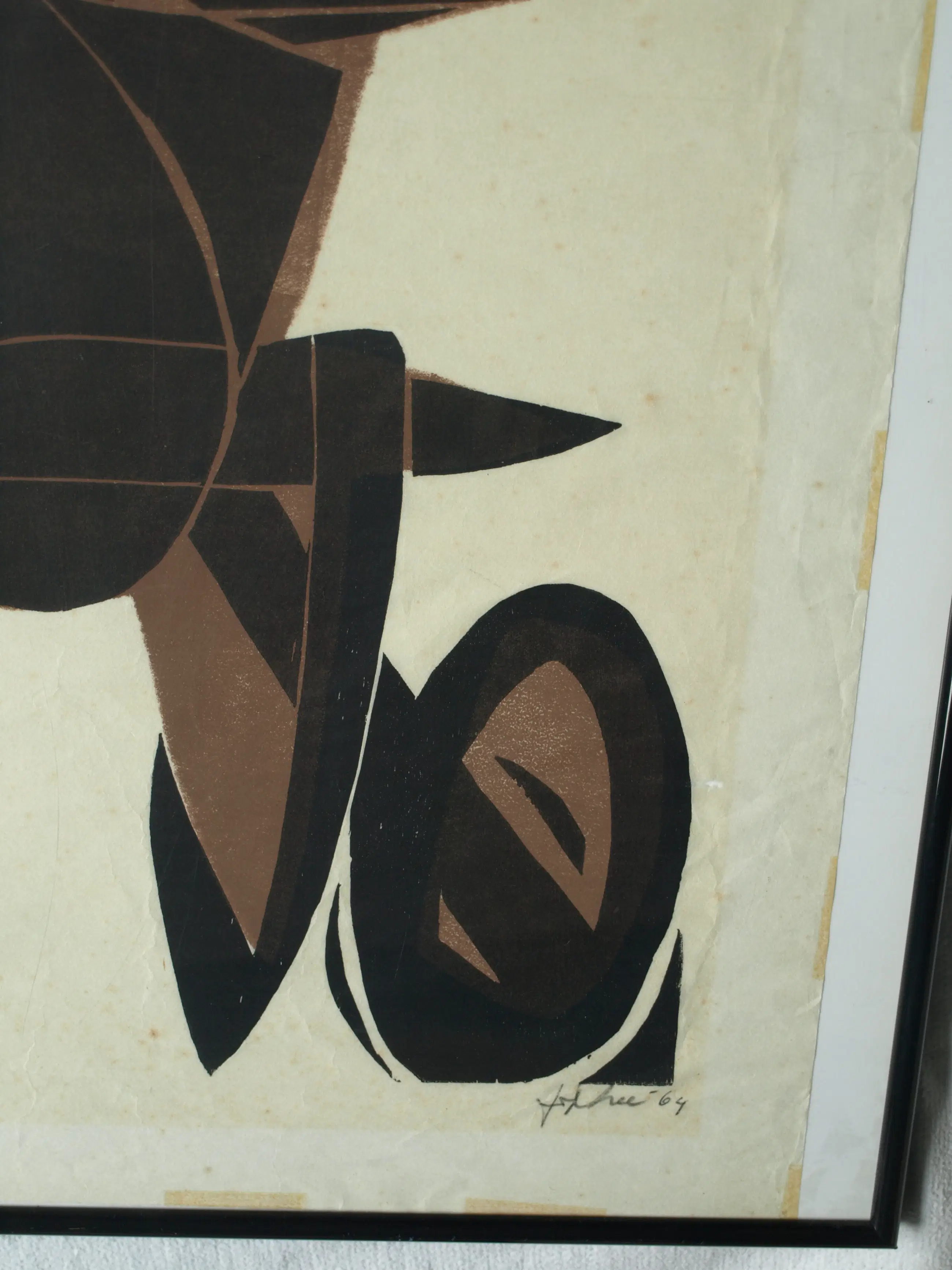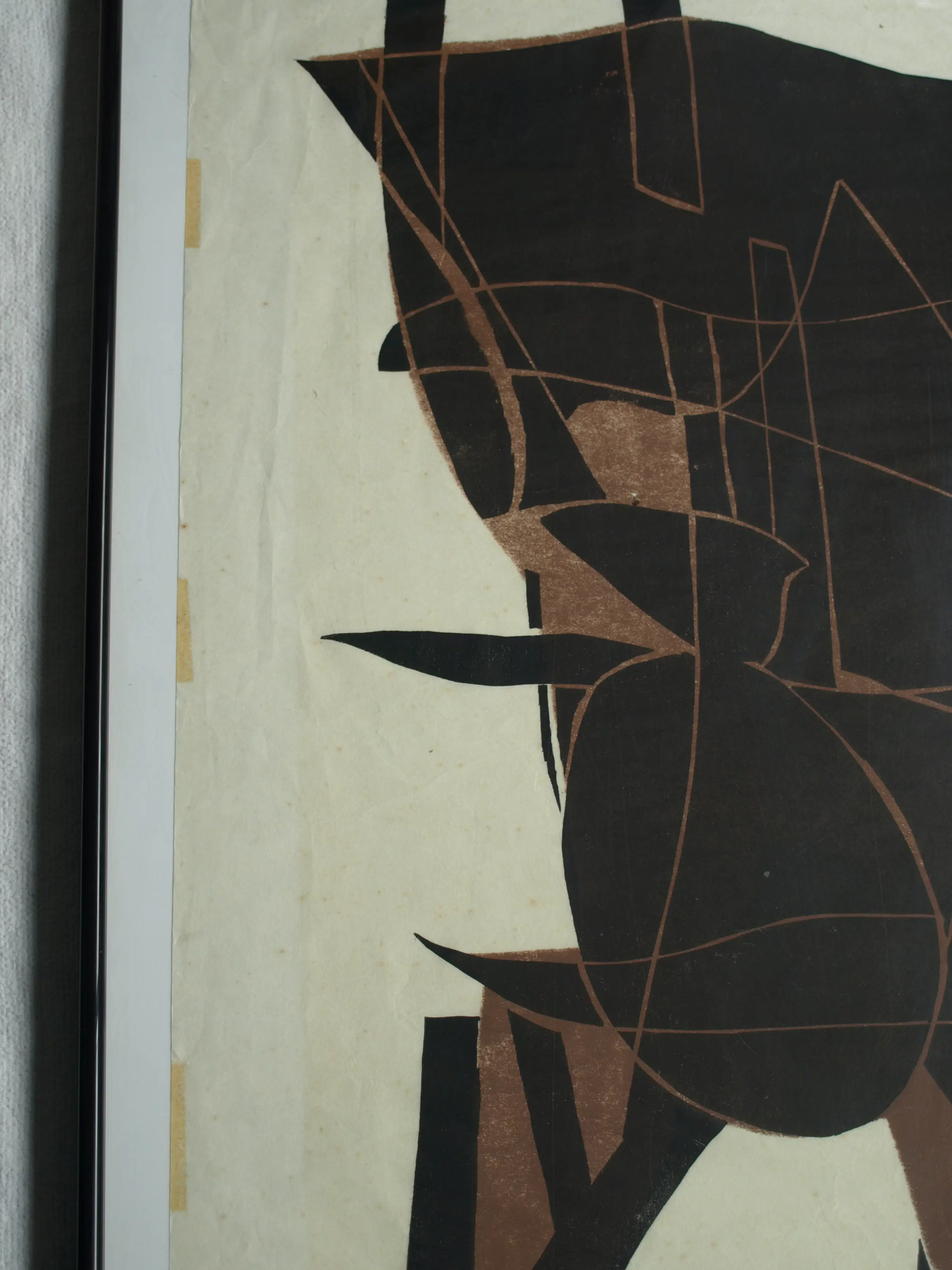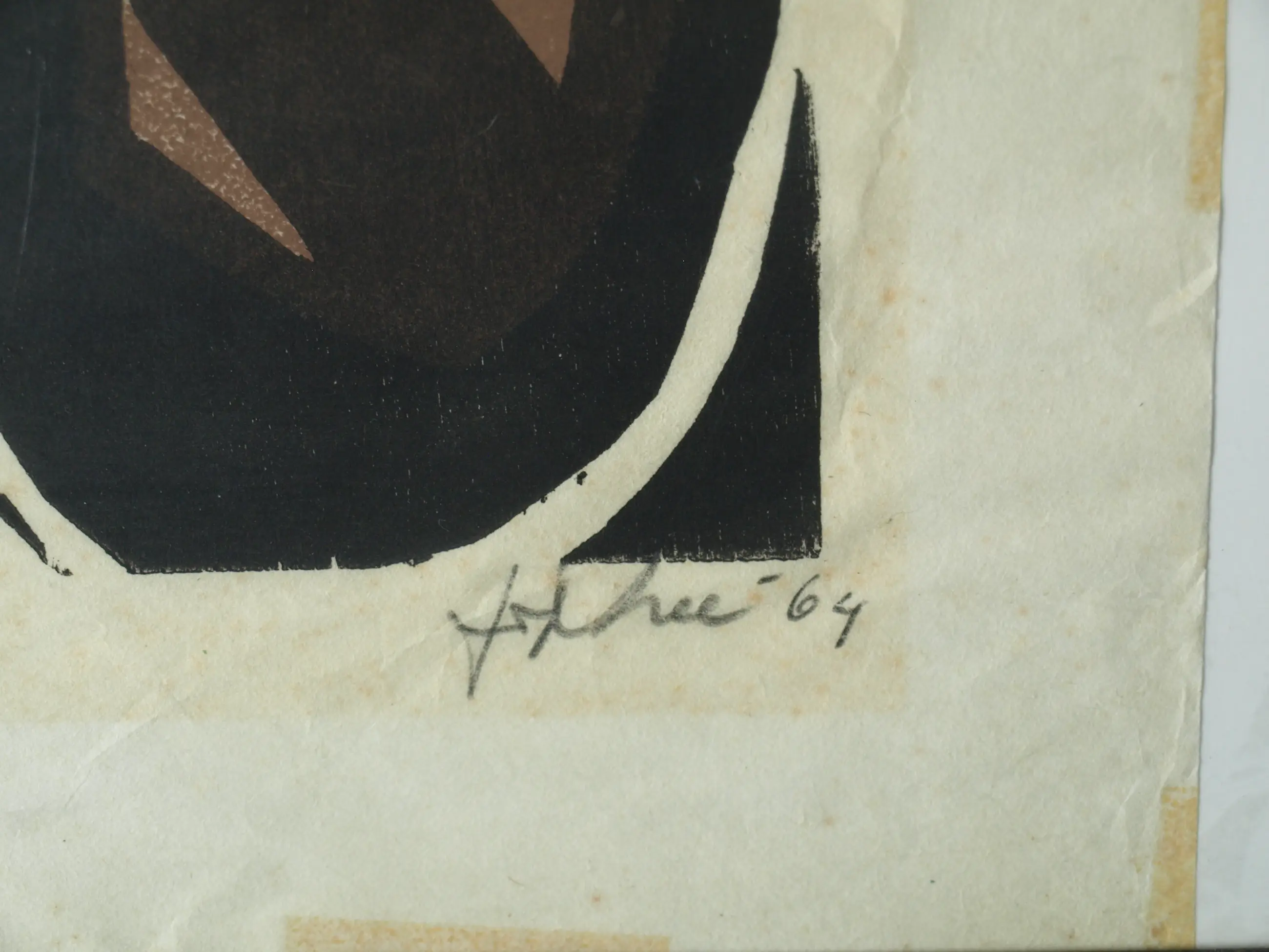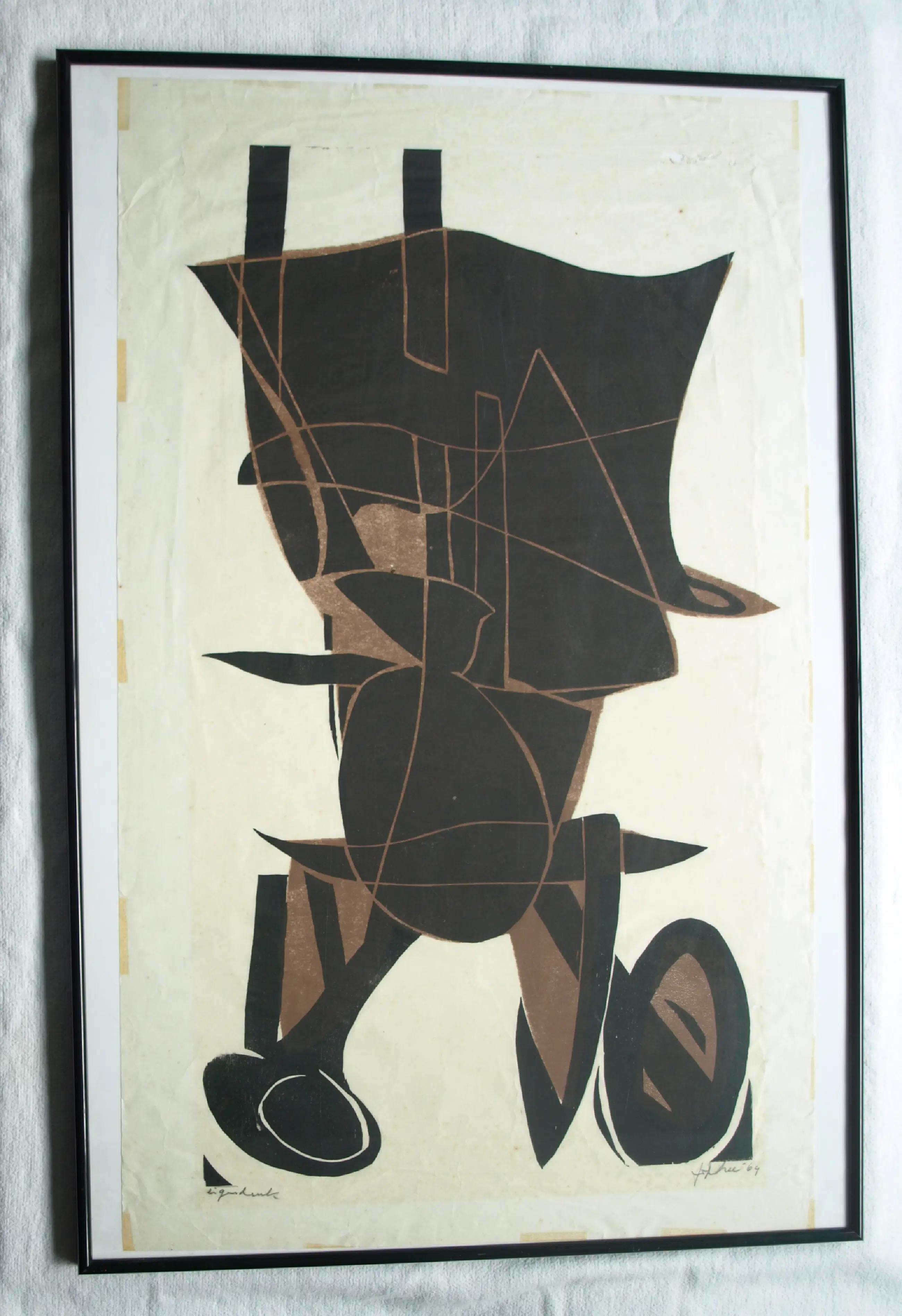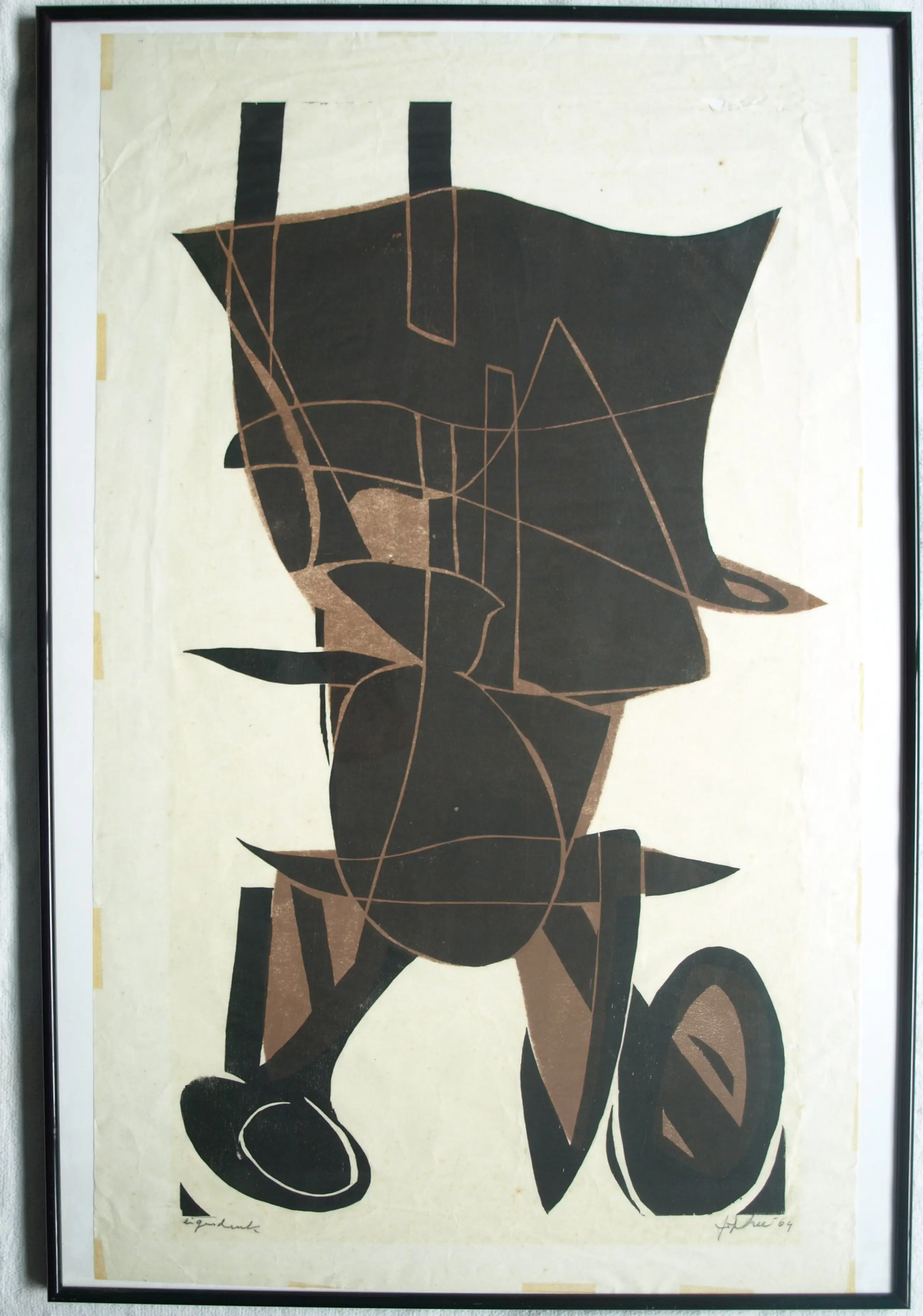 Een grote ingelijste houtsnede uit 1964 van de Nederlandse / Groningse kunstenaar Jan van der Zee (1898-1988). -Gesigneerd en gedateerd rechtsonder met potlood. Een eigen druk van de kunstenaar. -Ingelijst in een eenvoudige kunststof lijst met plexiglasplaat. -Afmetingen: Lijst, 92 x 62 x 2½ cm. Blad, 88½ x 54½ cm. -Herkomst: Uit een inboedel. -Conditie: In redelijke staat. Het papier heeft kreukjes, slijtplekjes, kleine gaatjes rechtsboven en tape-resten aan de randen. De lijst heeft slijtplekken. Zie ook alle foto’s voor een eigen indruk. Kan zo aan de muur.