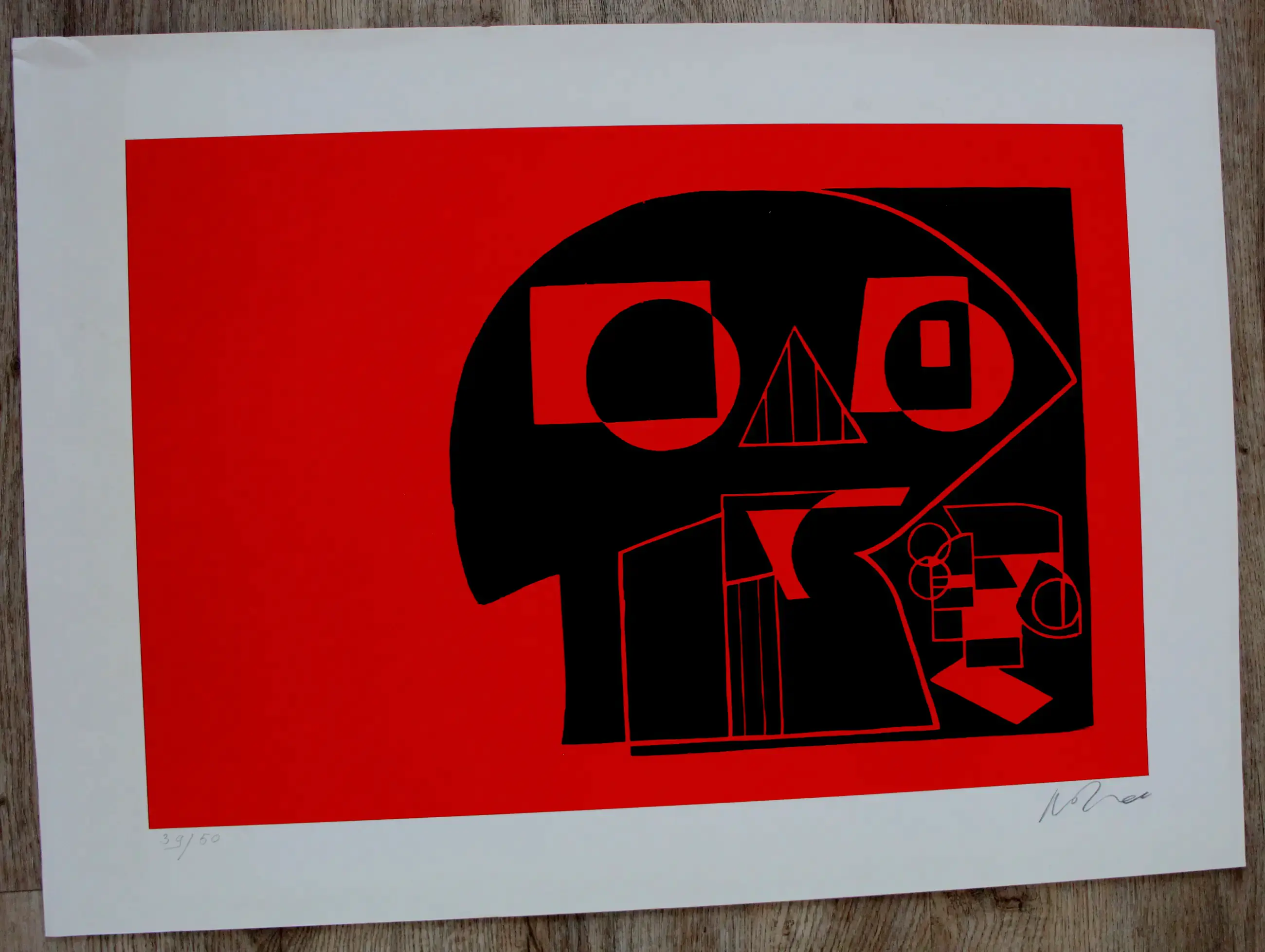 Linosnede op papier van Jan van der Zee. Gedrukt in zwart, op rode ondergrond. Titel: Schedel. Oplage: 39/50. Afmetingen blad: H52 x b72cm. Afmetingen voorstelling: H40 x b59.5cm. Het werk is, rechts onderaan met potlood, gesigneerd en gedateerd door de kunstenaar. De authenticiteit van het aangeboden werk wordt volledig gegarandeerd. Een certificaat van echtheid kan, op aanvraag, worden gemaild.