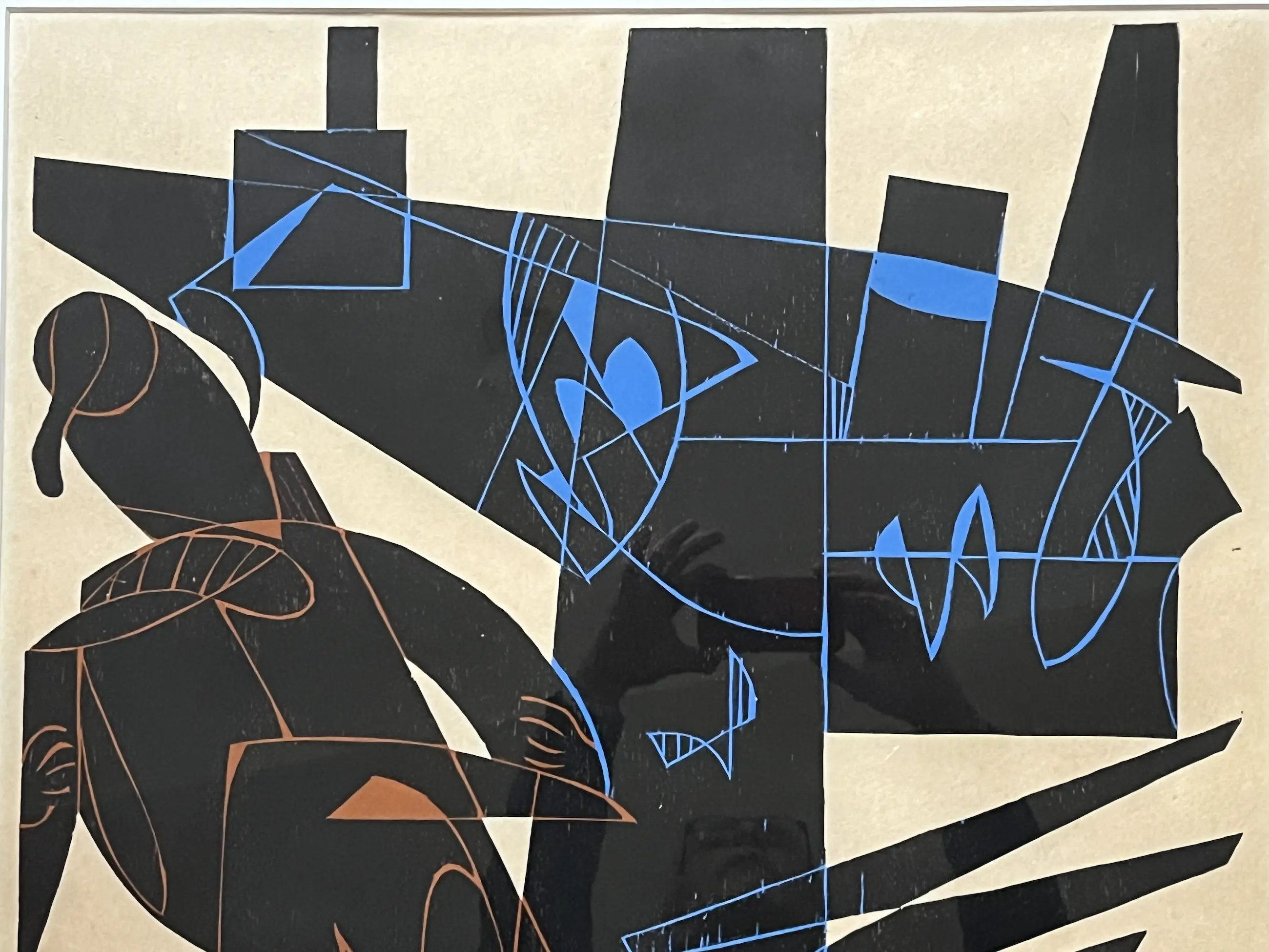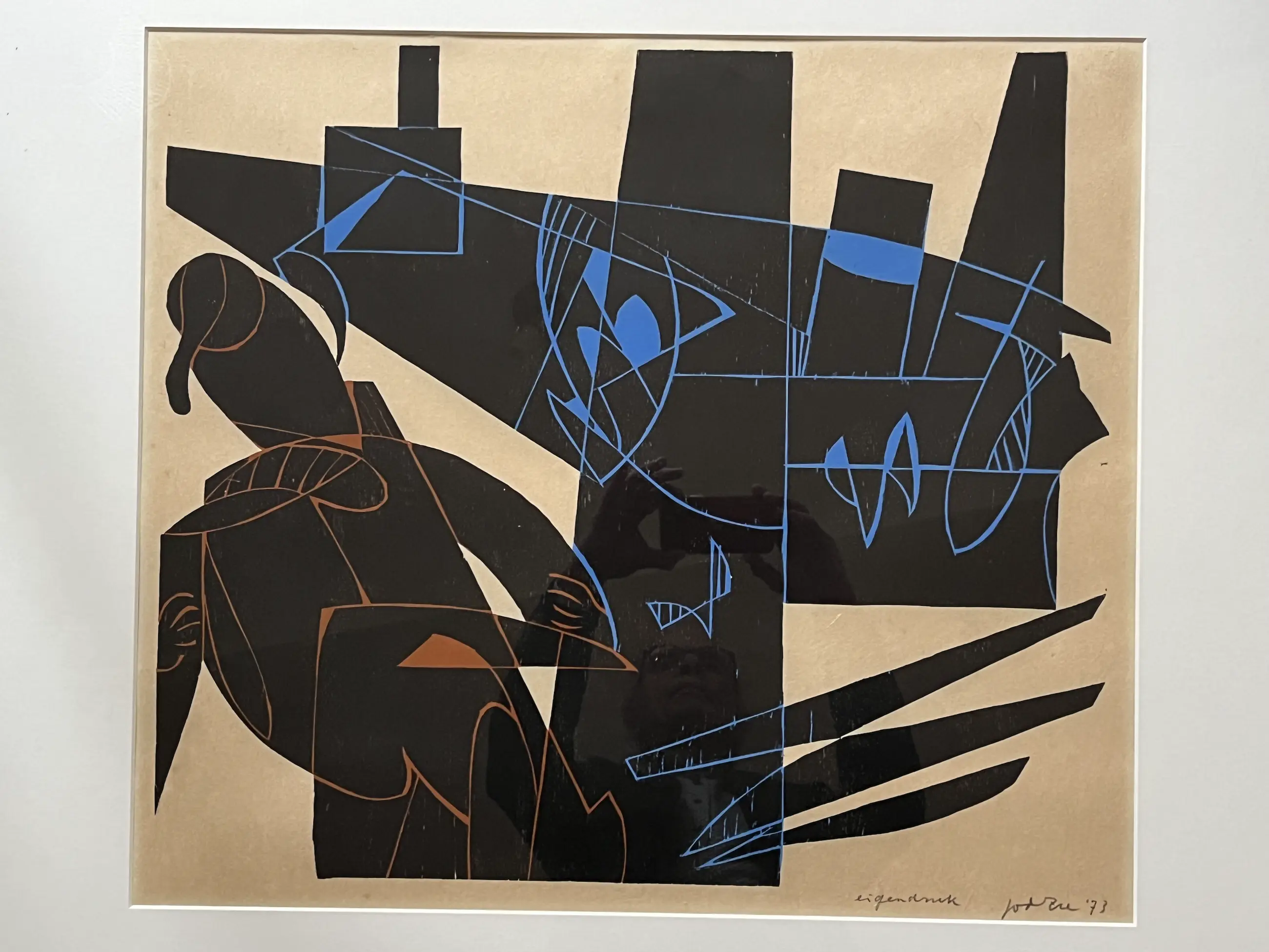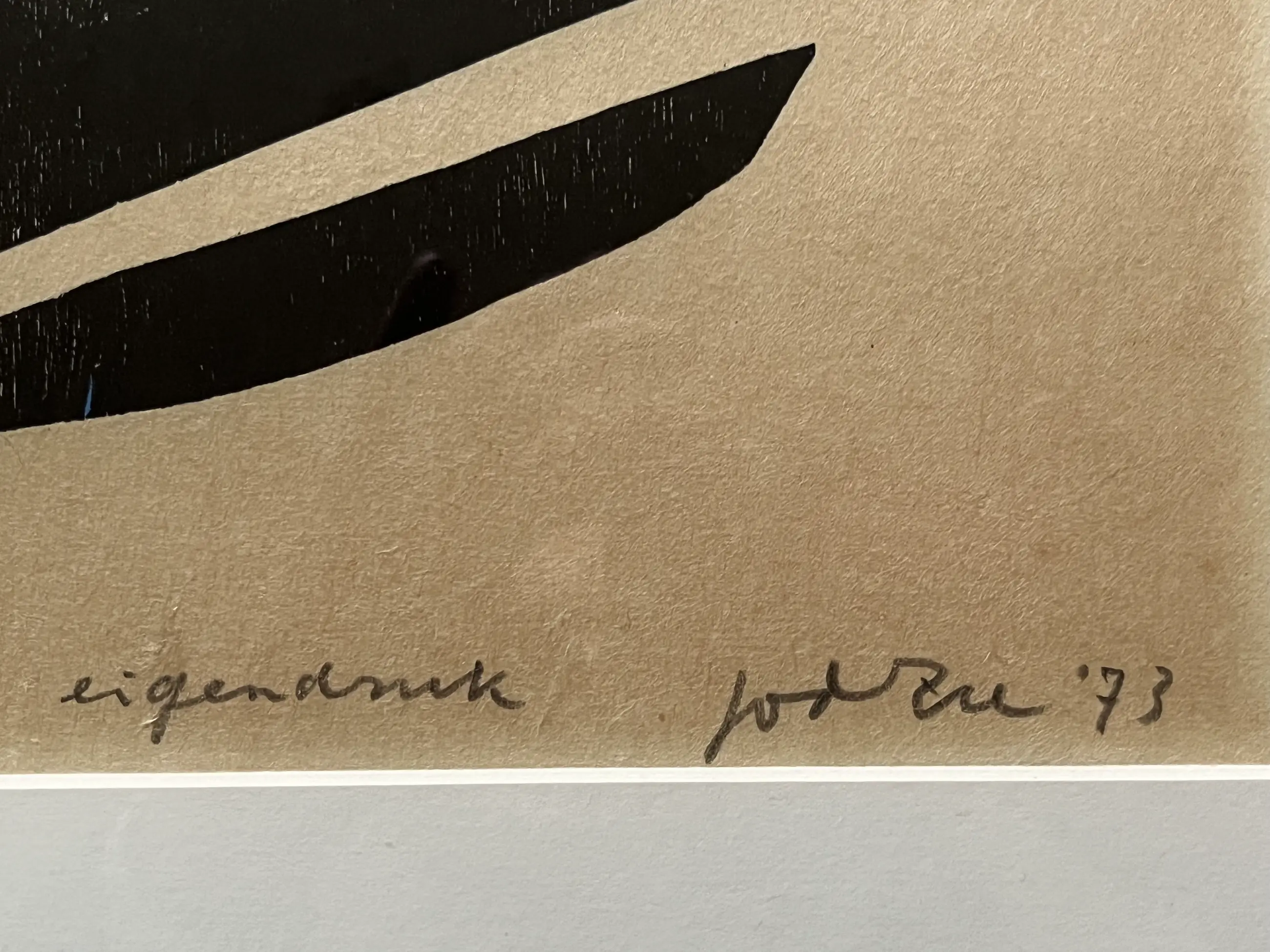 Fraaie houtsnede uit 1973. Uniek??? Het blad lijkt wat verkleurd. Komt uit voormalige RABO collectie. Gelijst in witte aluminium wissellijst. Afmeting blad 51,5 x 59 cm. Inclusief lijst 71 x 81,5 cm.