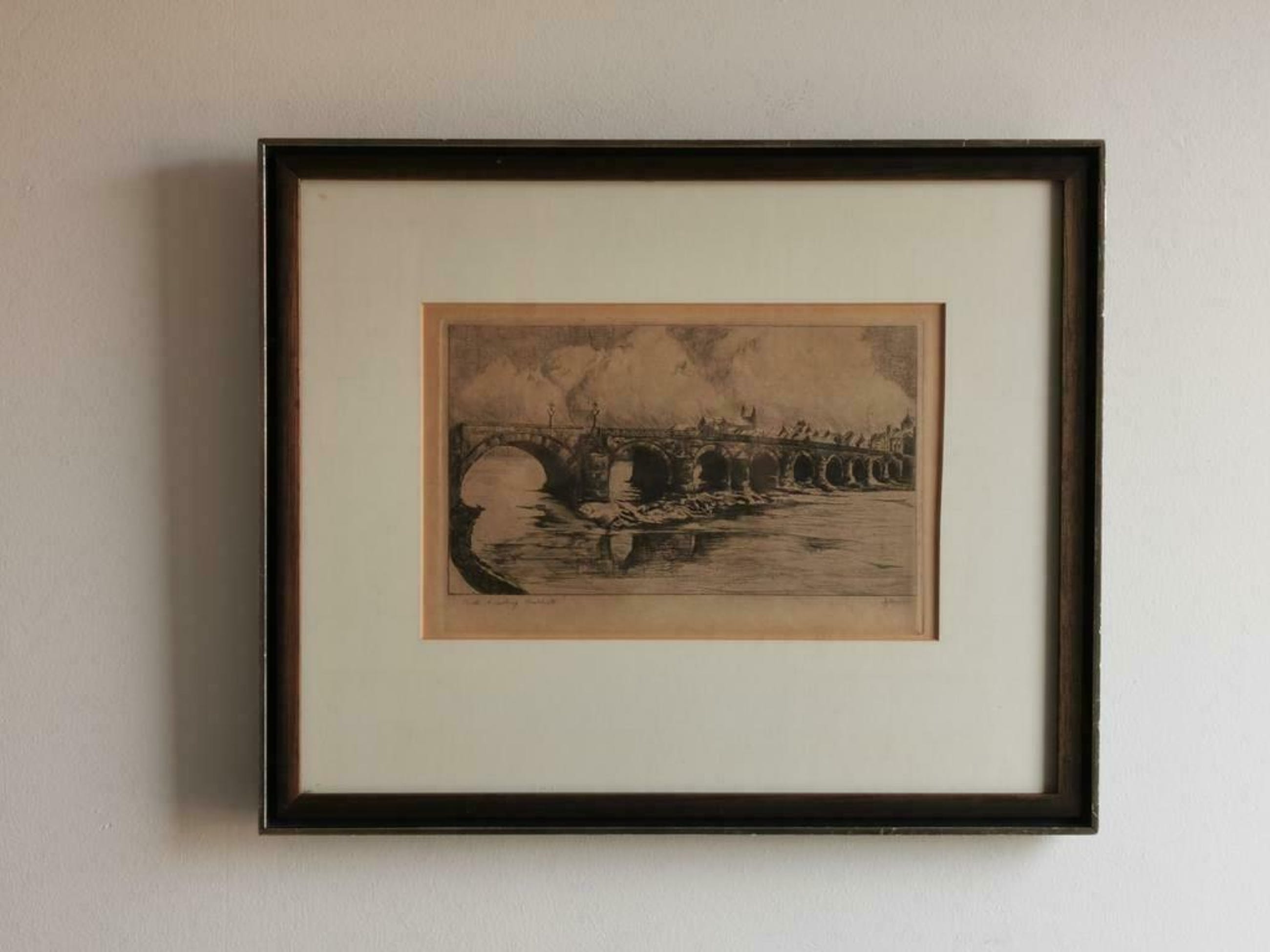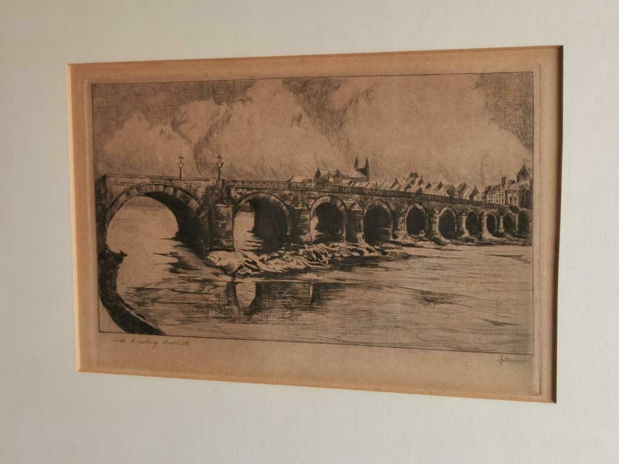 Ets Jan van Deursen (1886 - 1981) Lid Limburgse Kunstkring 1941 St. Servaasbrug Maastricht (vh. Oude Maasbrug) Beeld 17 x 26 Lijst 35 x 42 Professioneel ingelijst (door De Jong- Bergers) Verzenden binnen NL € 12,50