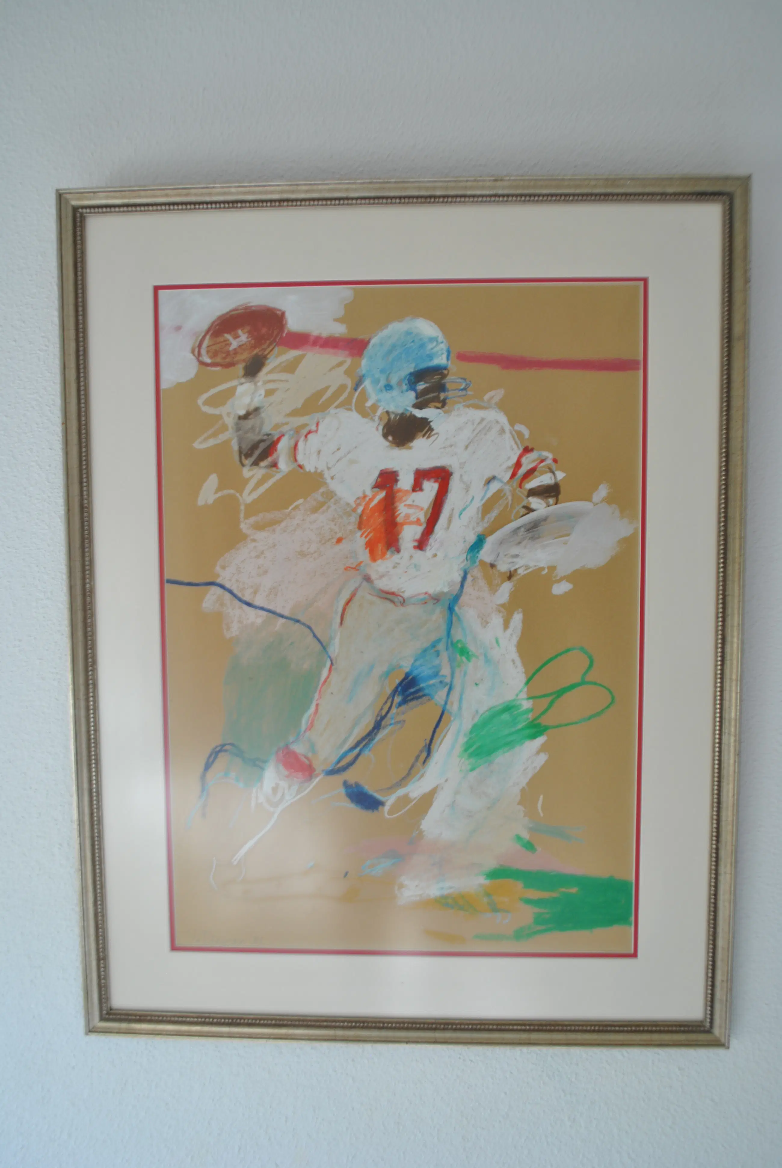 Olieacryl van Jan van Diemen uit 1981 van een Amerikaanse football speler. Links onderaan gesigneerd.