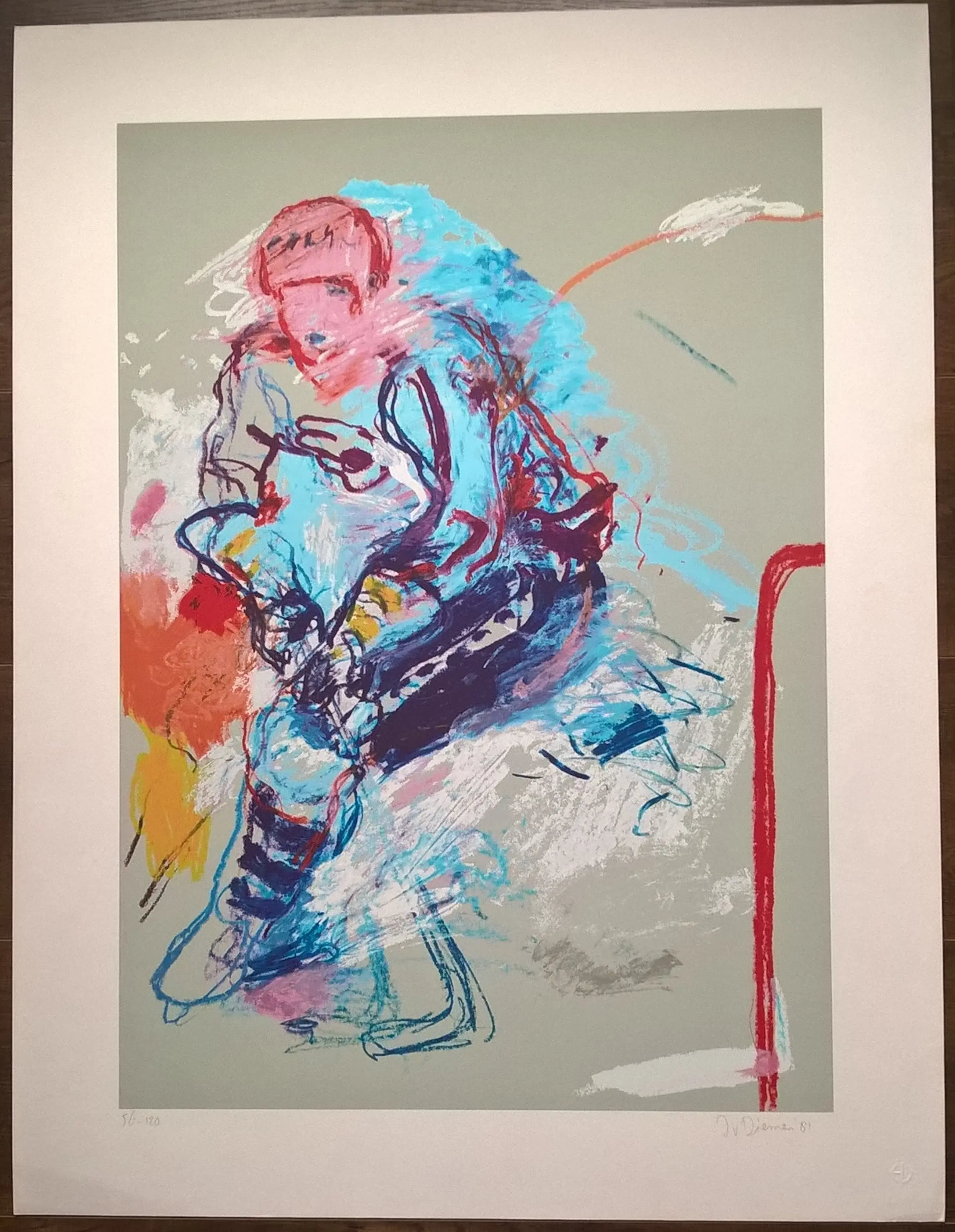 Gesigneerde zeefdruk van de kunstenaar Jan van Diemen (1954) uit 1981 gedrukt in een oplage van 120 stuks. Rechtsonder is het werk gesigneerd met J v Diemen en 81 Linksonder 56/120. Afmeting 85 x 65 cm. (hxb) In de witmarge zitten een aantal lichte vlekken en bij een aantal hoekjes zit een licht vouwtje. Verder is de zeefdruk is in goede conditie en is nooit ingelijst geweest.