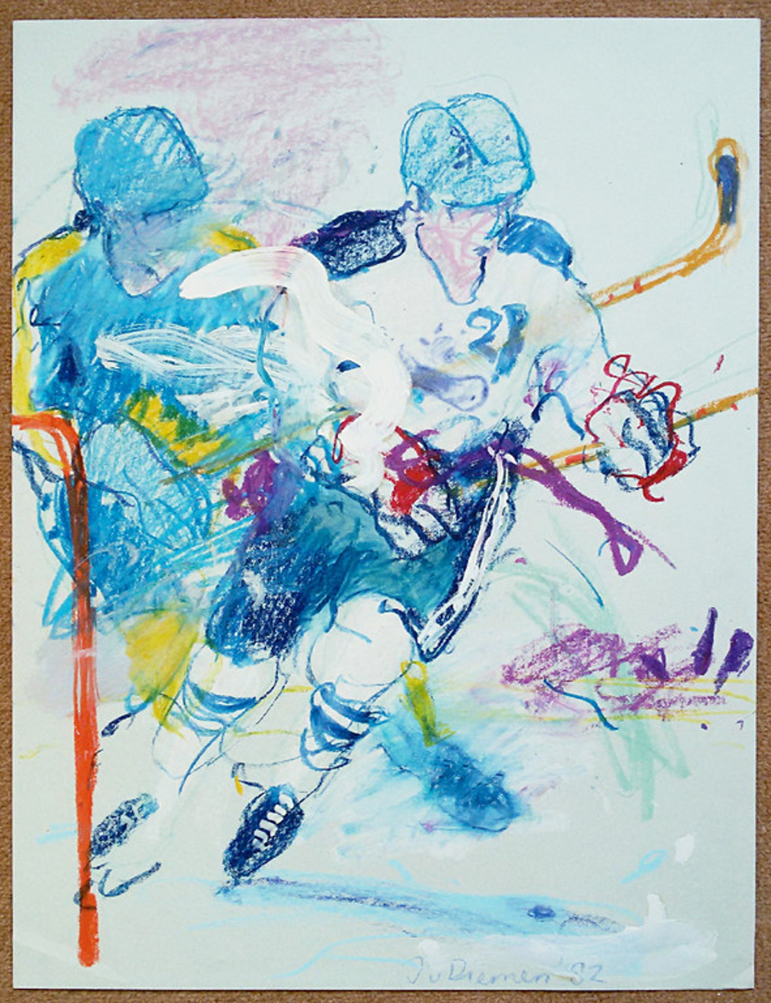 Uit een serie die Van Diemen maakte (waarschijnlijk) geinspireerd door de wereldkampioenschappen ijshockey in Finland destijds. De kleuren en de designs van de tenues doen vermoeden dat het om de wedstrijd Finland-Zweden (3-3) gaat (voor Finnen het equivalent van Nederland-Duitsland in het voetbal).