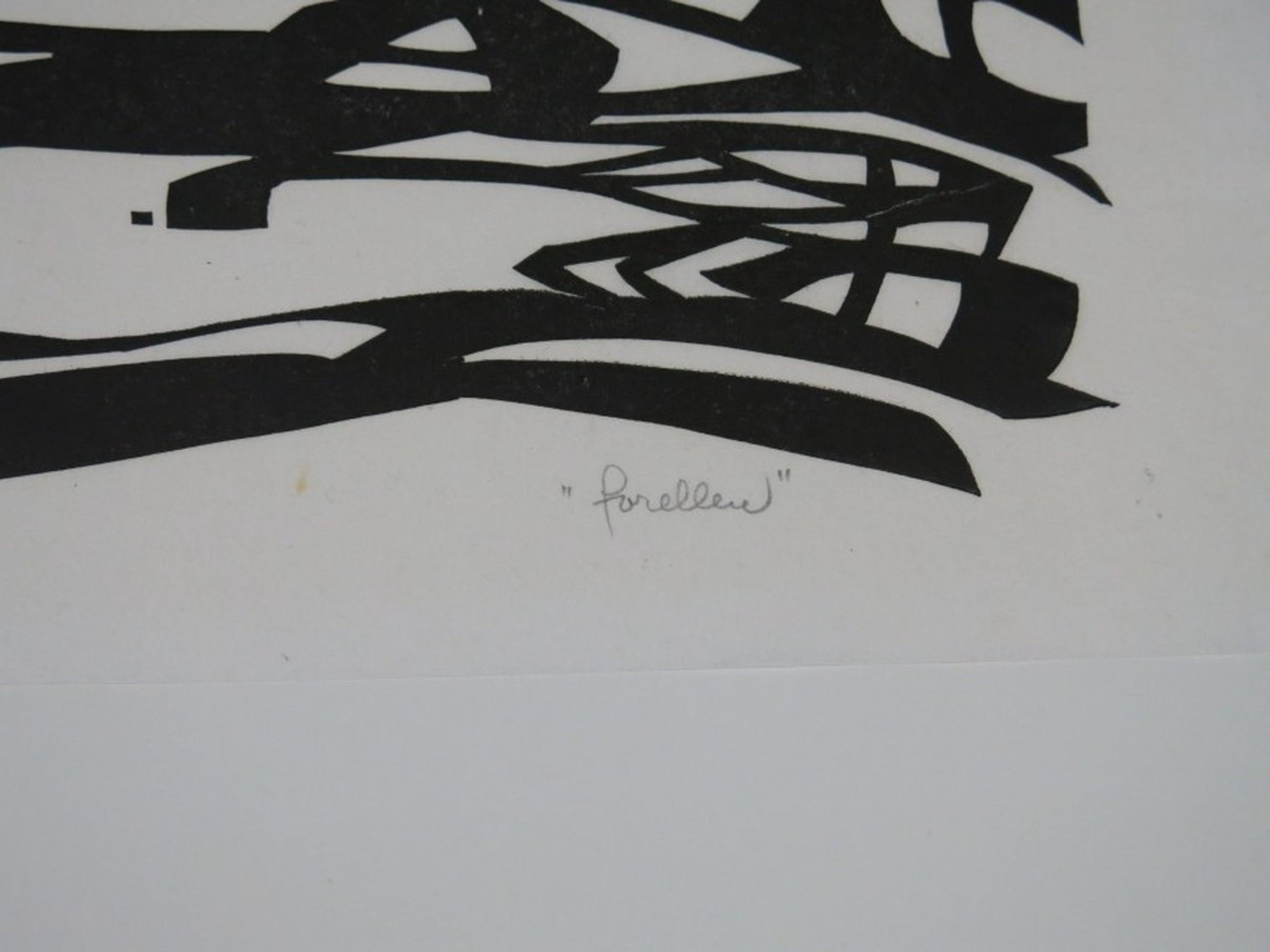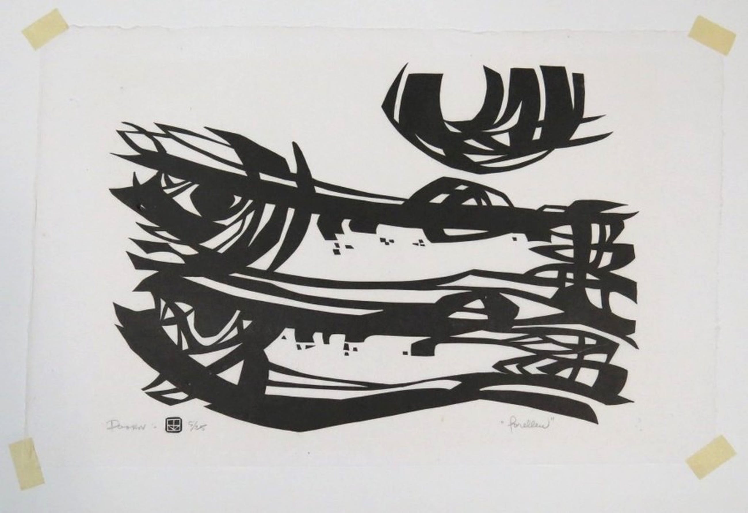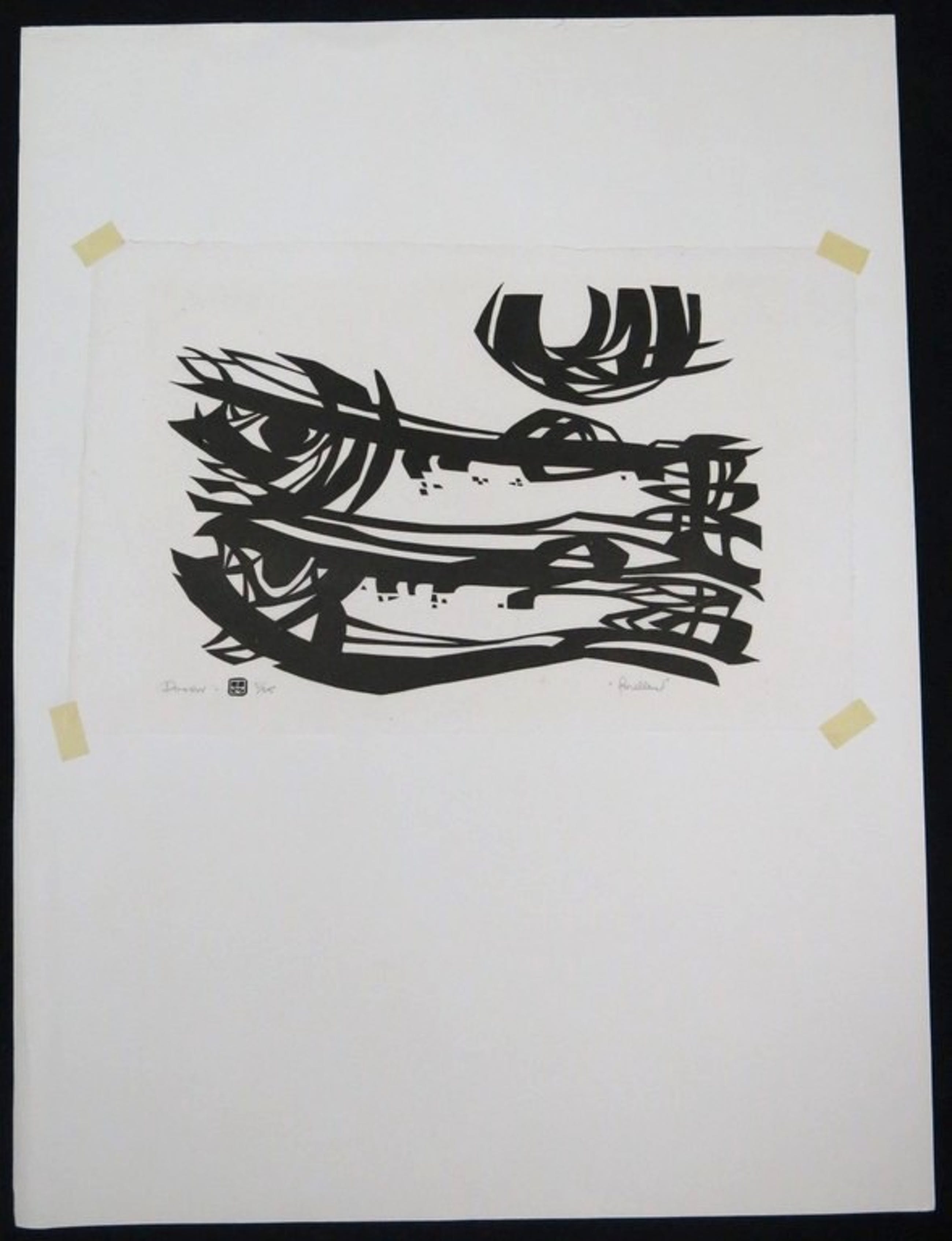 Materiaal: Linosnede op japans papier, bevestigd op onderblad met daaroverheen een passe-partout