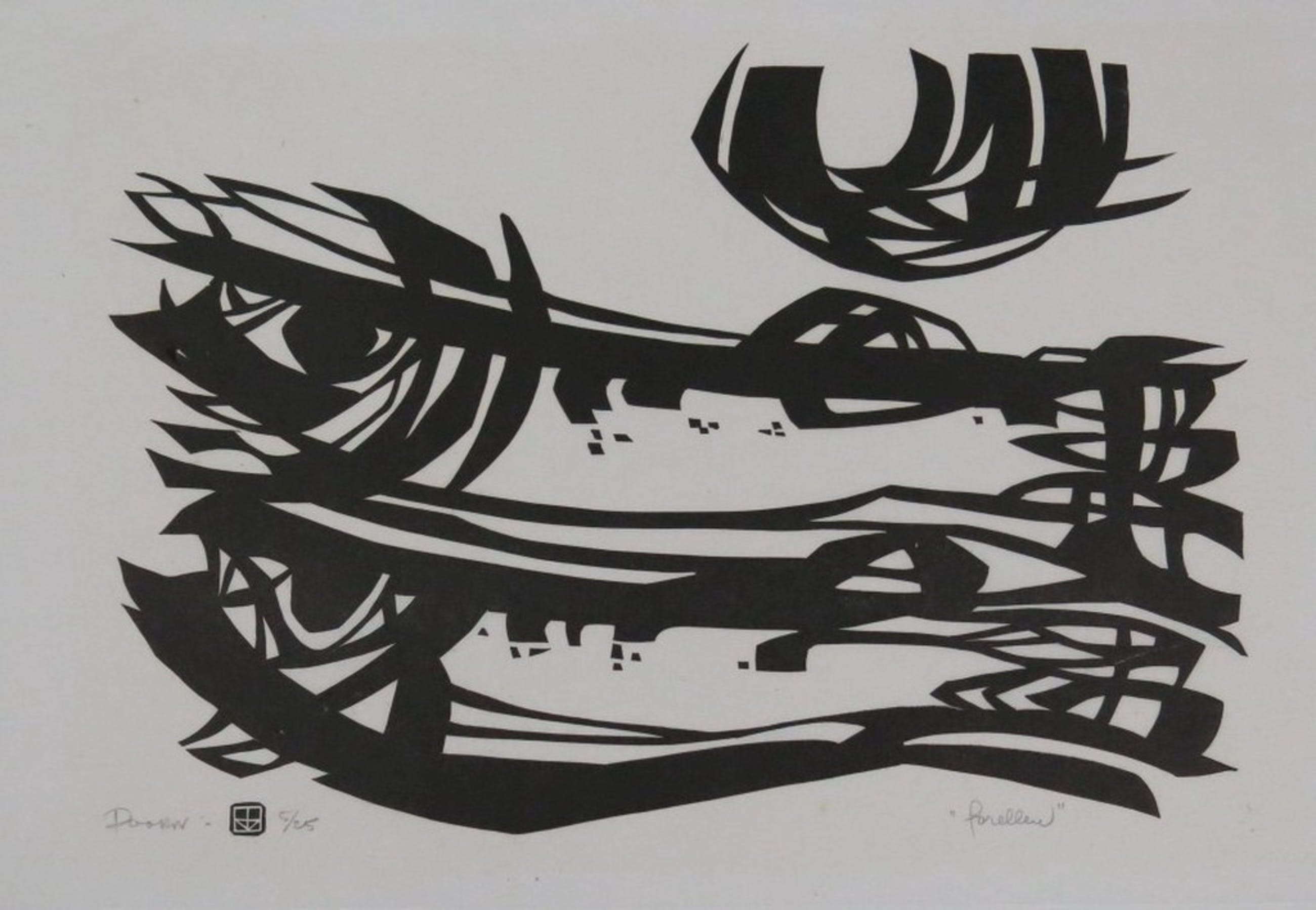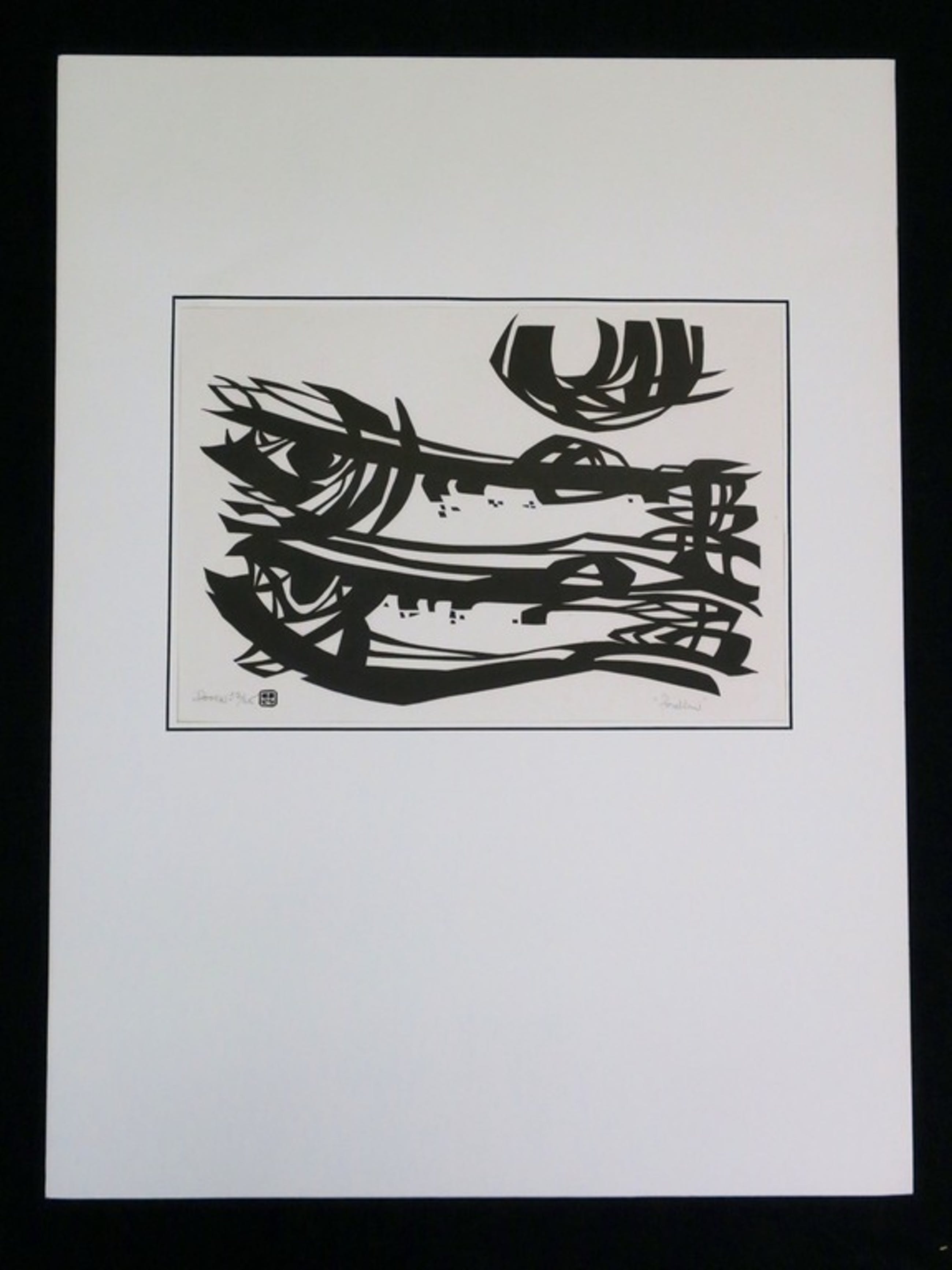 Materiaal: Linosnede op japans papier, bevestigd op onderblad met daaroverheen een passe-partout