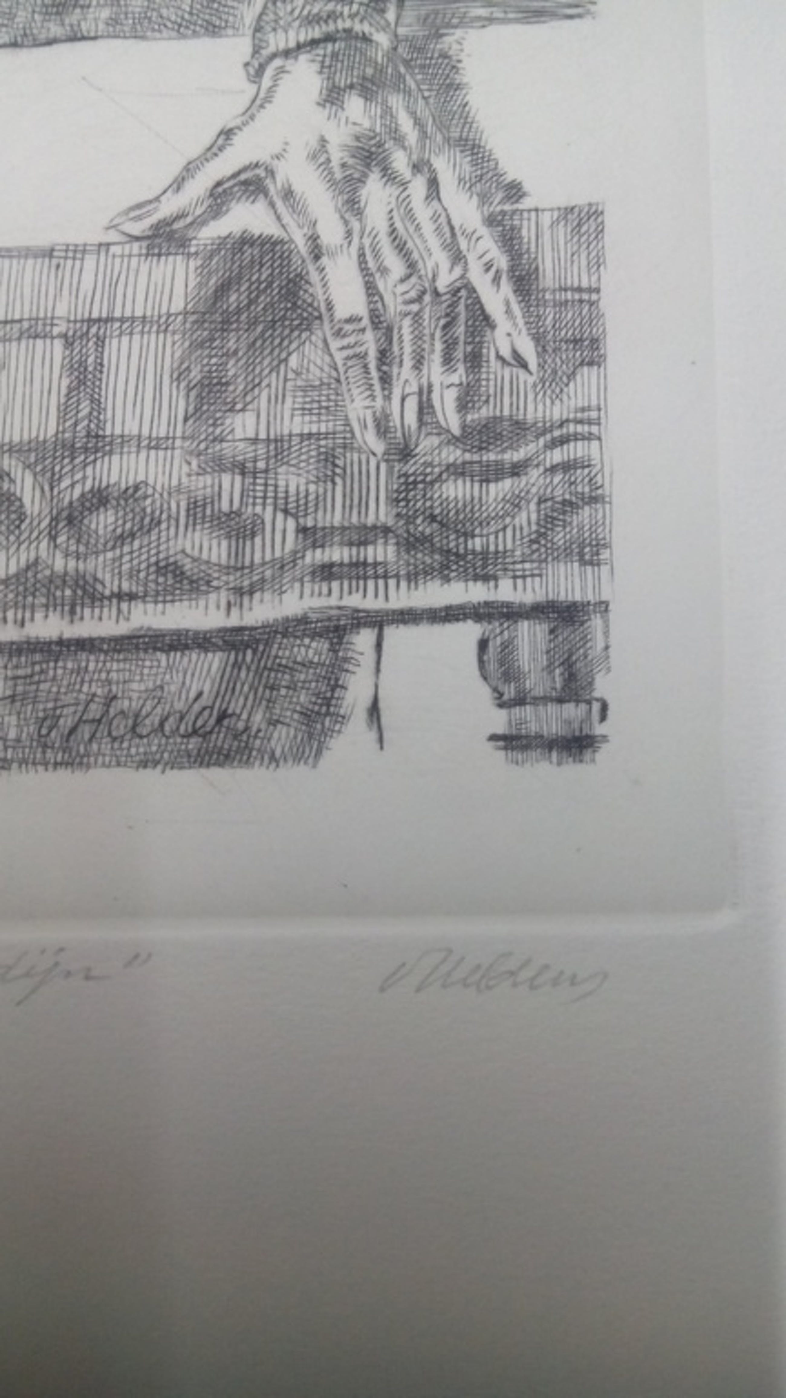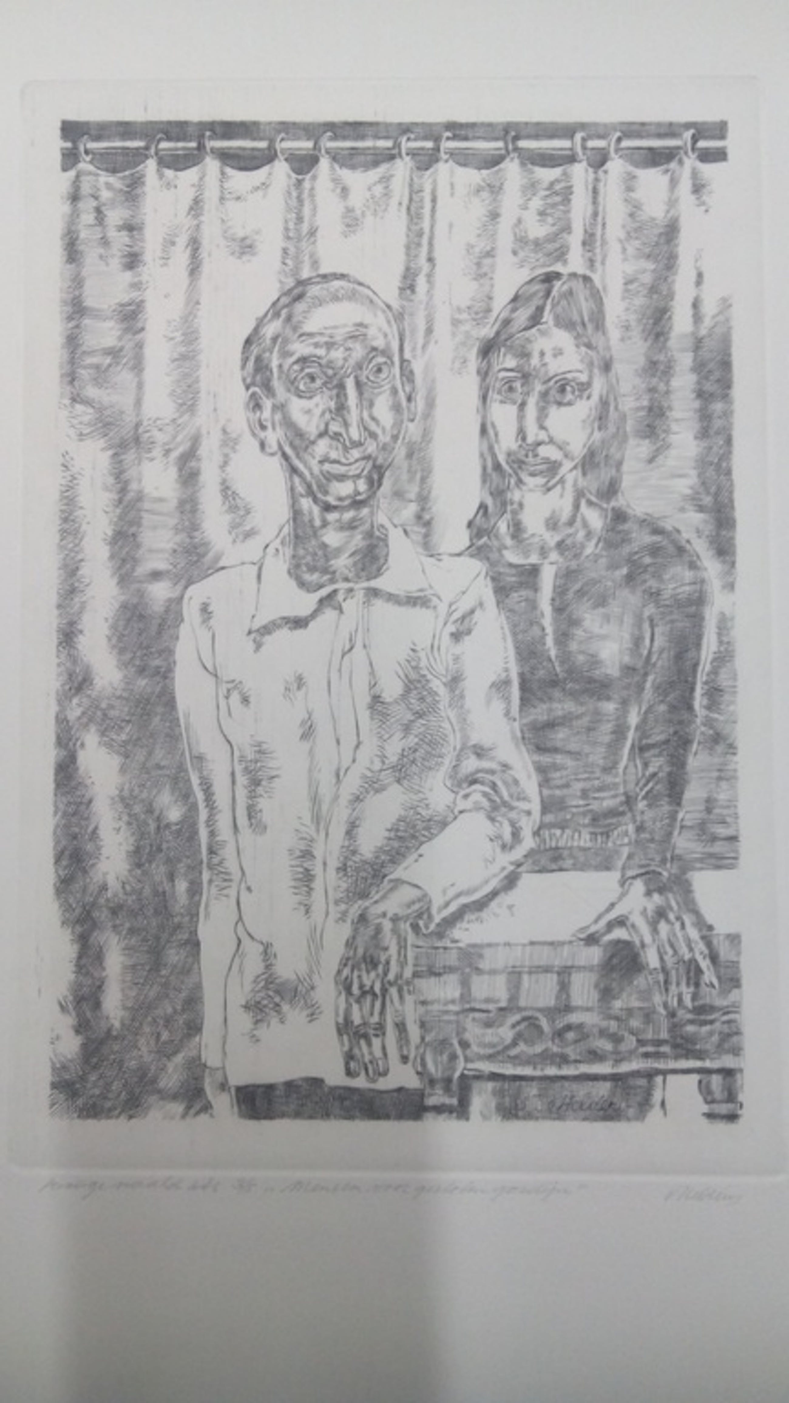 Getiteld Mensen voor gesloten gordijn. Geen lijst 22x33cm. Kan verzonden worden.