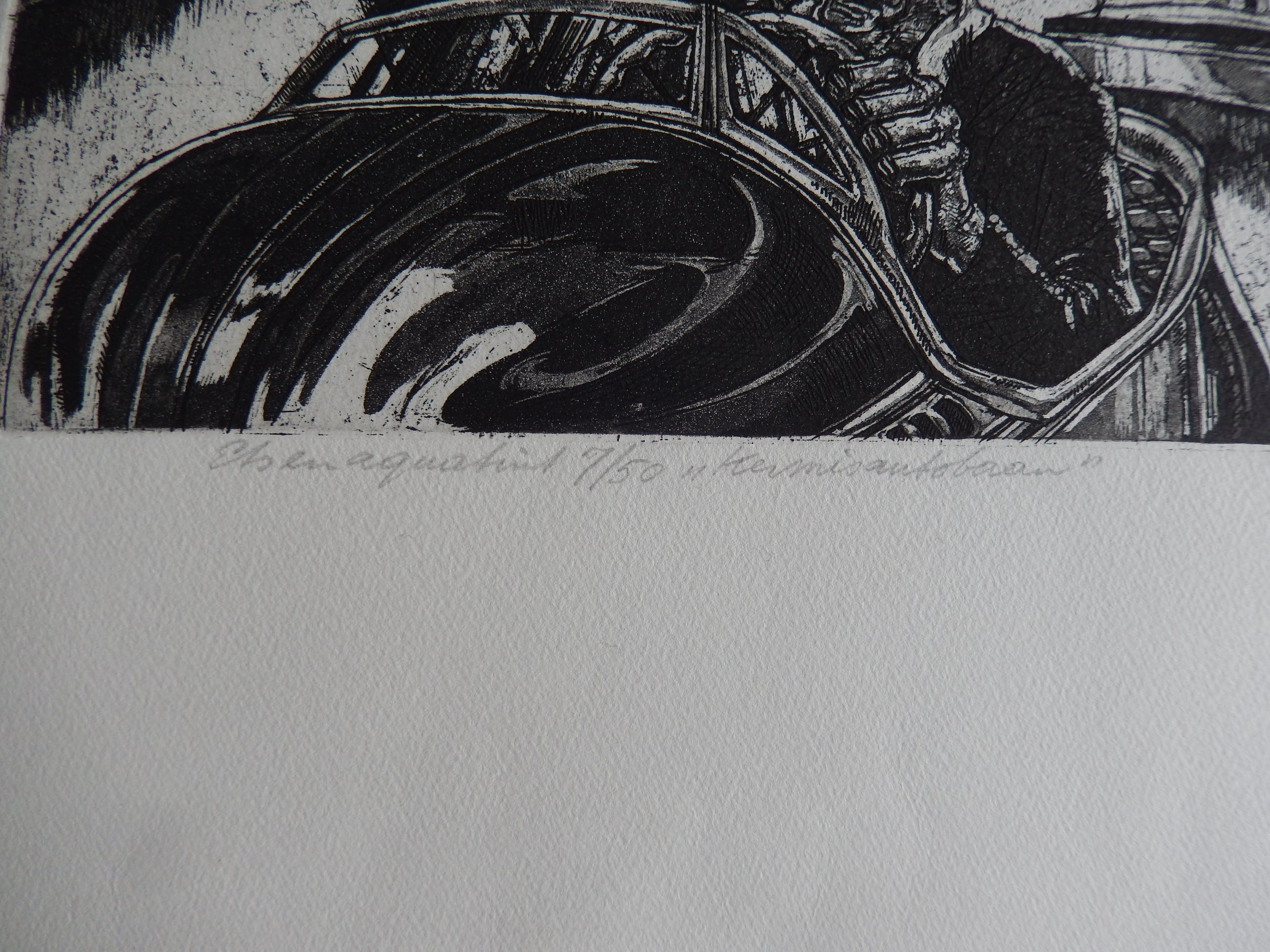 Ets en aquatint van Jan van Helden, titel: kermisautobaan. Buitenafmetingen: 53 x 39 cm. Afmetingen beeld: 30 x 26, 5 cm. Oplage 7/50. Gesigneerd.