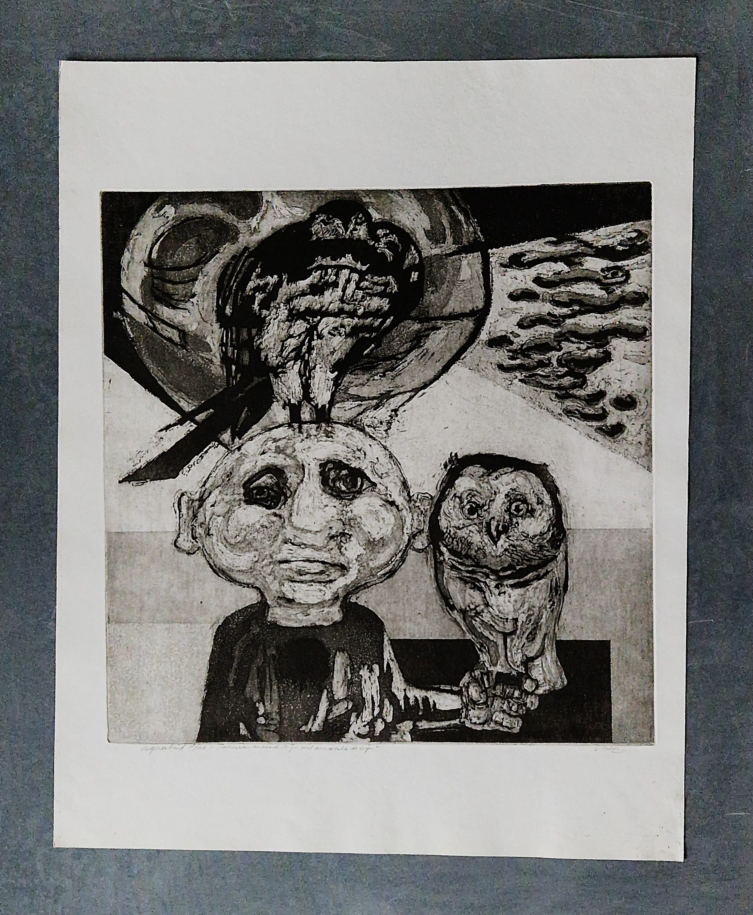 Jan van Helden - Monochrome Ets&Aquatint "iedereen meent zijn uil..." zeer kleine oplage(20)