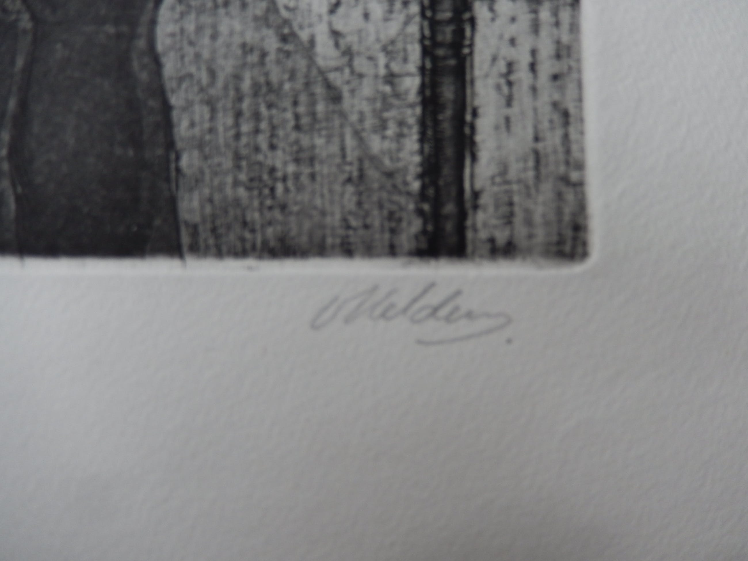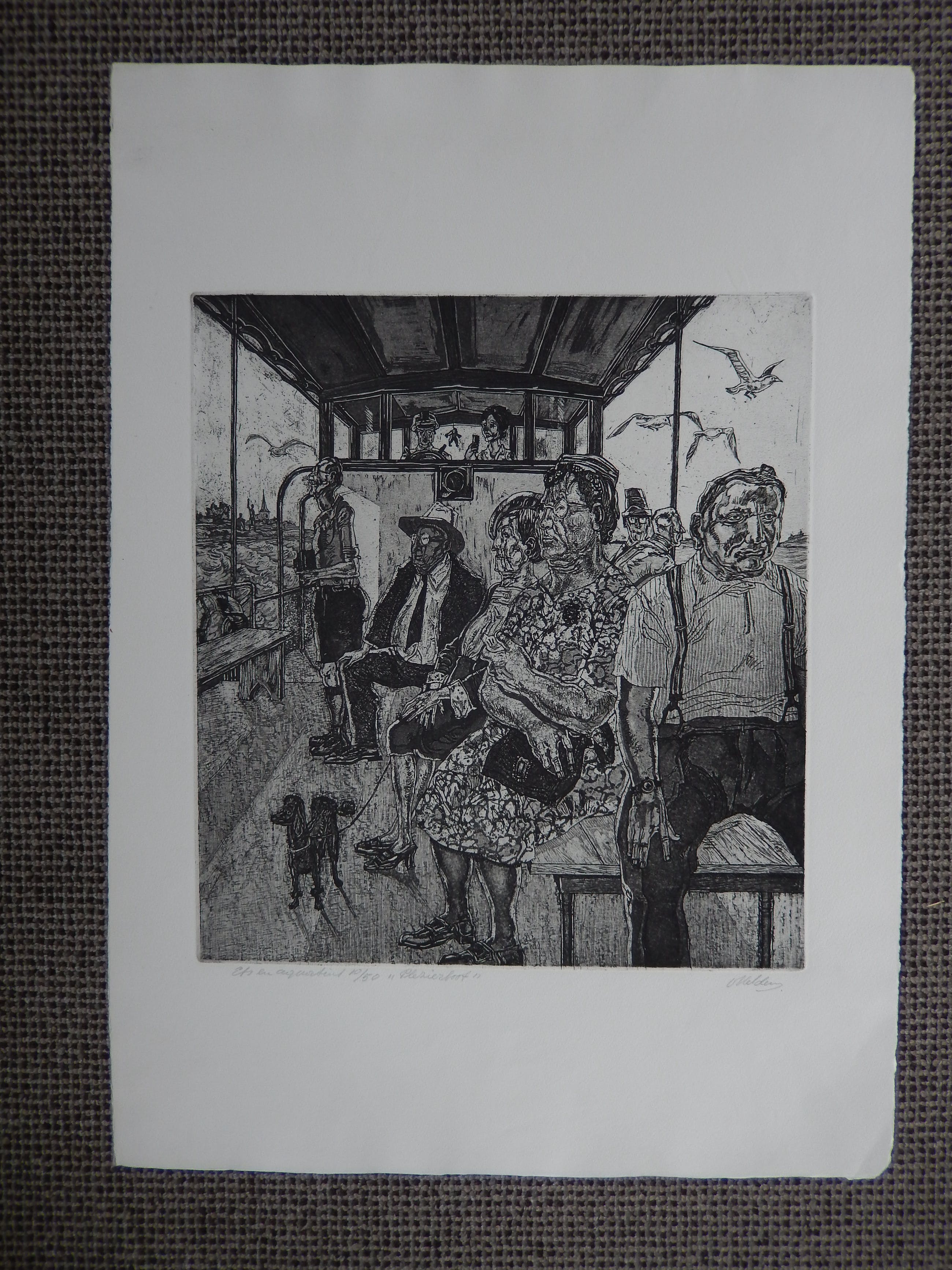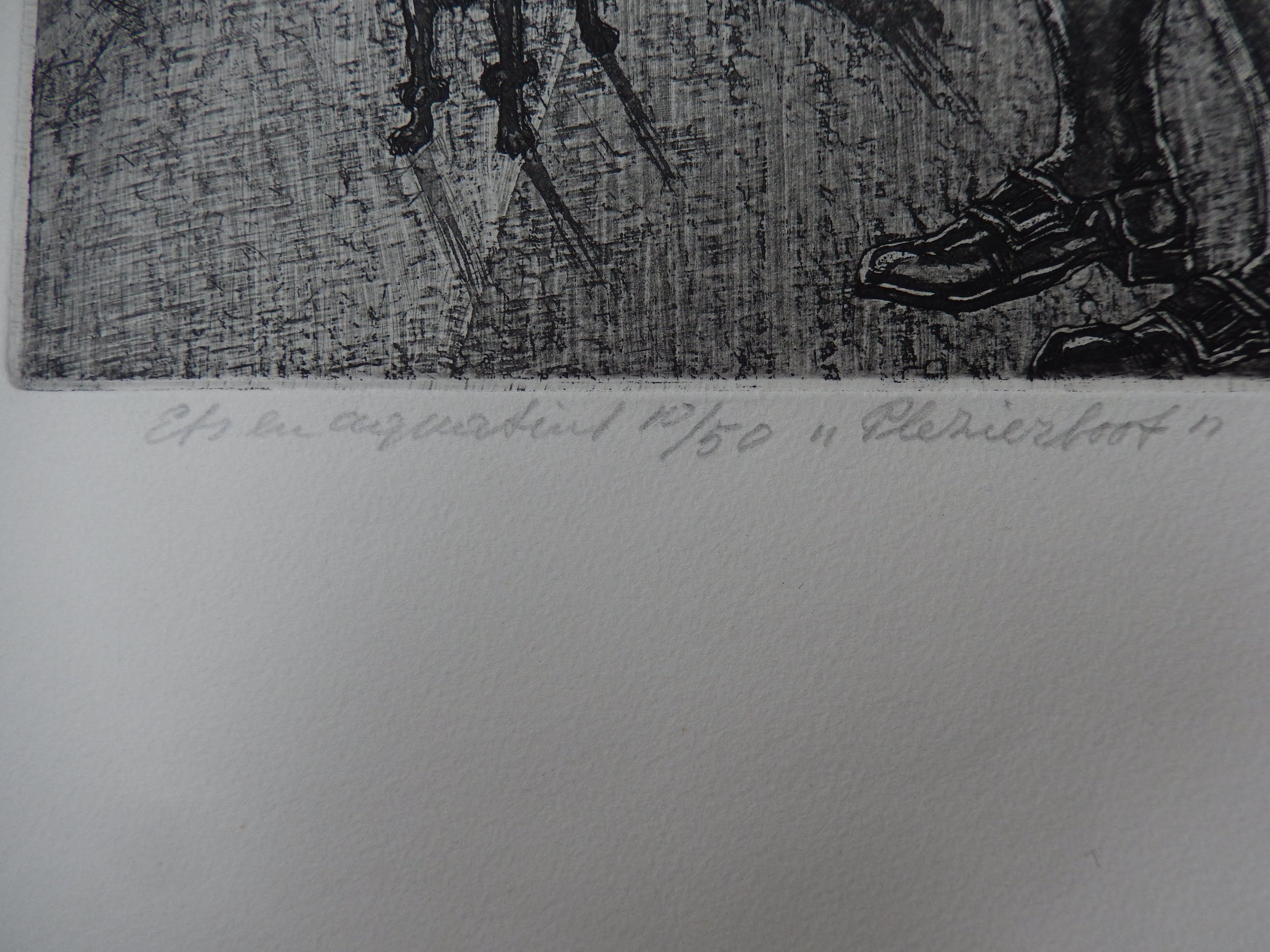 Ets van Jan van Helden, titel: Plezierboot. Buitenafmetingen: 53 x 38 cm. Afmetingen beeld: 32 x 29 cm. Oplage 10/50. Gesigneerd.