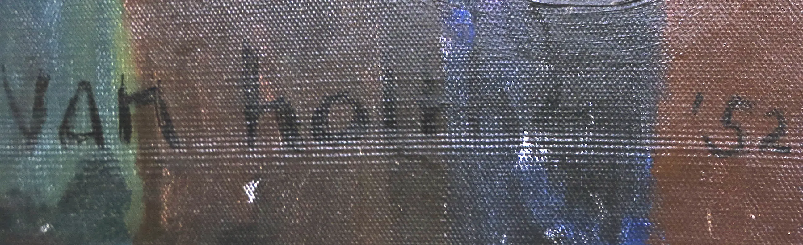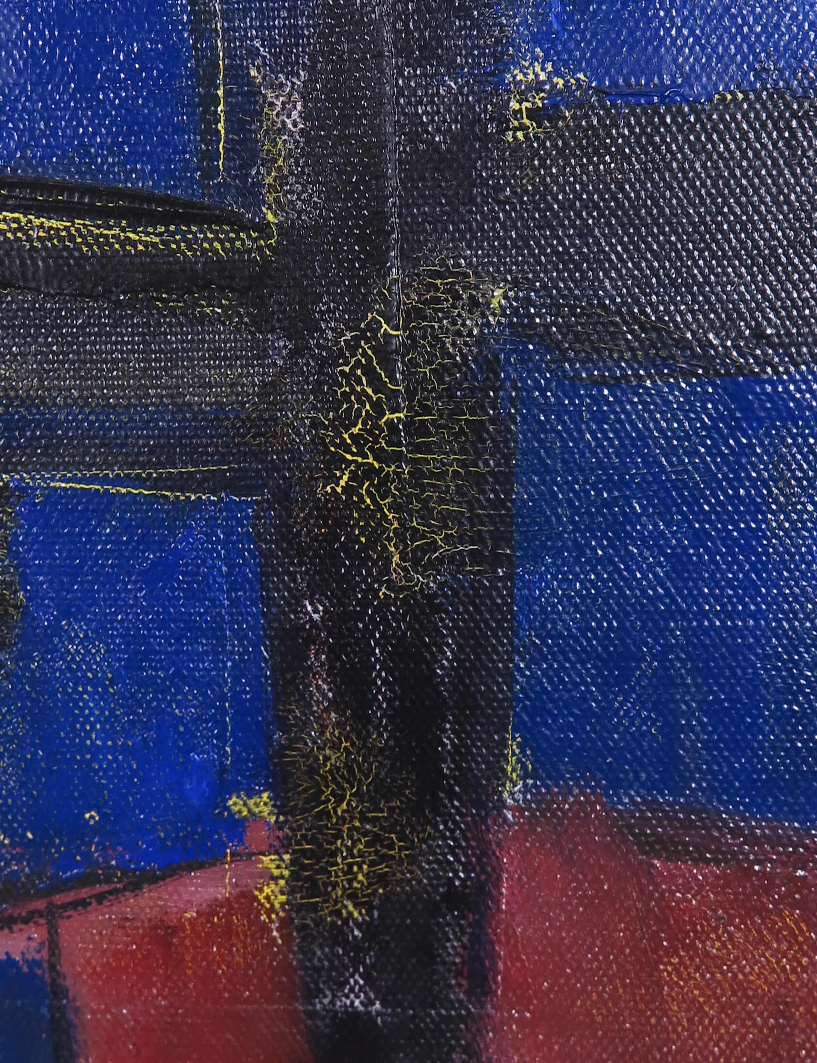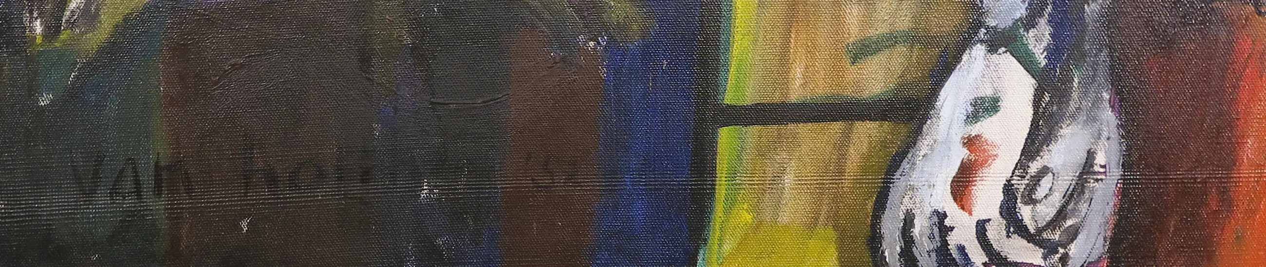 | Met name in de zwarte partijen wat lichte craquelé te zien, echter zonder loslating van de verf. (zie detailfoto's) | |
