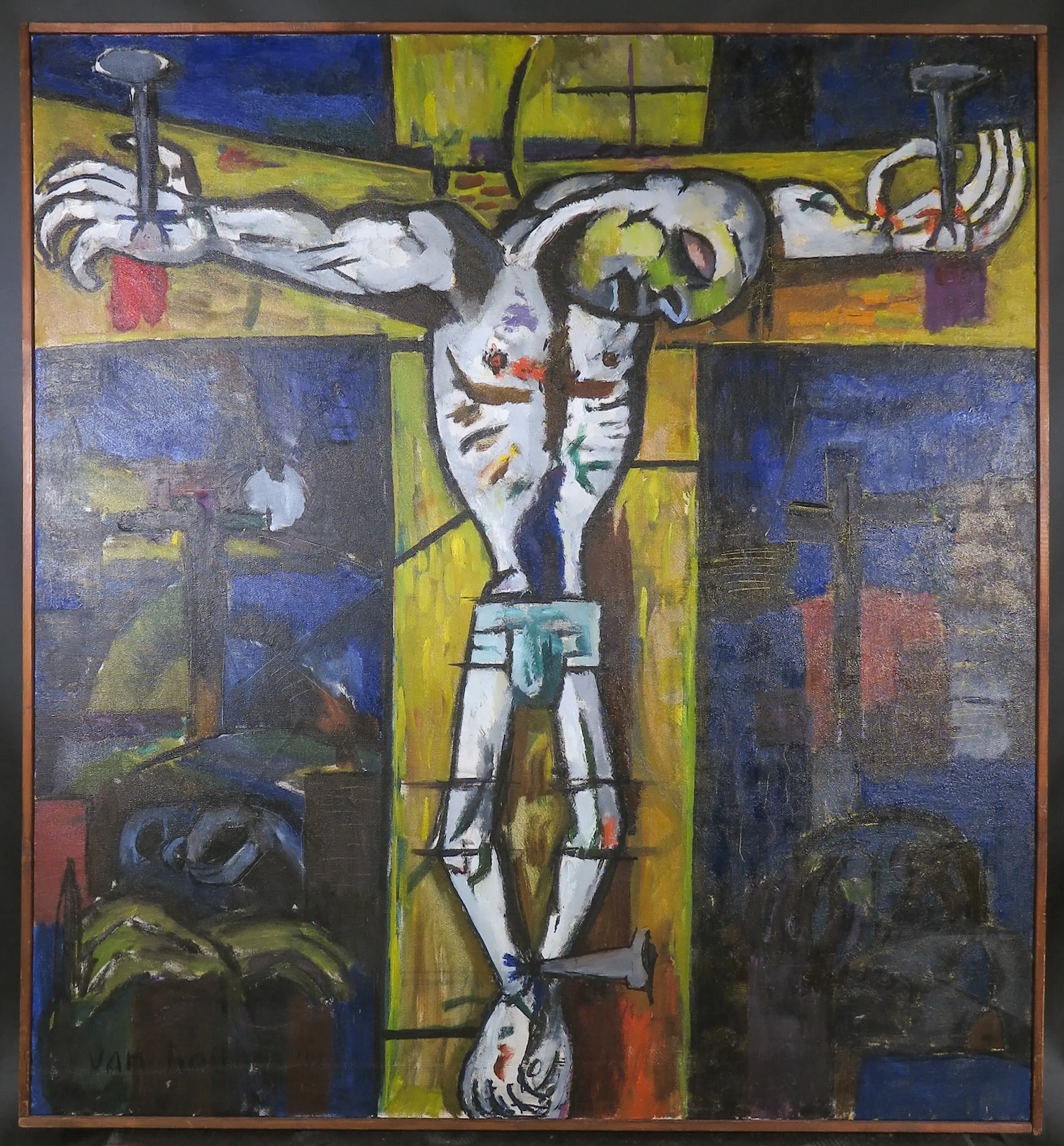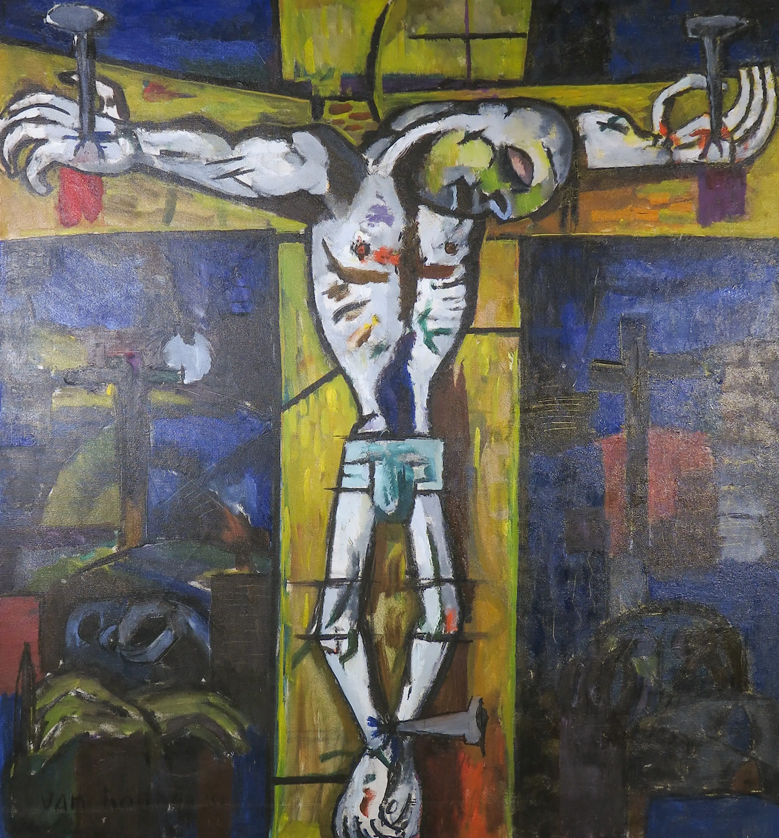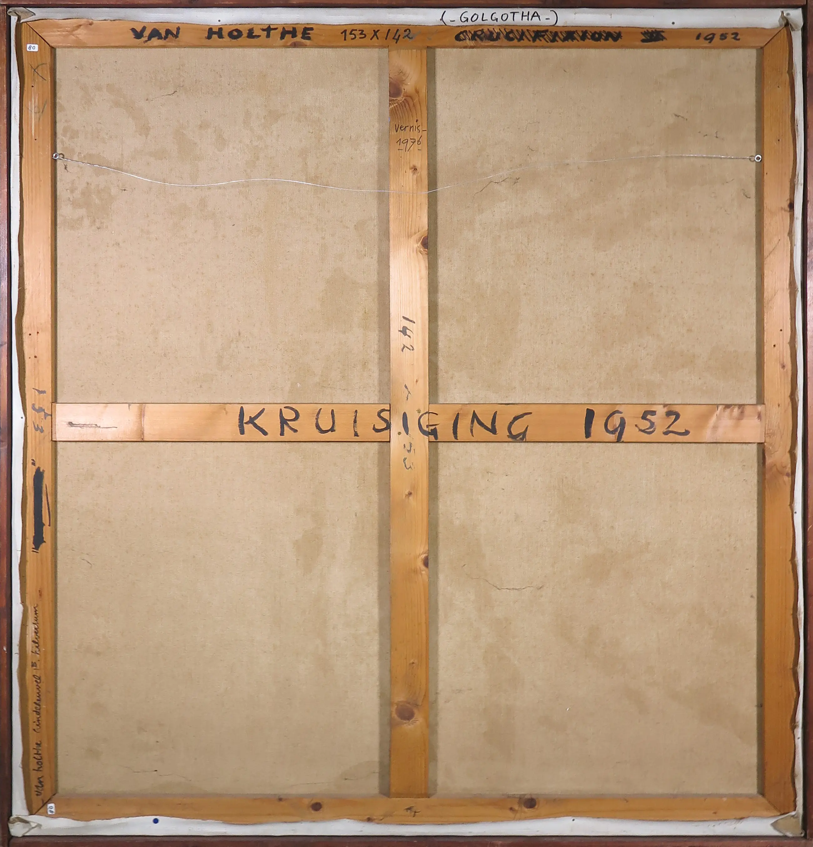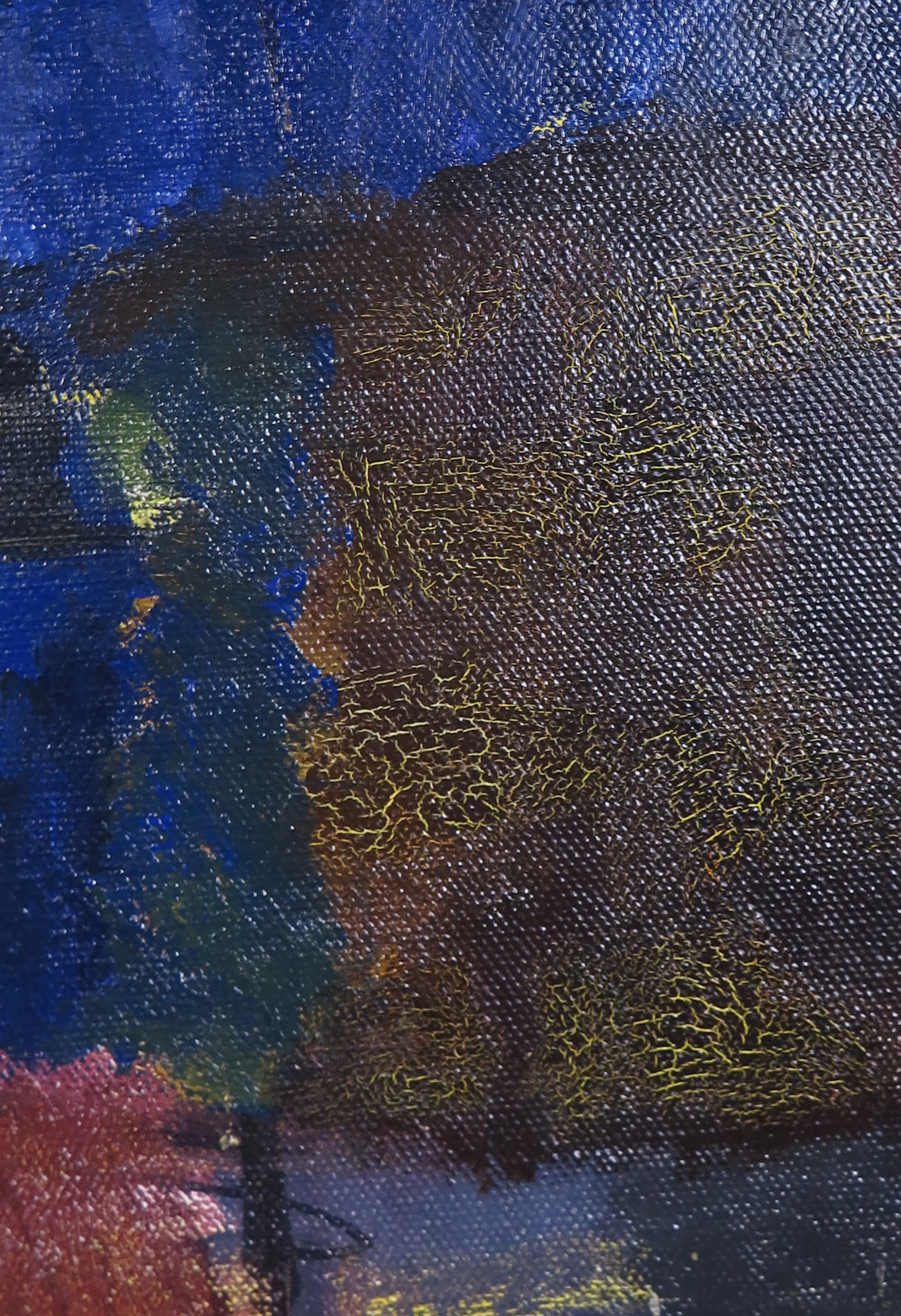| Met name in de zwarte partijen wat lichte craquelé te zien, echter zonder loslating van de verf. (zie detailfoto's) | |