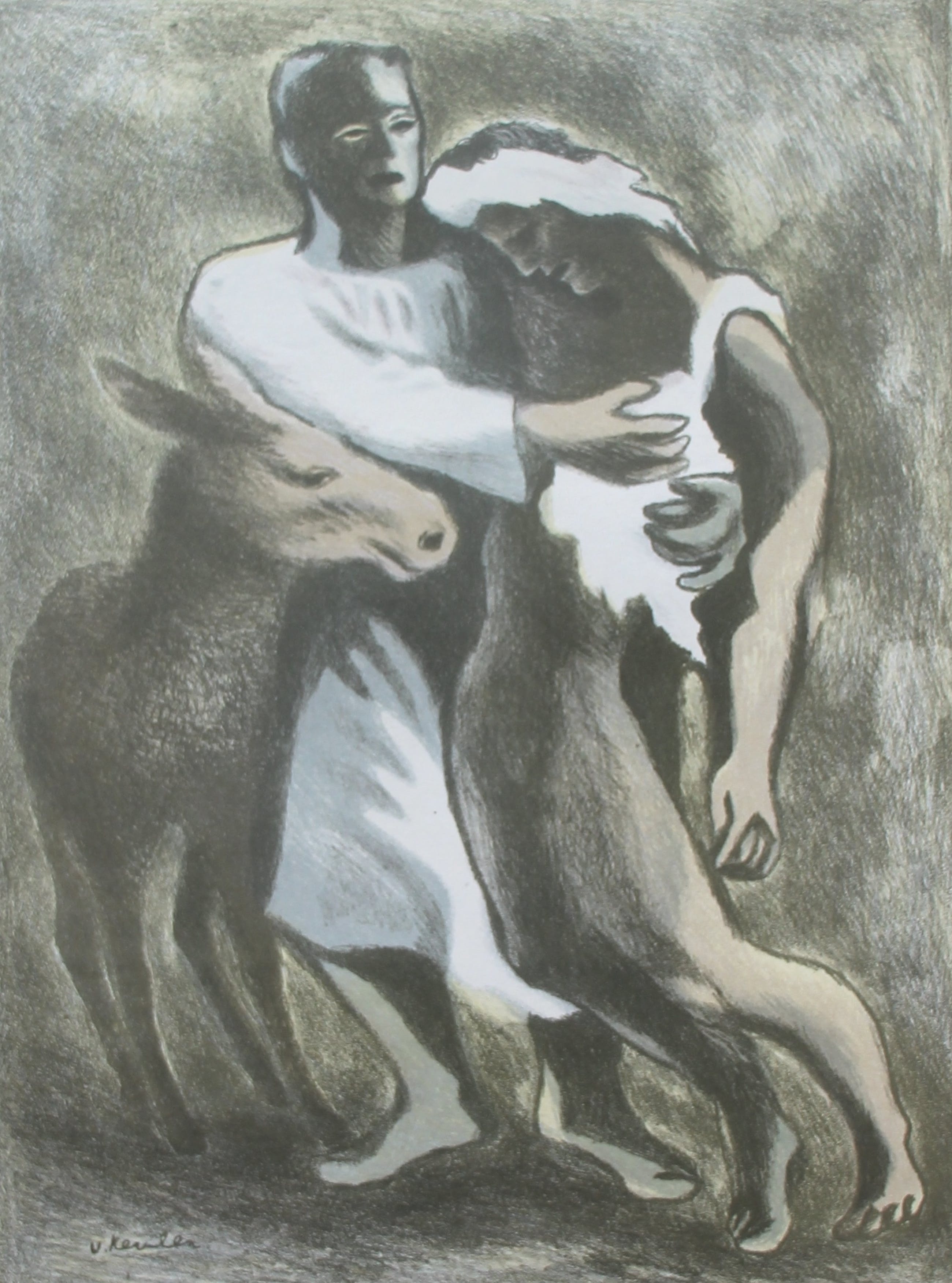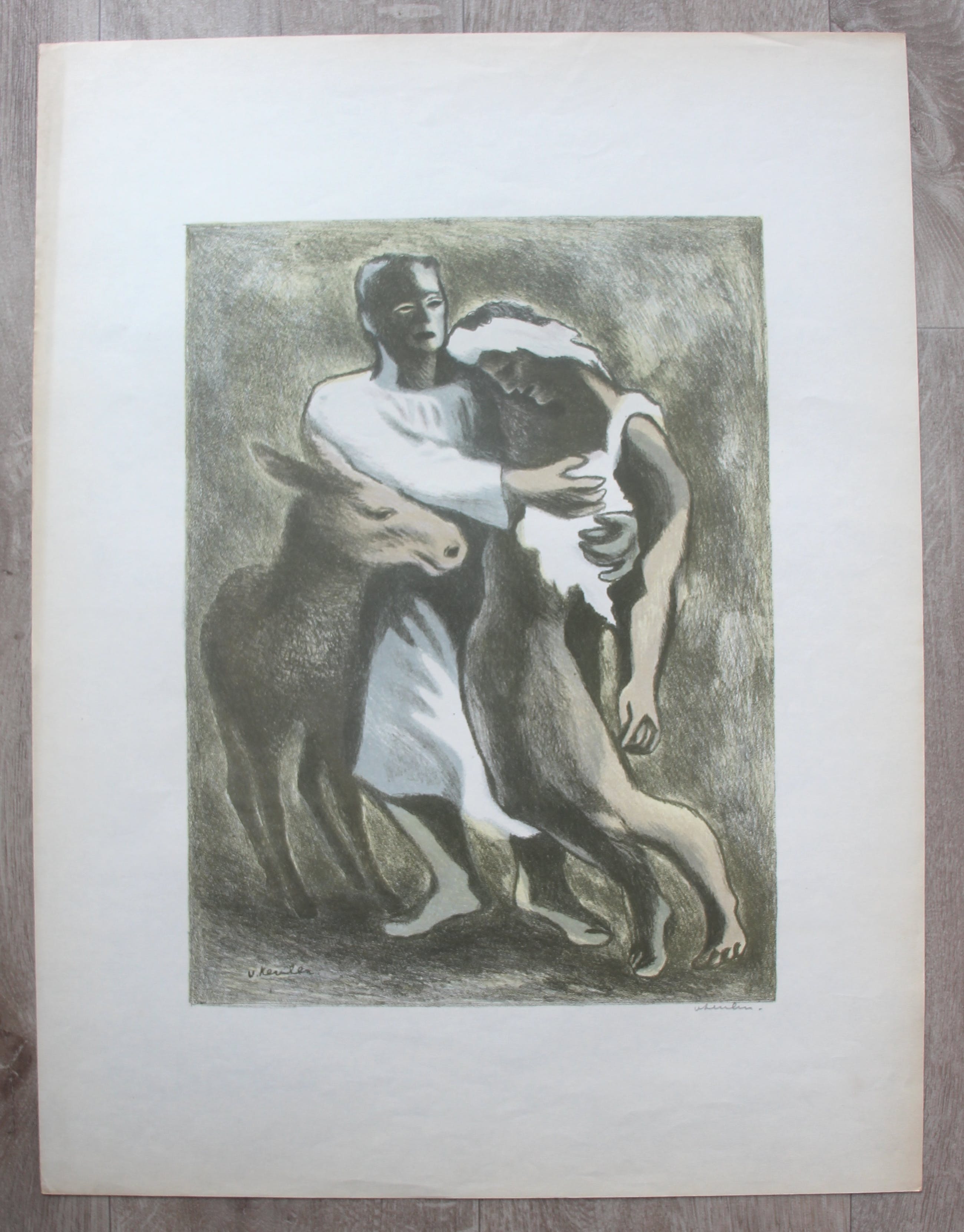 Kleurenlitho van Jan van Keulen. Titel: Barmhartige Samaritaan. Afmetingen blad: H63 x b47.5 cm. Afmetingen voorstelling: H42 x b31 cm. Het werk is links onderaan in de druk gesigneerd en rechtsonder hand gesigneerd met potlood.