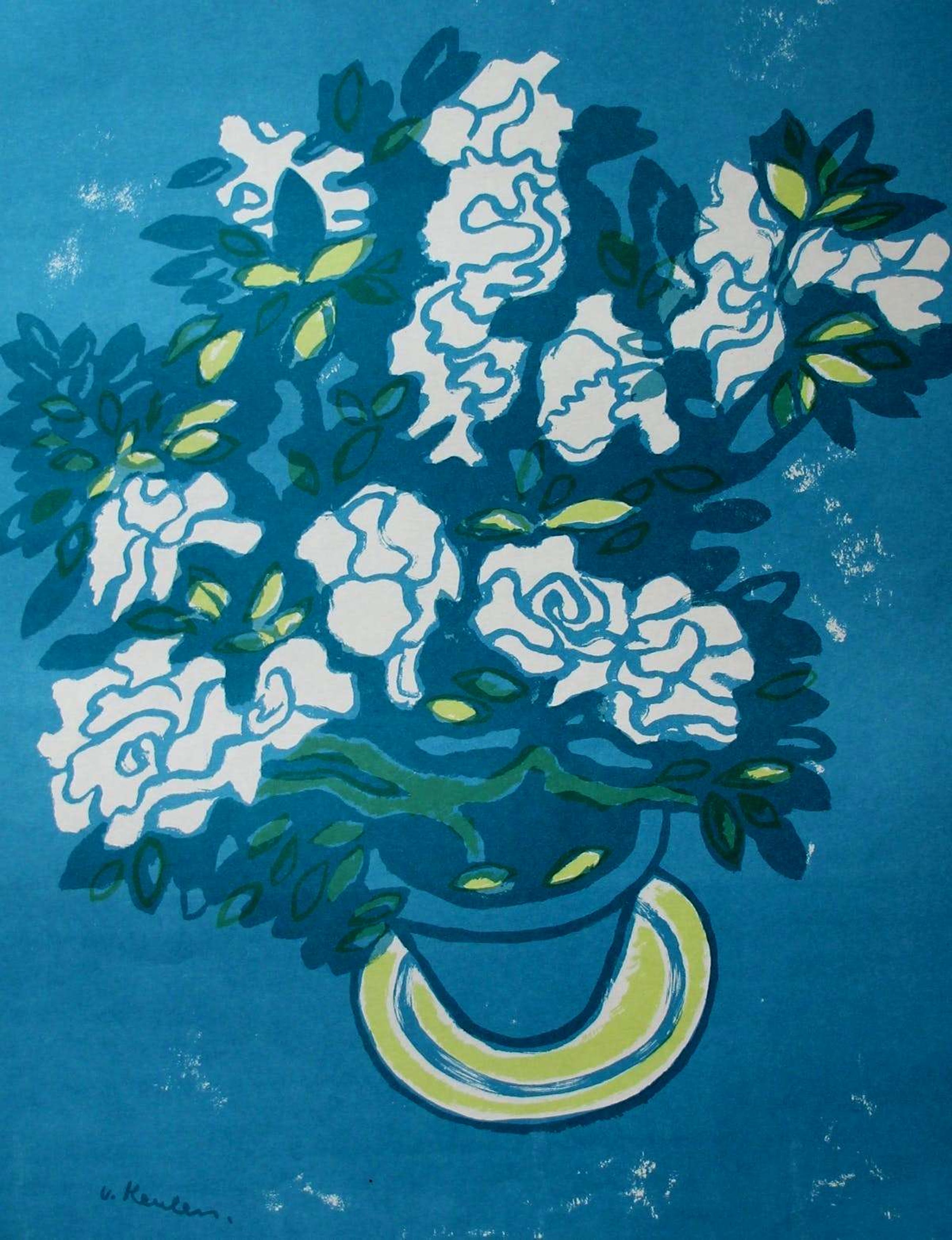 Kleurenlitho van Jan van Keulen. Titel: Stilleven met bloemen. Afmetingen blad: H63 x b48 cm. Afmetingen voorstelling: H49 x b38 cm. Het werk is links onderaan in de druk gesigneerd en rechtsonderaan, handgesigneerd met potlood.