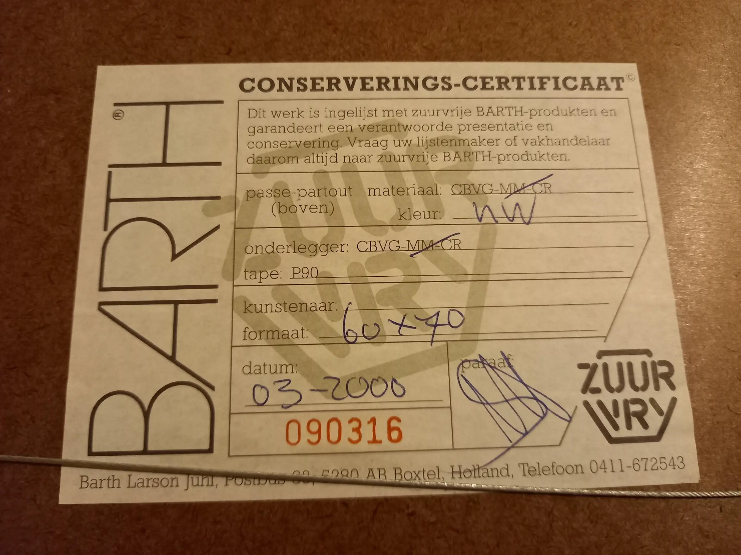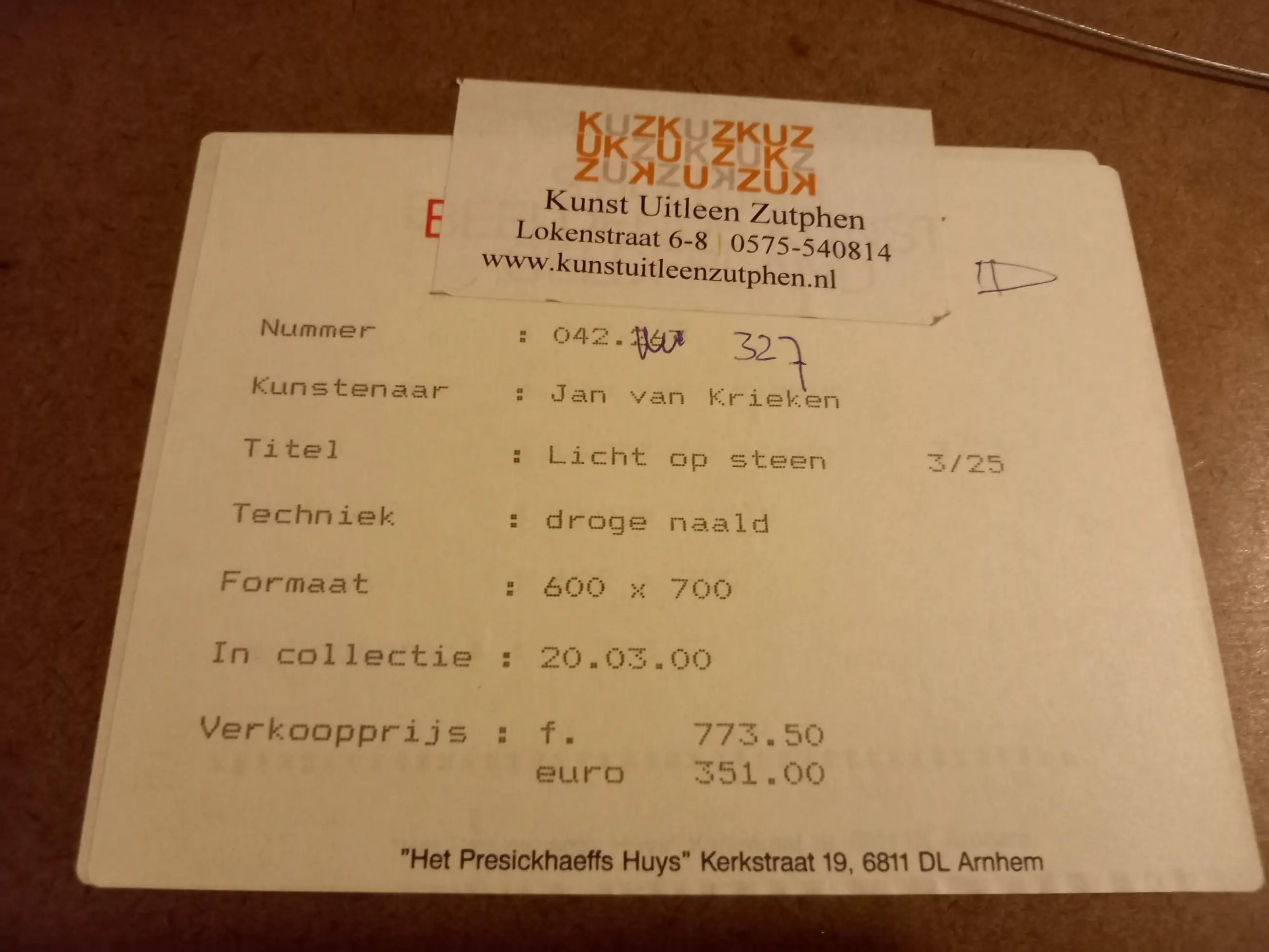 Ben u niet in staat om een werk zelf af te halen, dan kunt u een koeriersdienst inschakelen om het werk te laten afhalen. Klik hier voor meer informatie over hoe dit werkt en bekijk de tarieven.