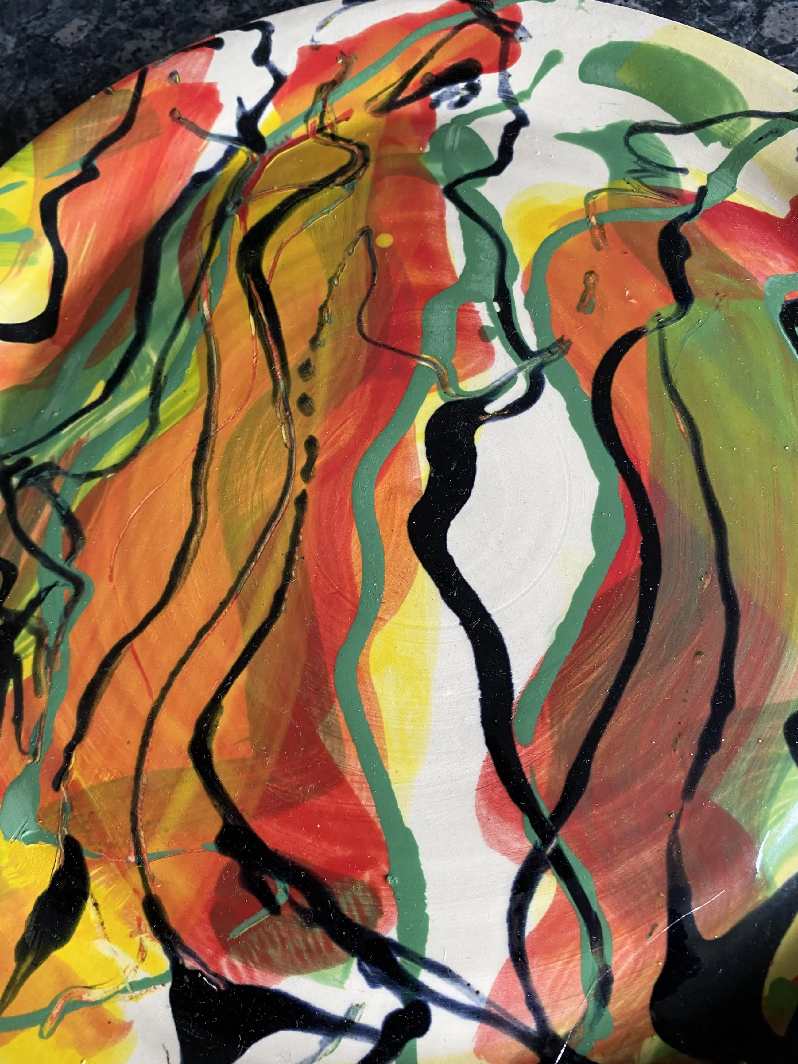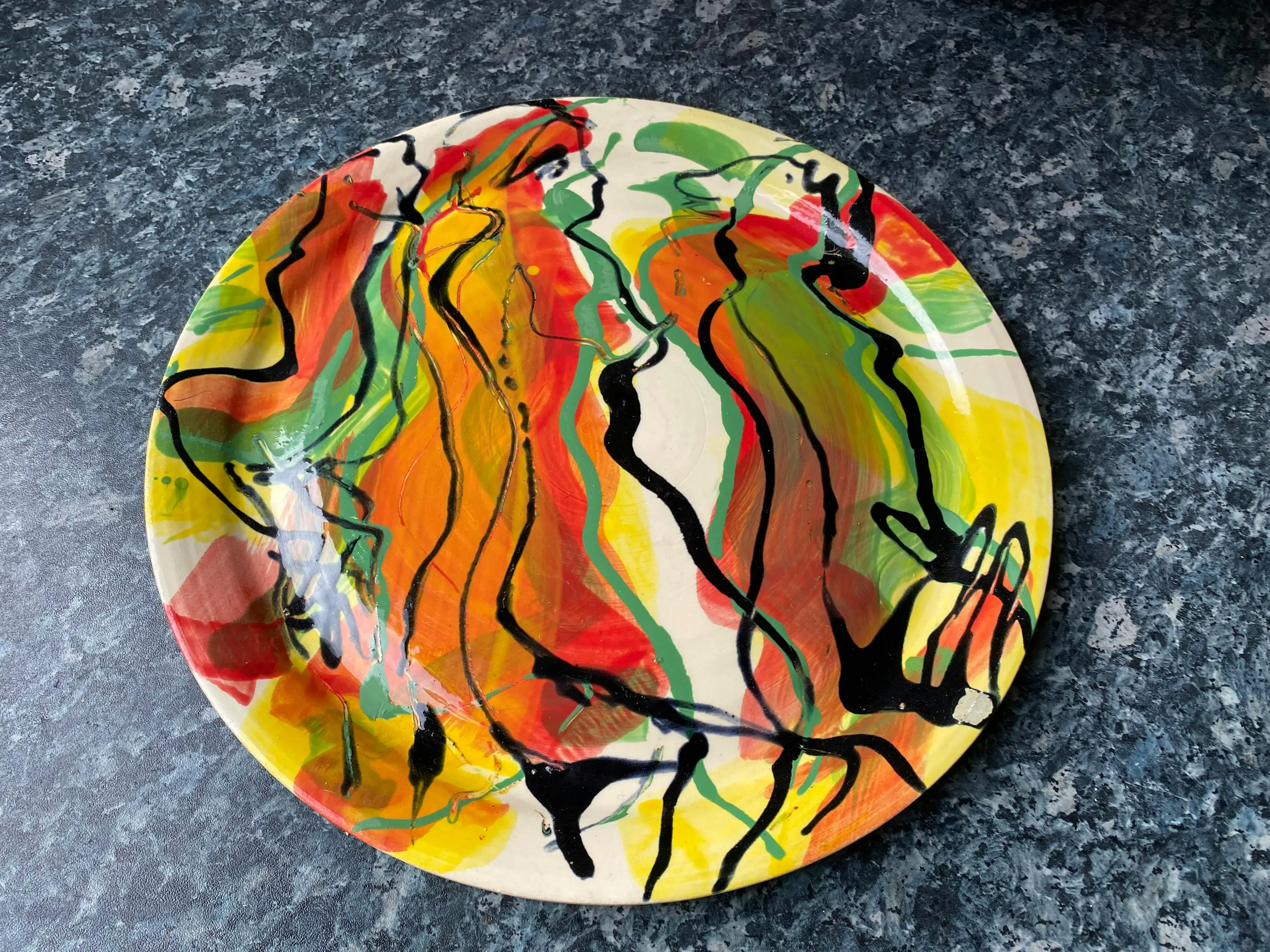 Kunstenaar Jan van Lokhorst (geb. 1954, atelier in Gouda ) is vooral bekend om zijn schilderijen. Opvallend bij hem zijn het kleurgebruik en de lijnvoering, waardoor zijn werk voor kenners direct te herkennen is. Dit geldt ook voor zijn enkele werken in keramiek, zoals bij deze prachtige schaal. Hiervan zijn er in het kader van de Goudse keramiekdagen 16 gemaakt die allen in een mum van tijd waren uitverkocht. Dit werkt anders dan bij schilderij want op keramisch object moet schildering rondom doorlopen. Een bord moet van alle kanten de moeite van het bekijken waard zijn. Uiteraard ook andere materialen: keramische verf die zijn kleur pas krijgt in de oven. Dit heeft Jan van Lokhorst tesamen met bekende keramiste uitgevoerd. Het glazuren aan het eind heeft de kleuren geïntensiveerd. Kortom, 1 van de 16 gelimiteerde borden!