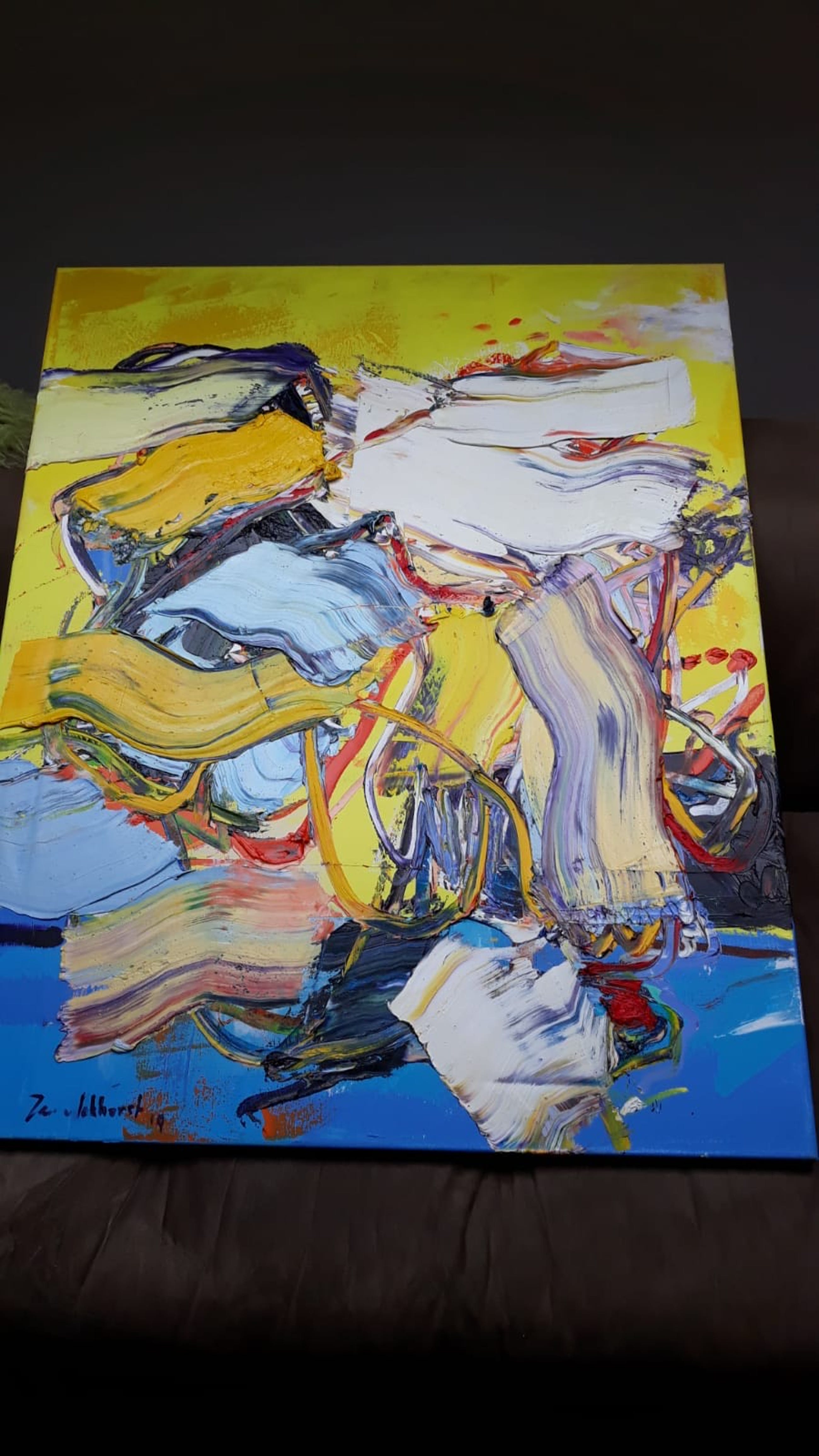 Abstract/expressionistisch werk, veel kleur en verf dik opgezet. Aan de achterzijde is het spieraam met aluminium versterkt.