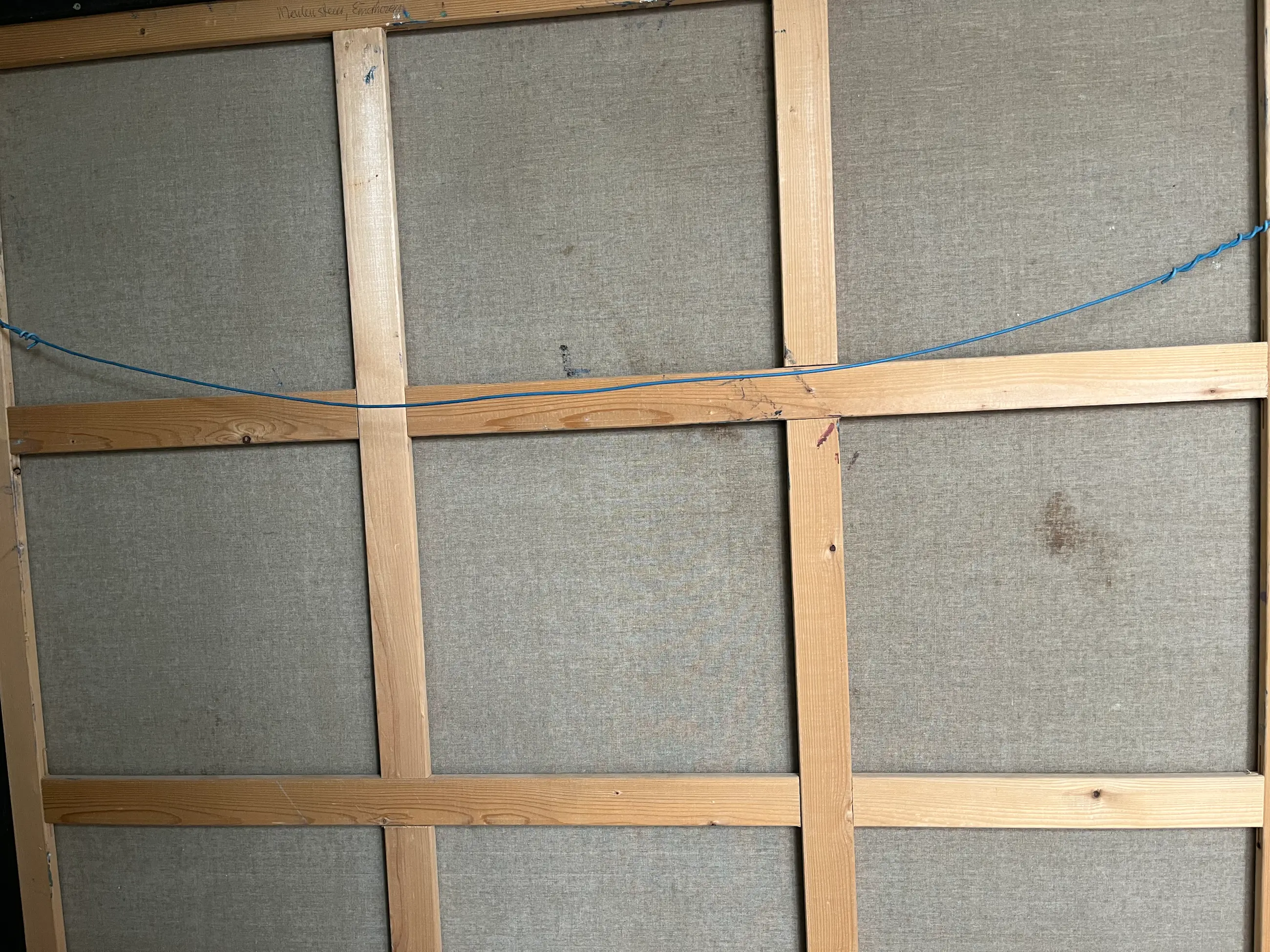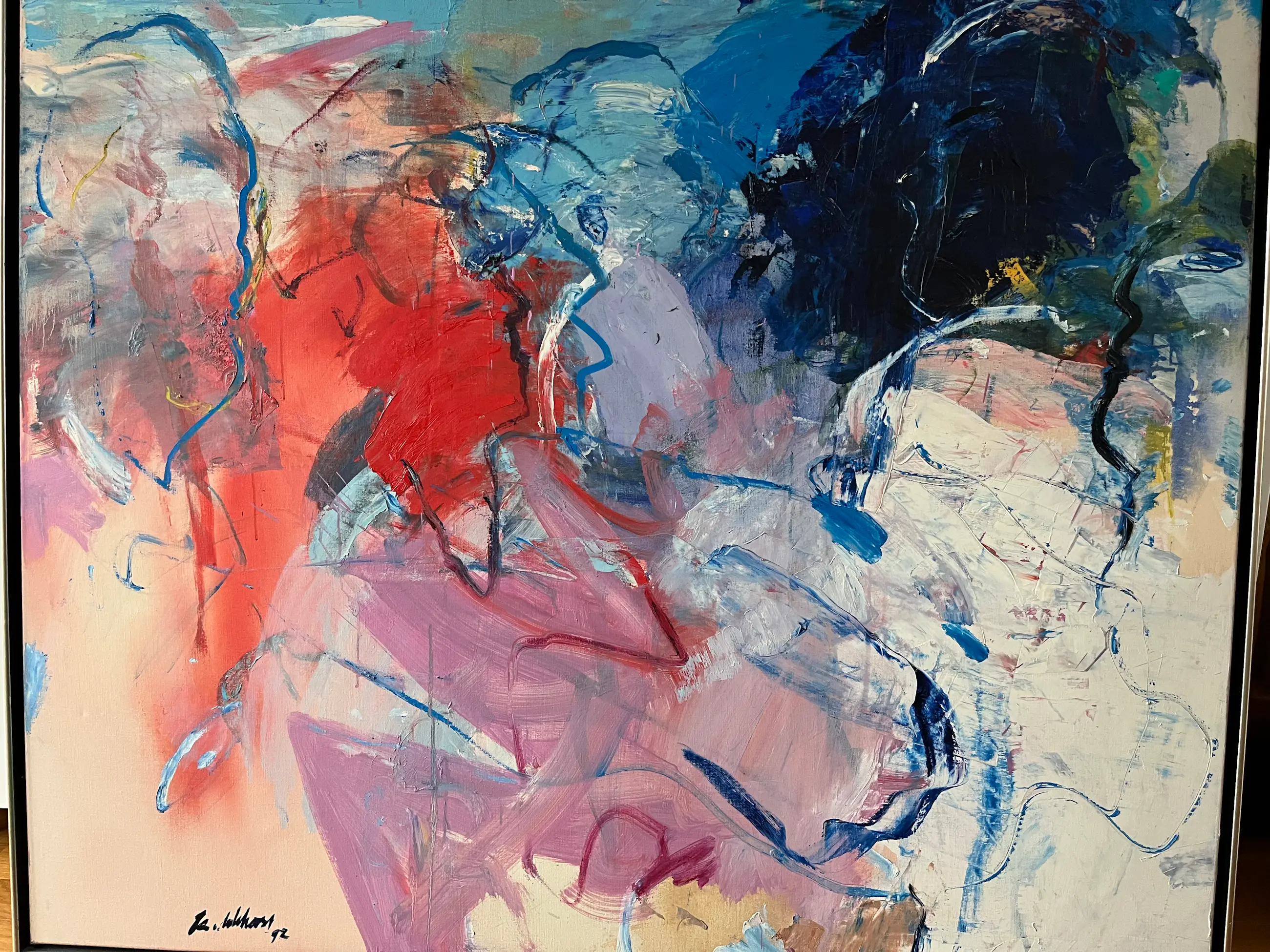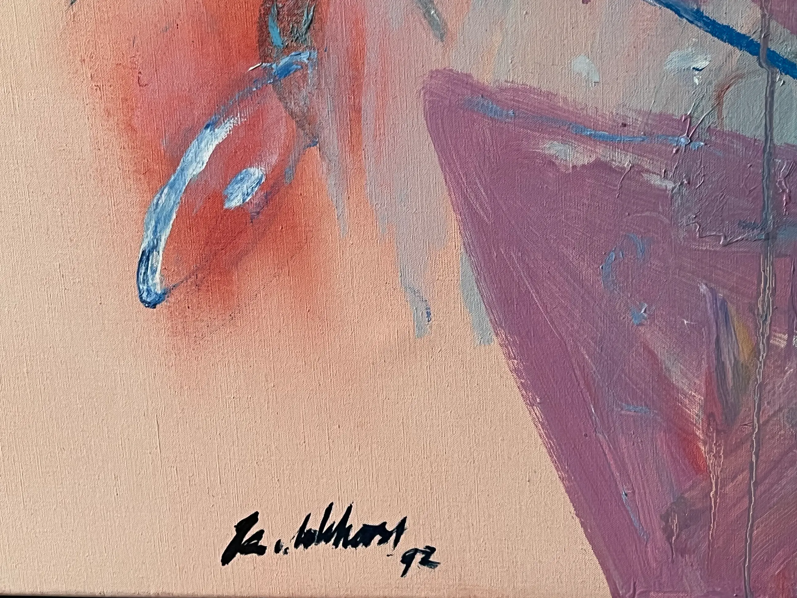 Kleurrijke compositie uit een museale collectie. Het schilderij uit 1992 is gelijst in een zilverkleurige houten baklijst. ( Enkele lichte gebruikssporen. Detailfoto) Afmeting werk 140 x 150 cm. Inclusief baklijst 144 x 154 cm.