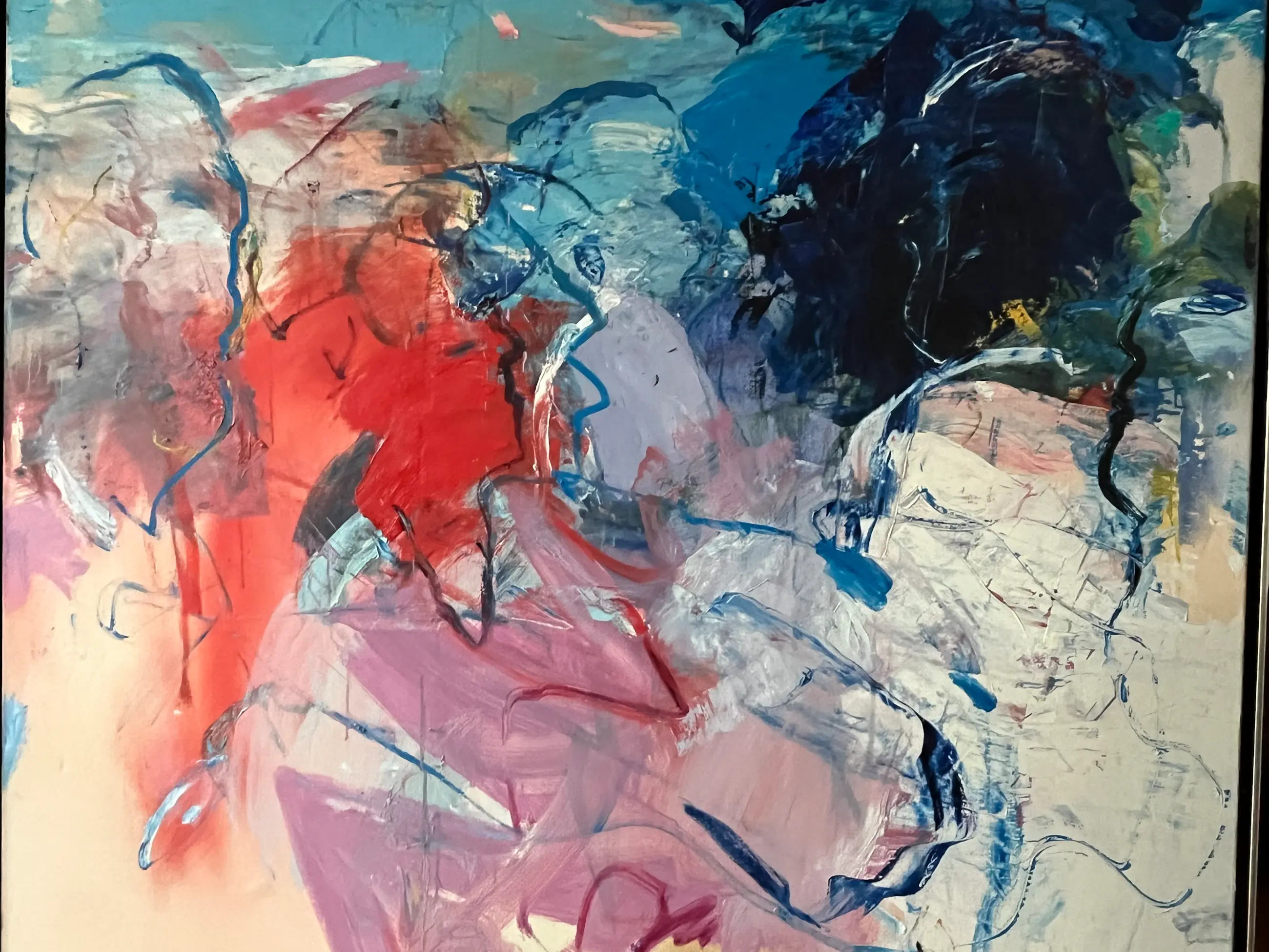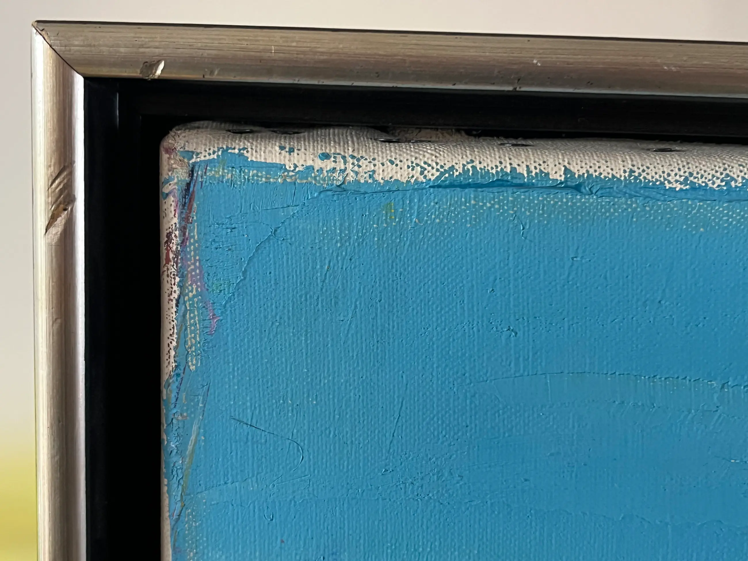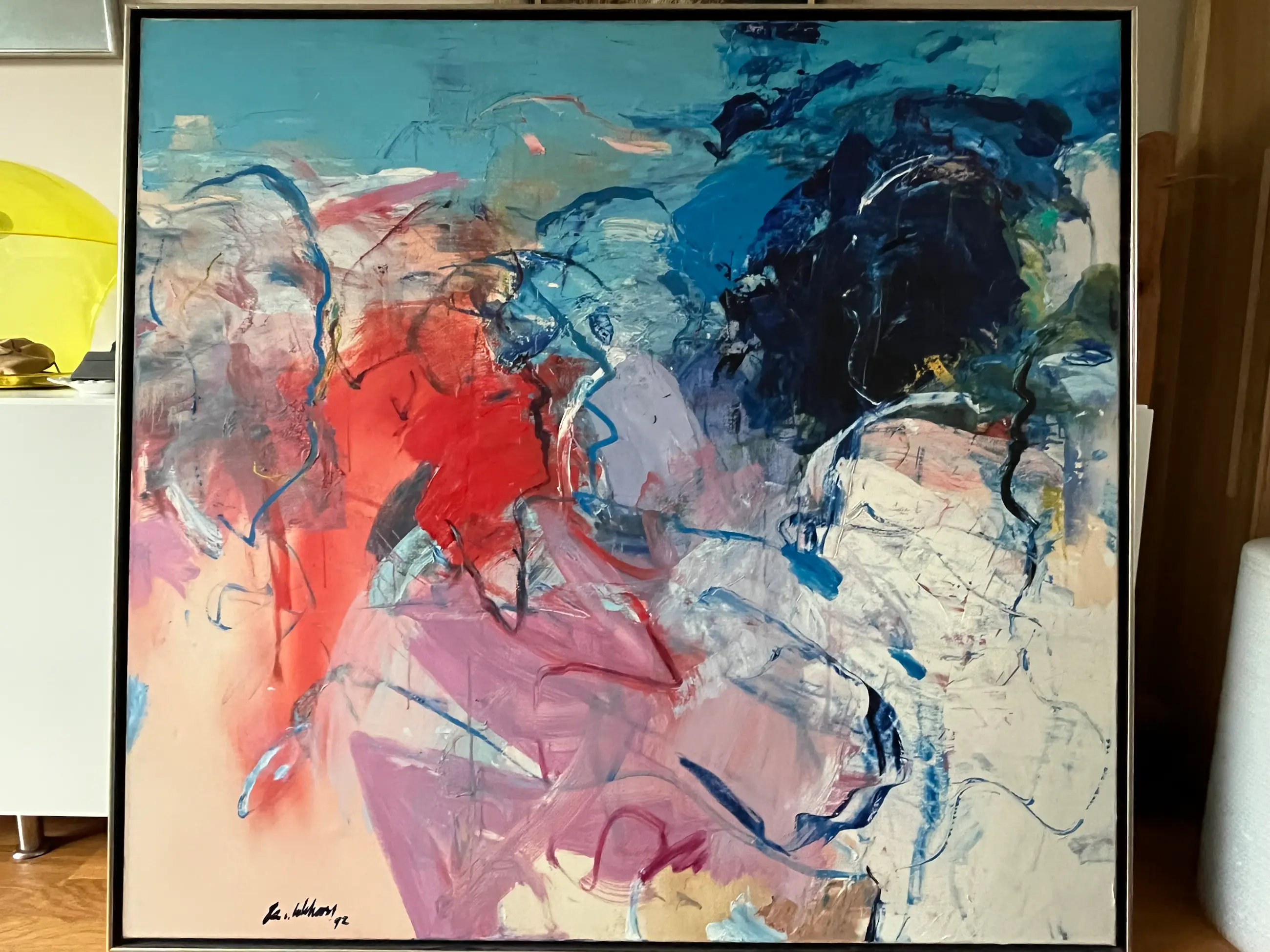 Kleurrijke compositie uit een museale collectie. Het schilderij uit 1992 is gelijst in een zilverkleurige houten baklijst. ( Enkele lichte gebruikssporen. Detailfoto) Afmeting werk 140 x 150 cm. Inclusief baklijst 144 x 154 cm.