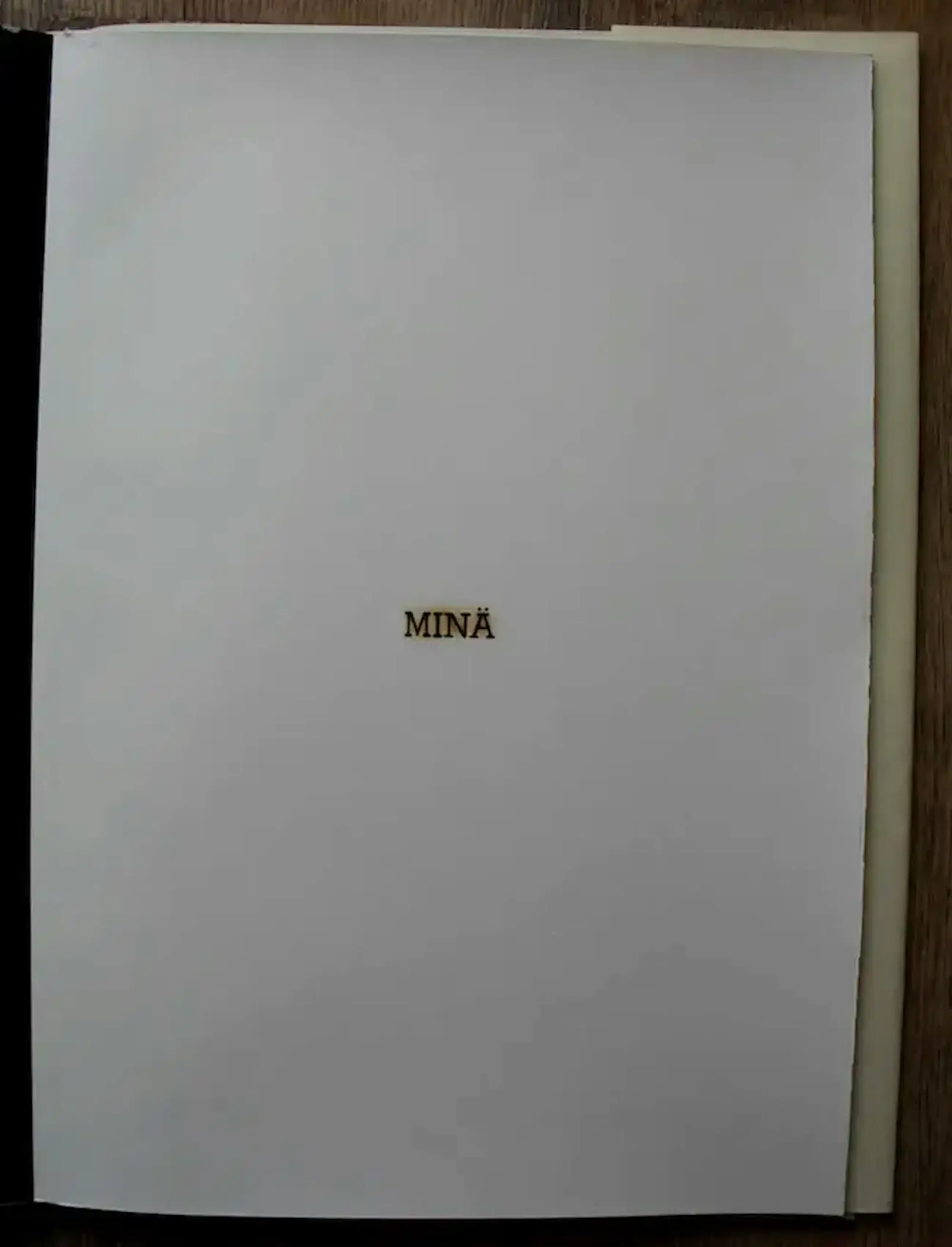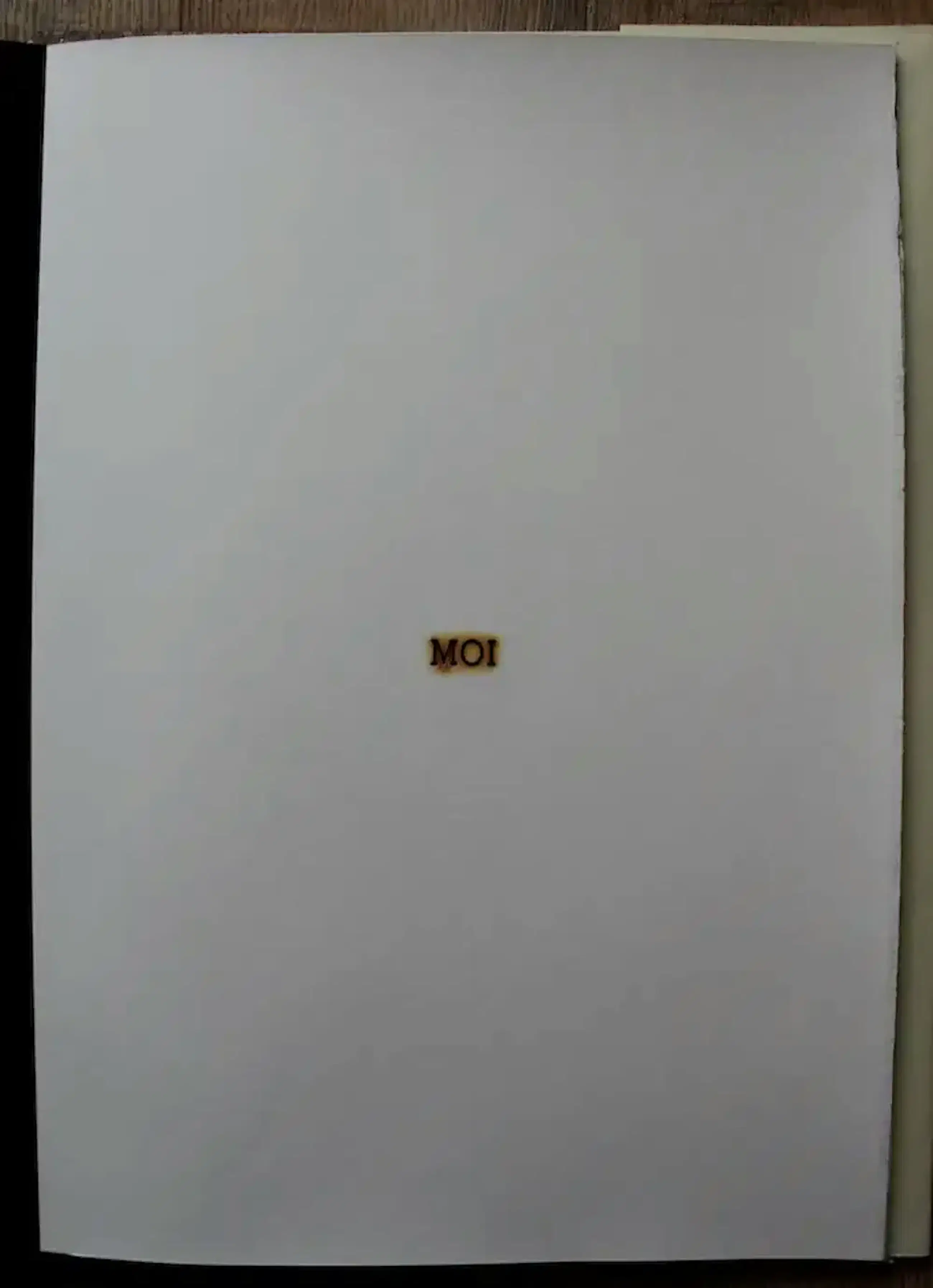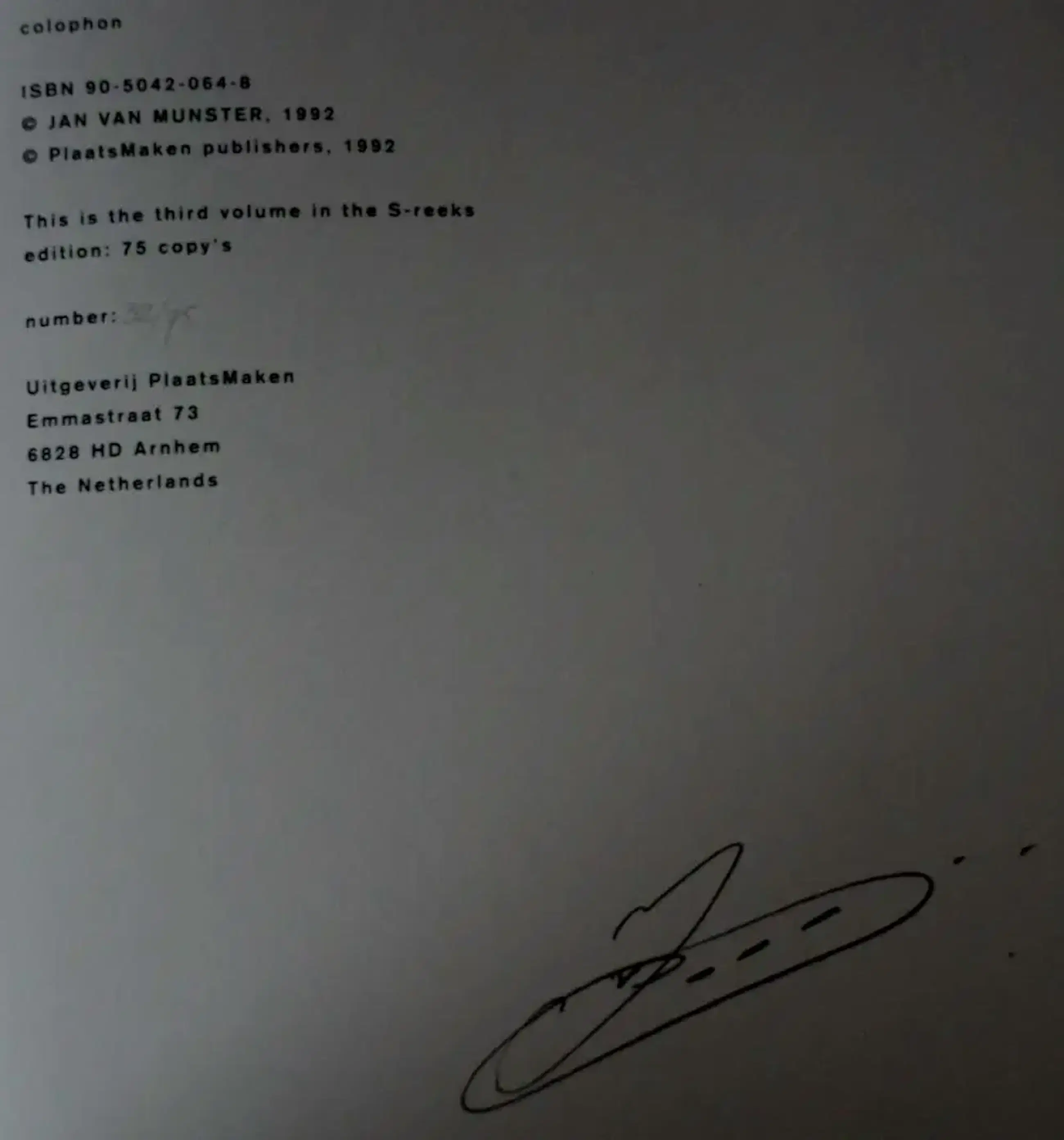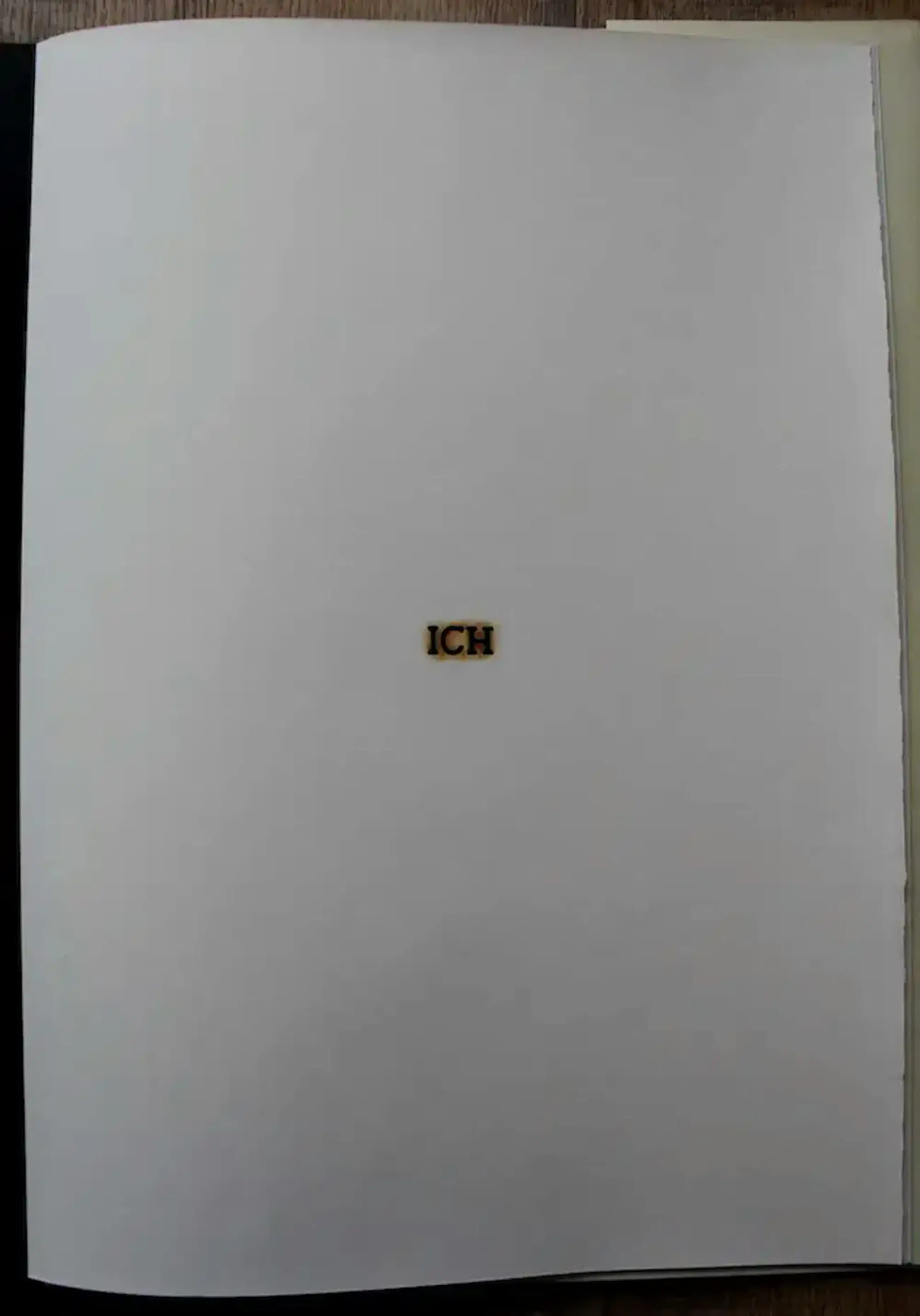 Derde editie uit de S-Reeks (1992). Cassette met gebonden boekwerk waarin 20 afwisselende zwarte en witte bladen, pyrografie (branddruk) en pleegdrukken. Gebrandmerkte woorden die in verschillende talen hetzelfde uitdrukken: IK. Gesigneerd en genummerd 32/75.