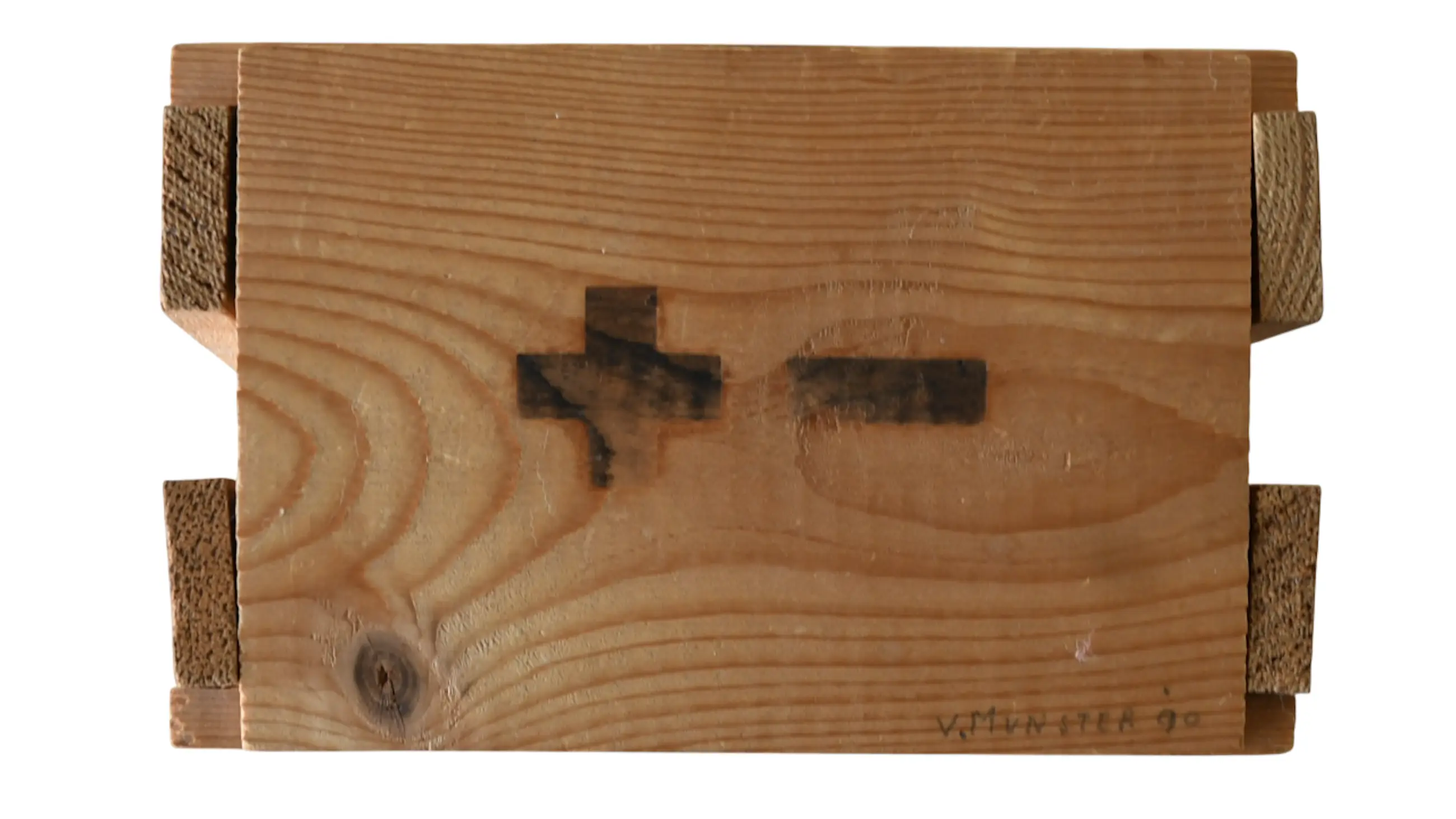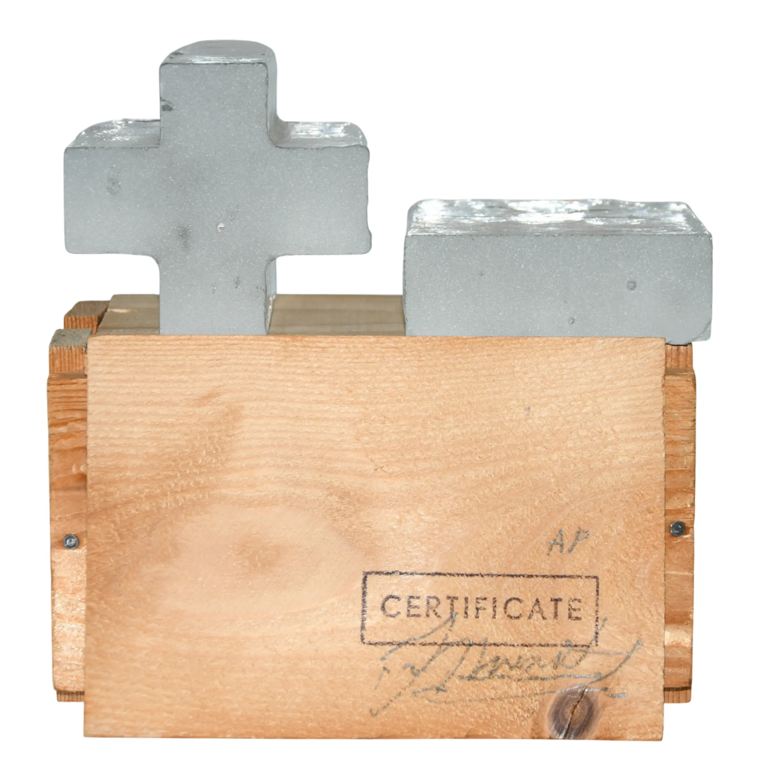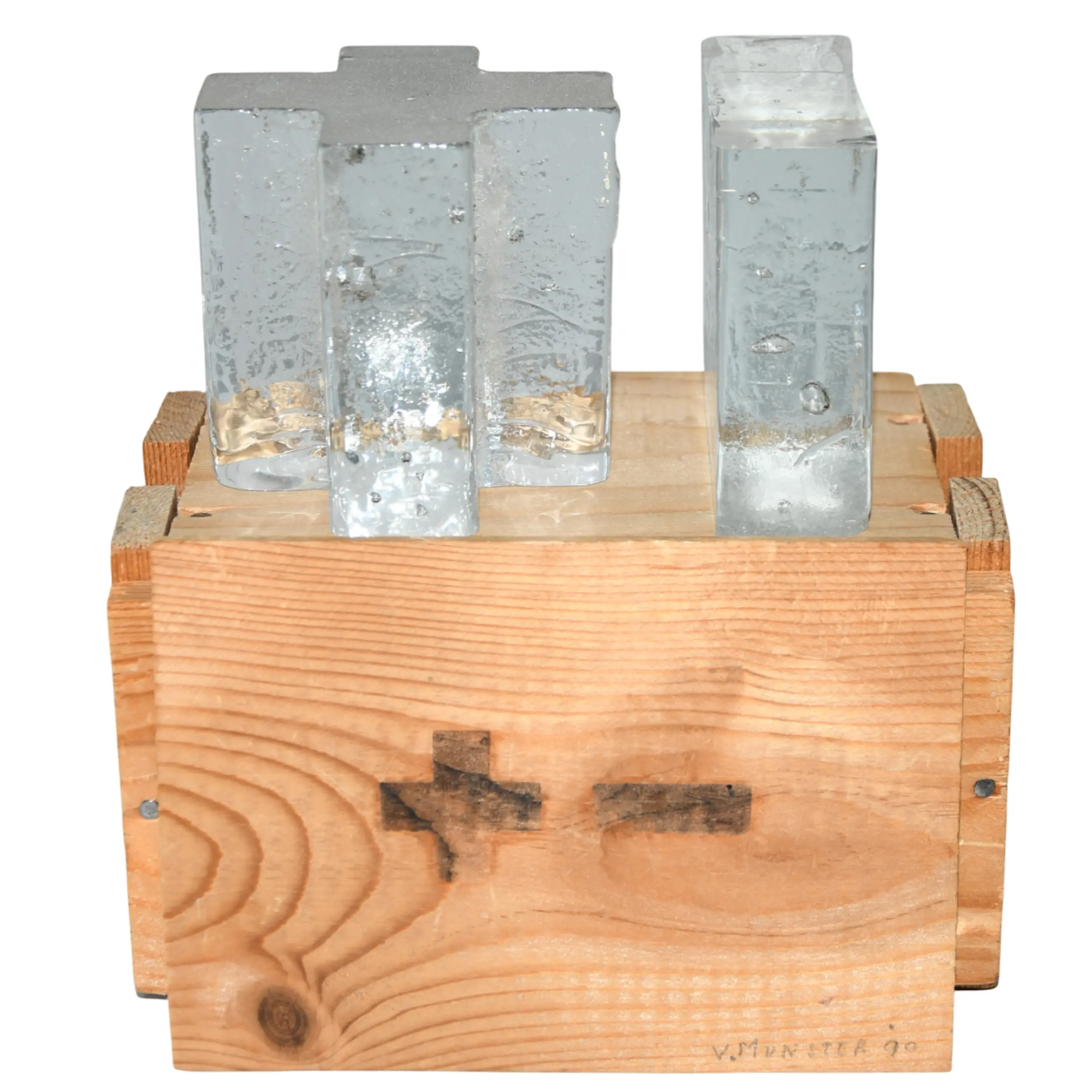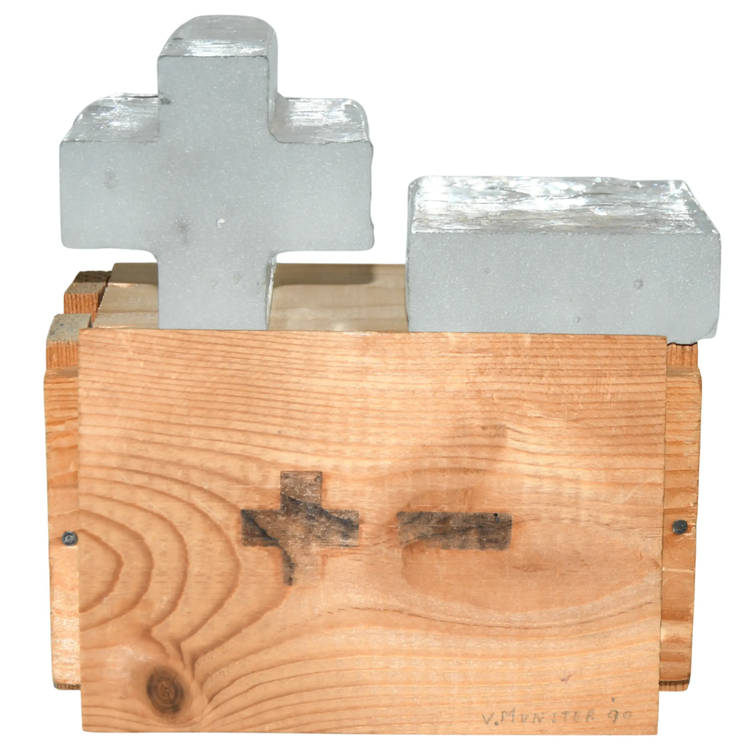 Dit kunstwerk is inclusief met de originele houten bekisting welke voorop gebrandmerkt is met + -, zijn naam en jaartal met potlood handgeschreven in blokletters met “v. Munster ’90”, en aan de binnenkant zijn handtekening met een stempel “Certificate” en met potlood handgeschreven AP wat betekent Artist Proof / Épreuve d'Artiste.