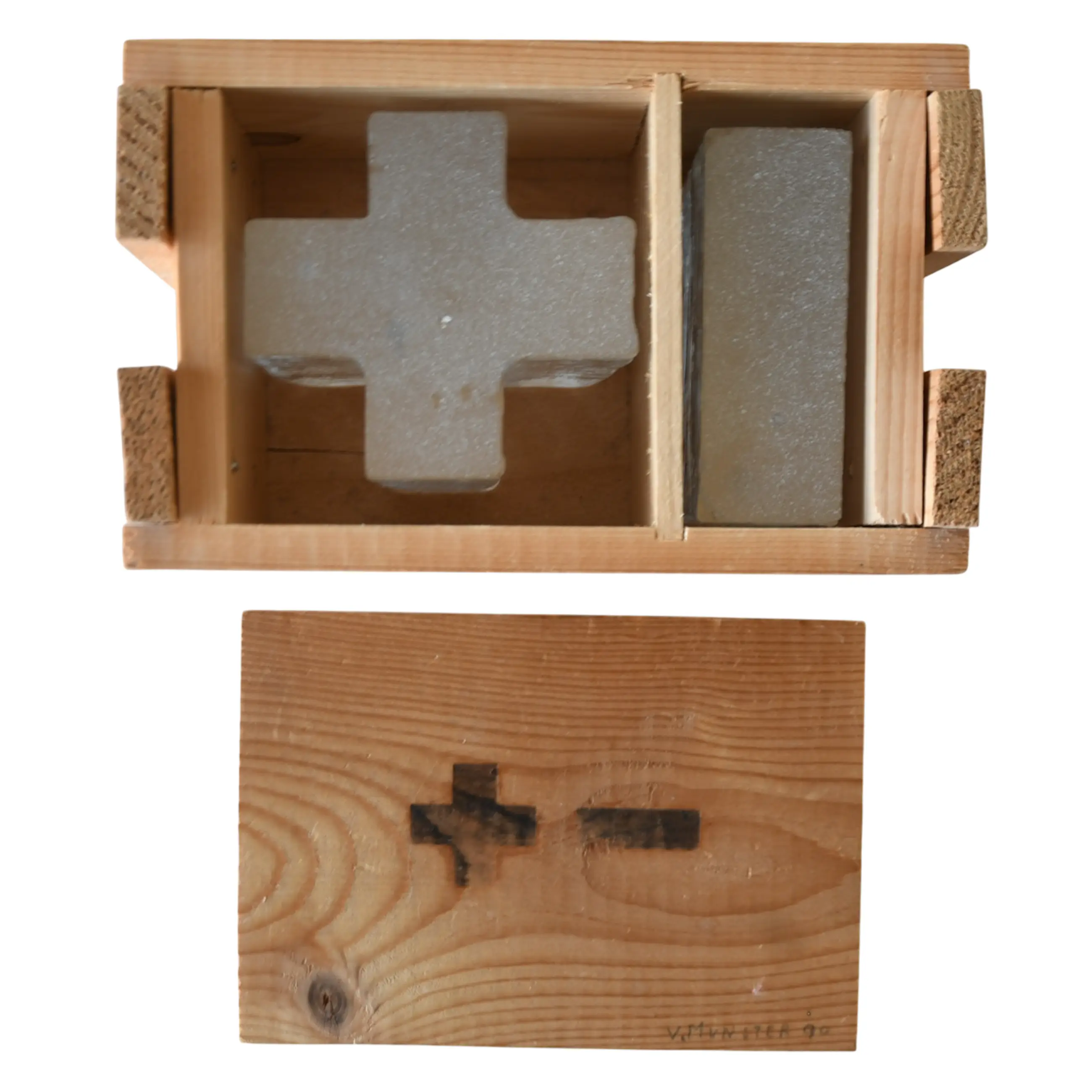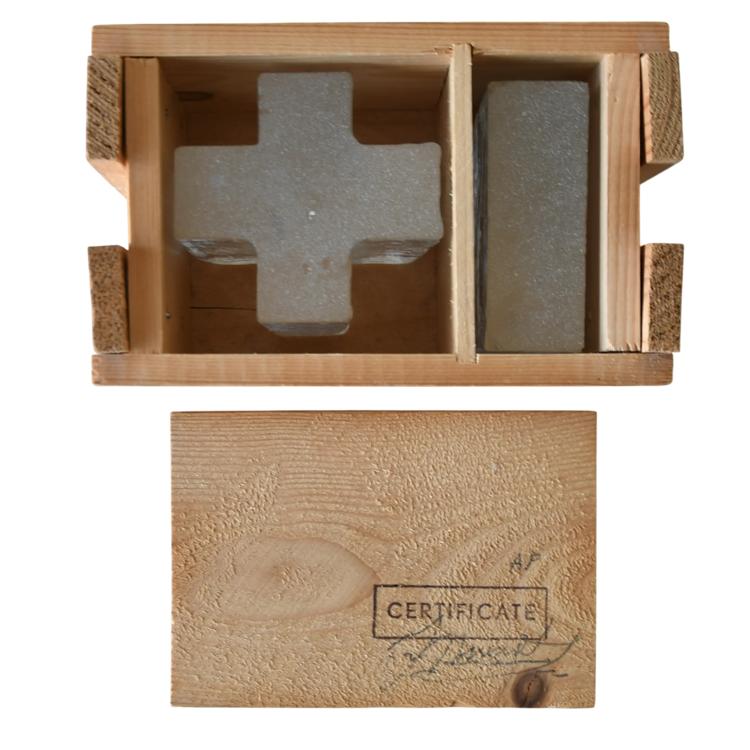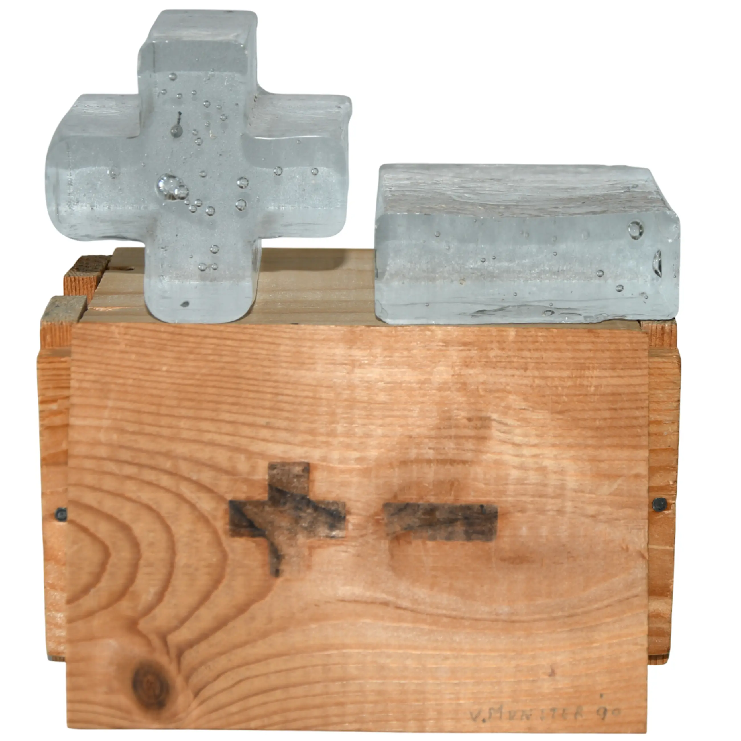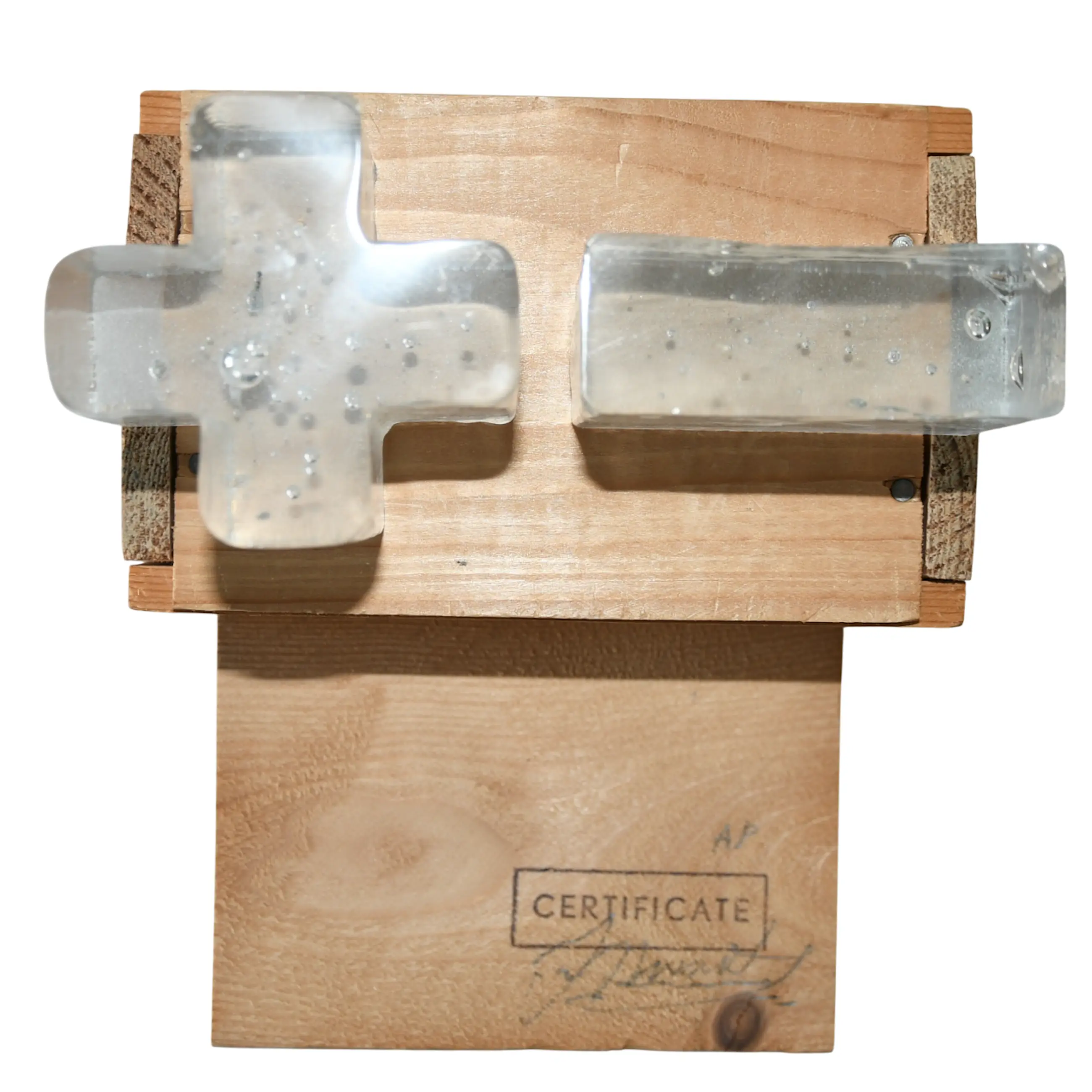 Dit kunstwerk is inclusief met de originele houten bekisting welke voorop gebrandmerkt is met + -, zijn naam en jaartal met potlood handgeschreven in blokletters met “v. Munster ’90”, en aan de binnenkant zijn handtekening met een stempel “Certificate” en met potlood handgeschreven AP wat betekent Artist Proof / Épreuve d'Artiste.