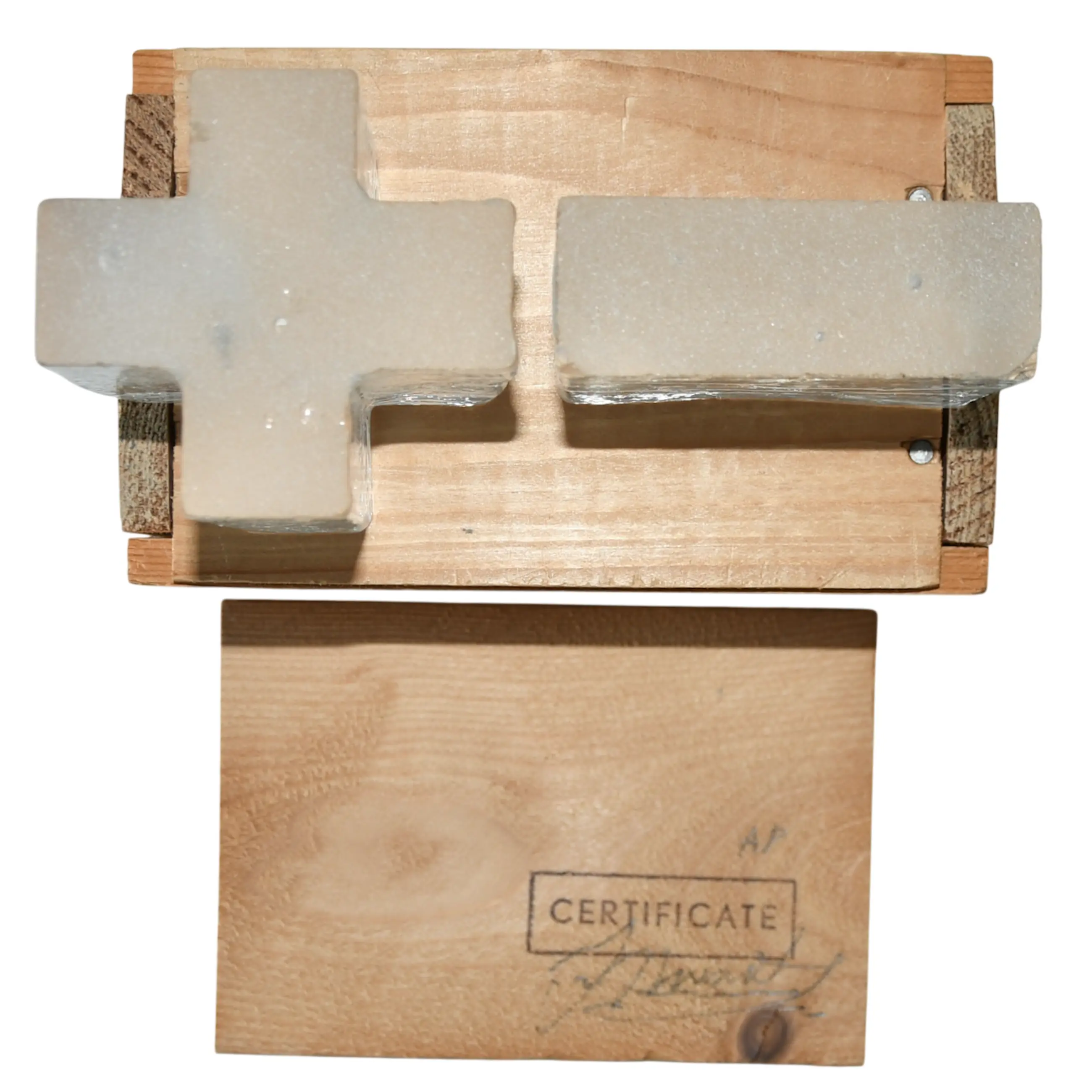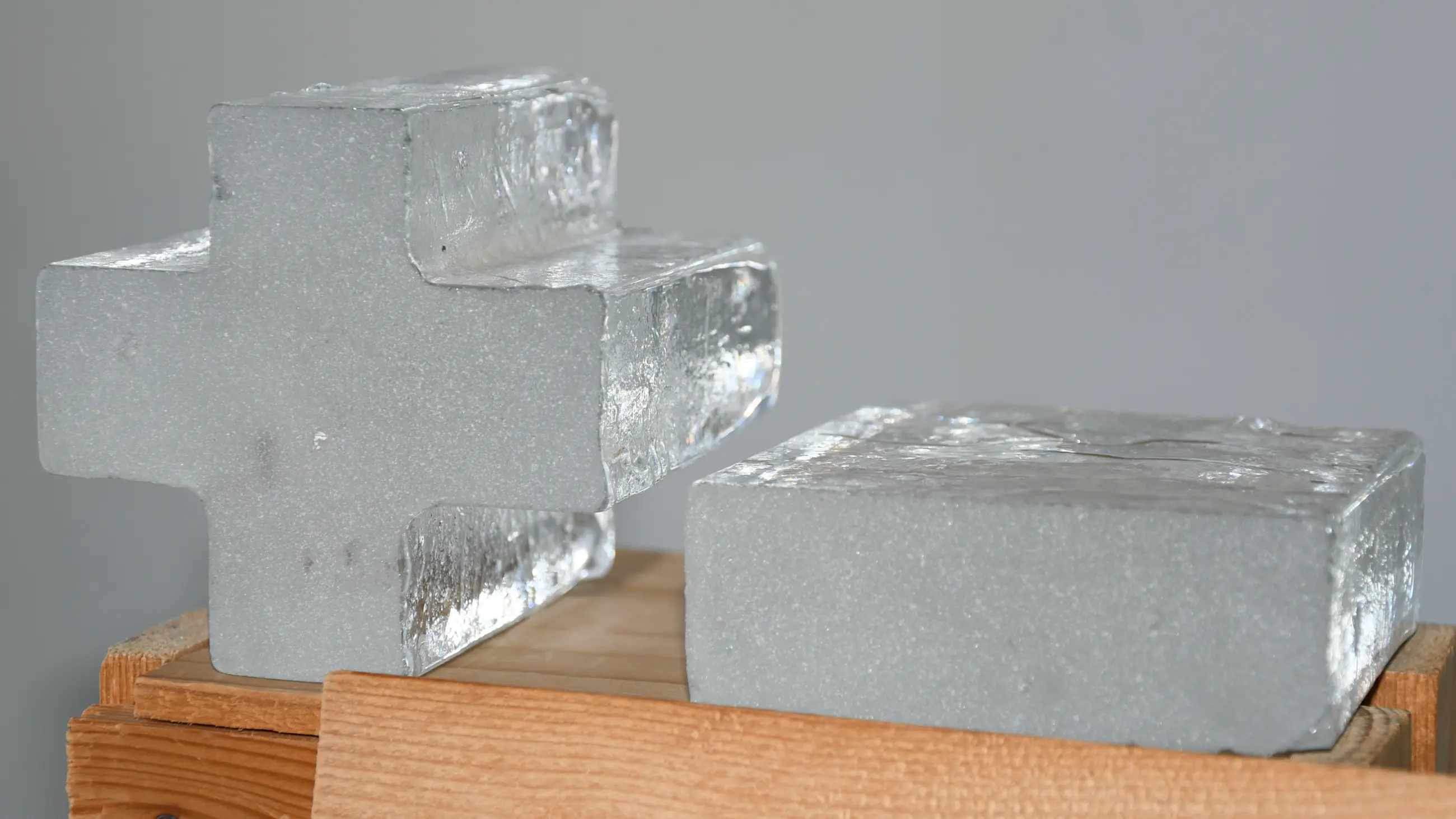 "Plus Minus / Minus Plus" is gemaakt van gegoten glas waarvan de ene kant glans is en de andere kant gezandstraald.