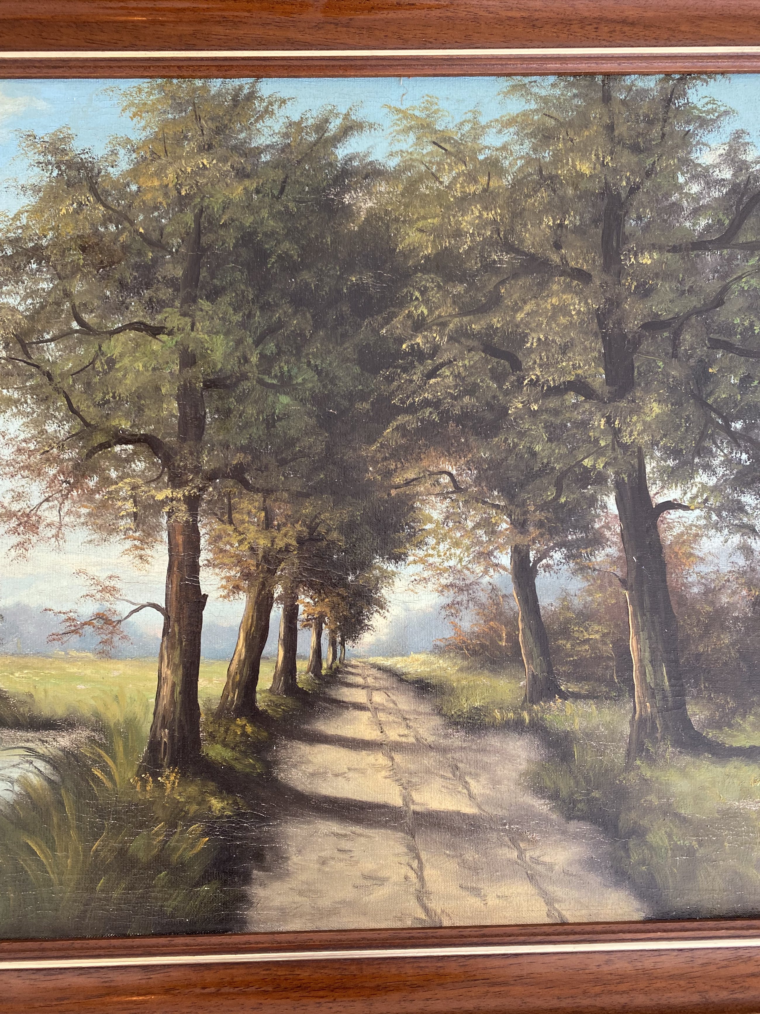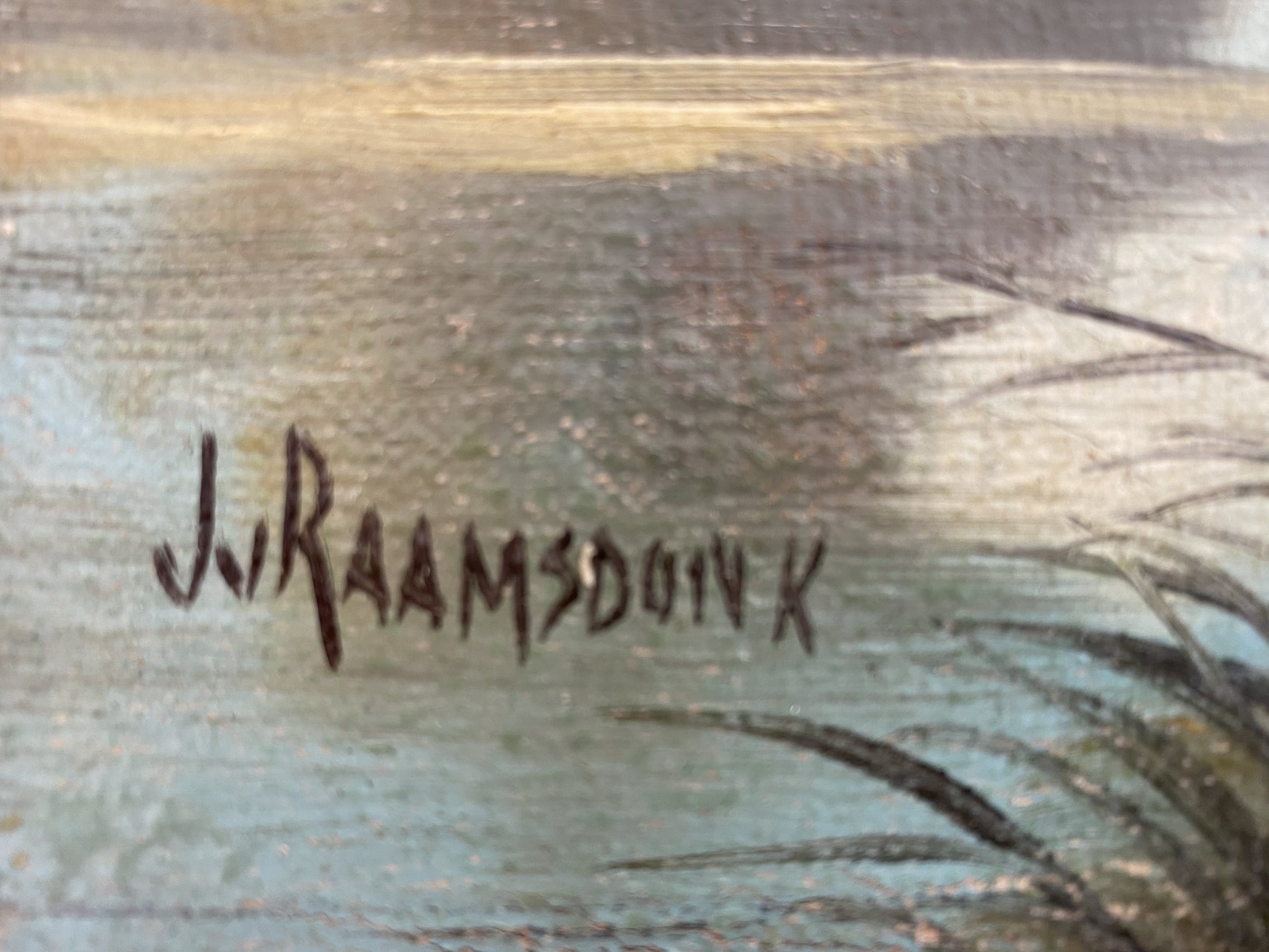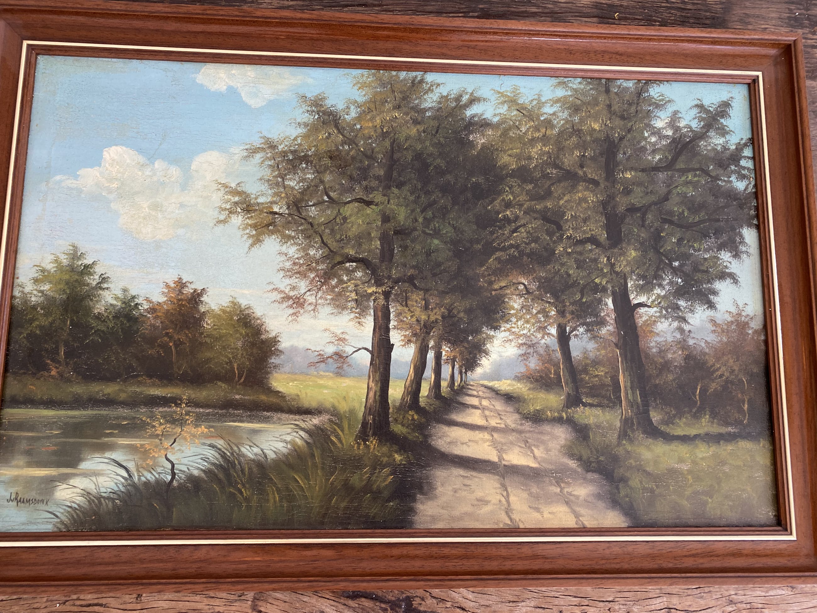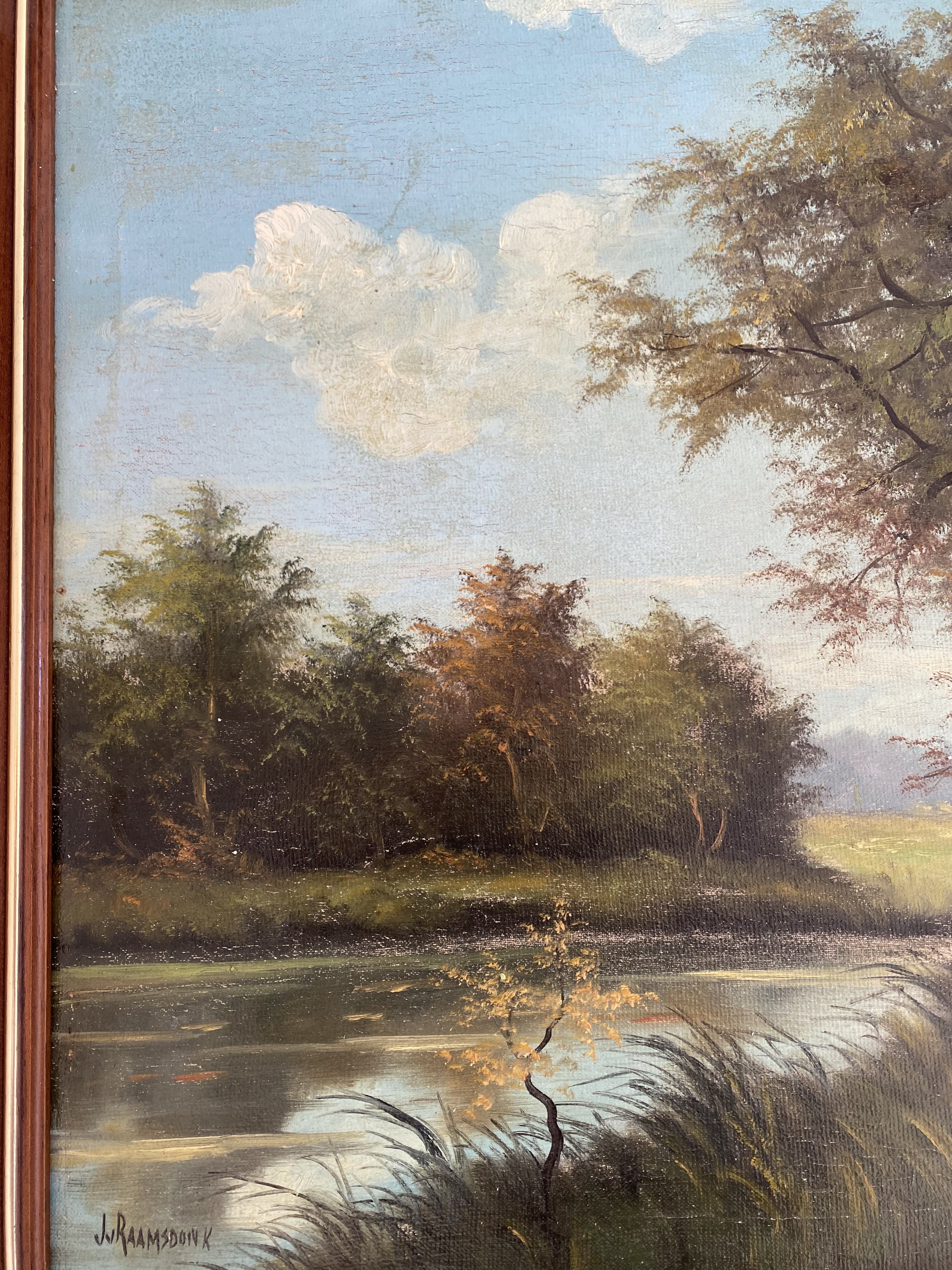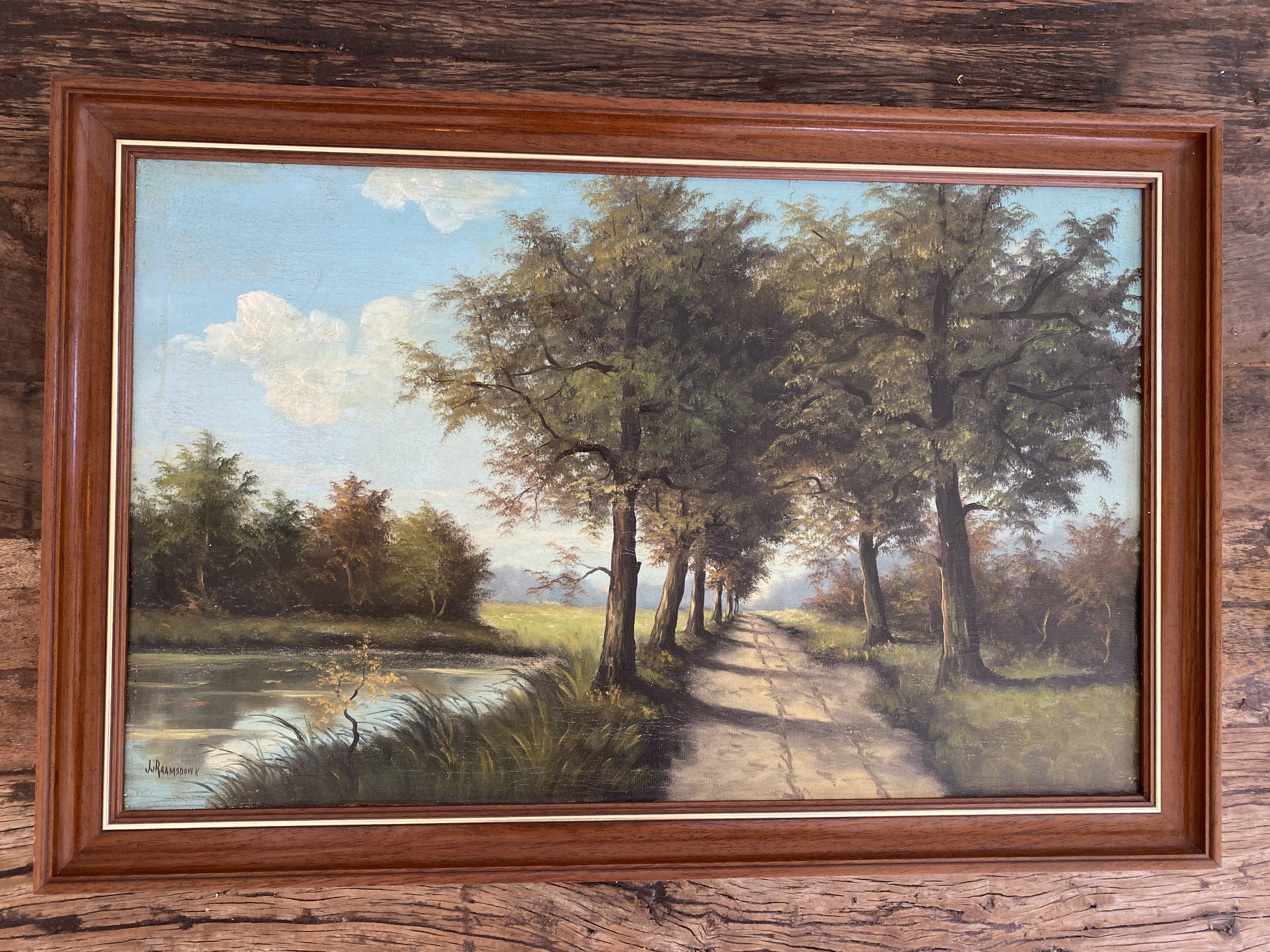 Handgesigneerd schilderij van J. van Raamsdonk. Van Raamsdonk was een schilder geboren in Dusseldorf en werkzaam vanuit Amsterdam. Van Raamsdonk is vooral bekend vanwege de geschilderde landschappen en stadsgezichten waarvan dit werk een mooi voorbeeld is. Het schilderij geeft een prachtig bospad weer langs het water. In het water is een bijzonder mooie weerspiegeling te zien. De lichtinval is in het schilderij is prachtig weer gegeven.