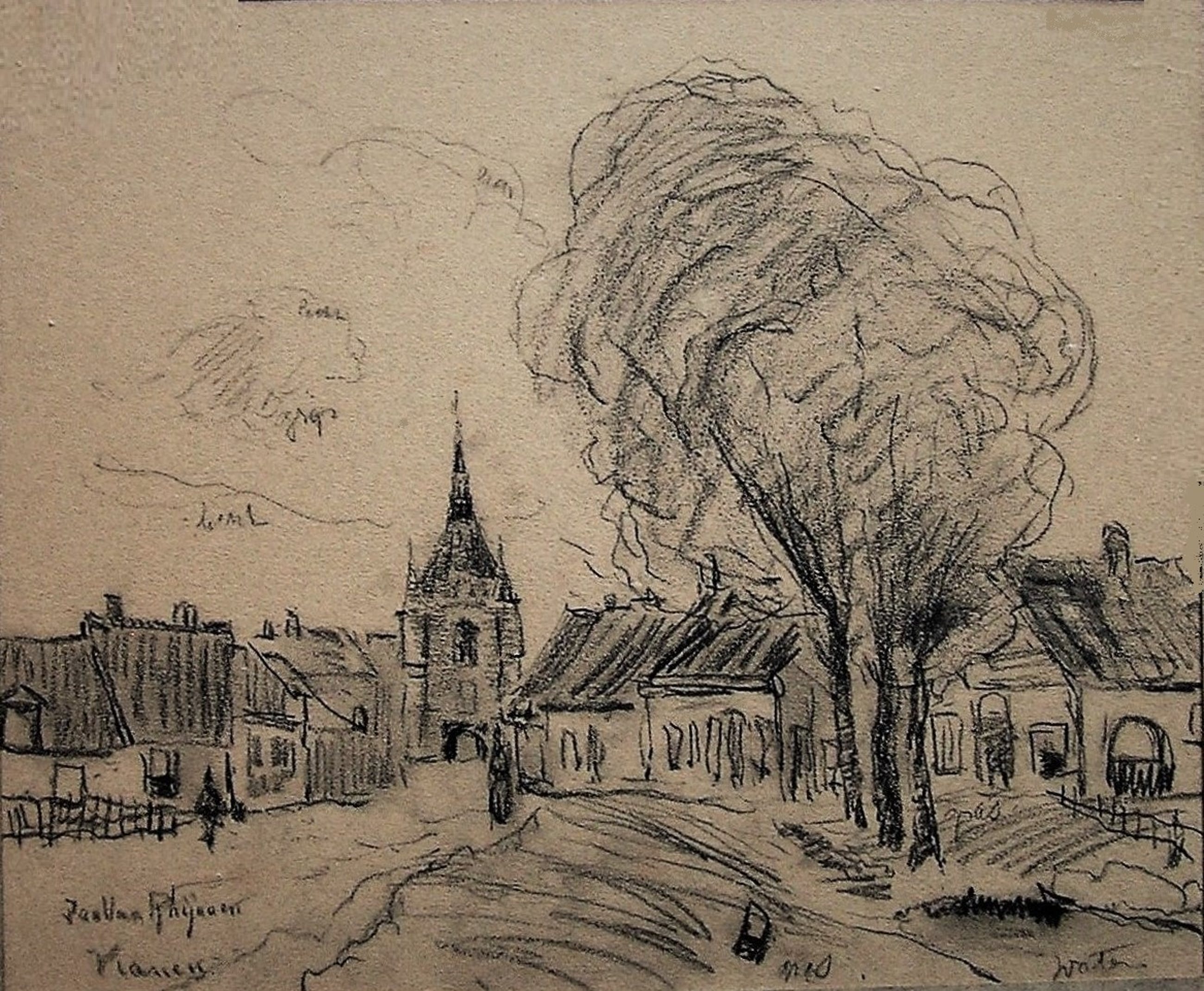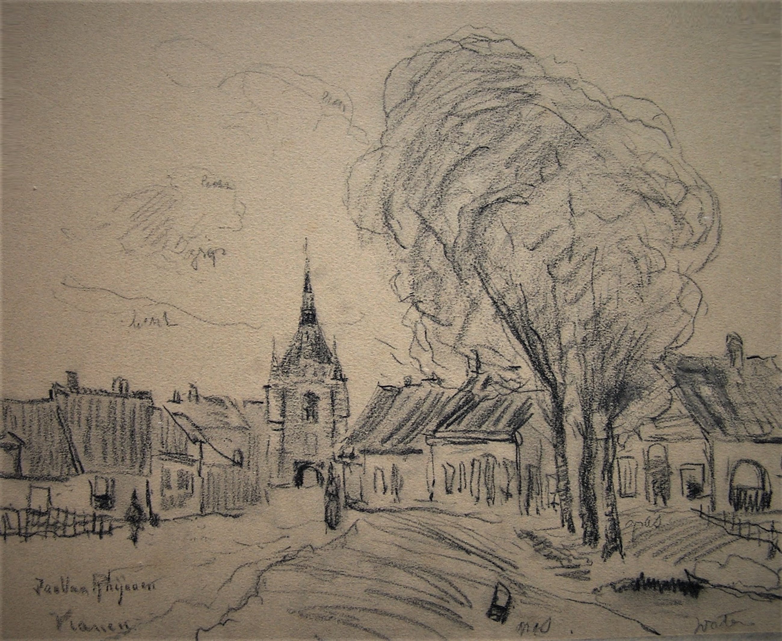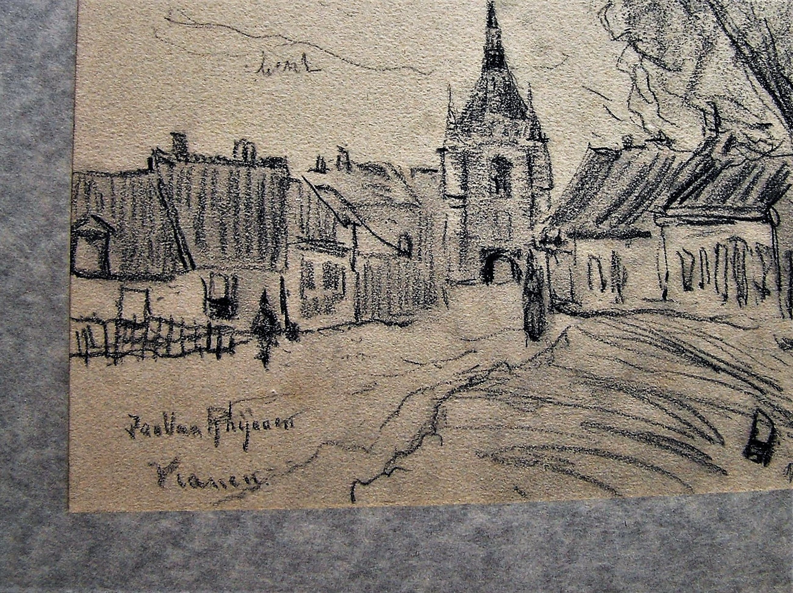 Houtskooltekening van Johannes (Jan) van Rhijnen ('s-Gravenhage 1859 – ’s Gravenhage 1927). Voorstelling: Gezicht op de Lekpoort in Vianen. Links onder met de hand gesigneerd ( “Jan Van Rhijnnen”) en geannoteerd (“Vianen”). Schetsboekschets op crême wit tekenpapier.