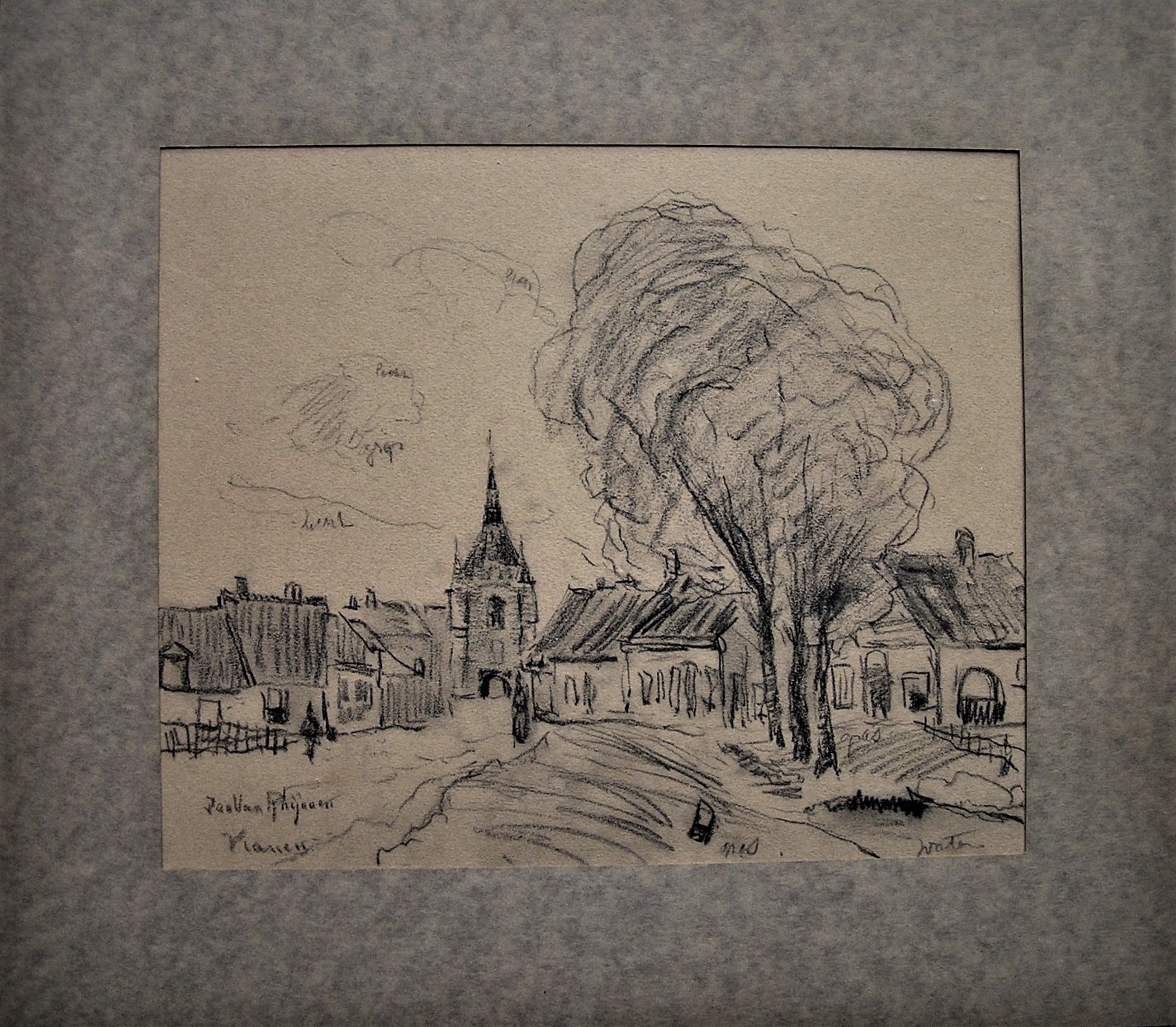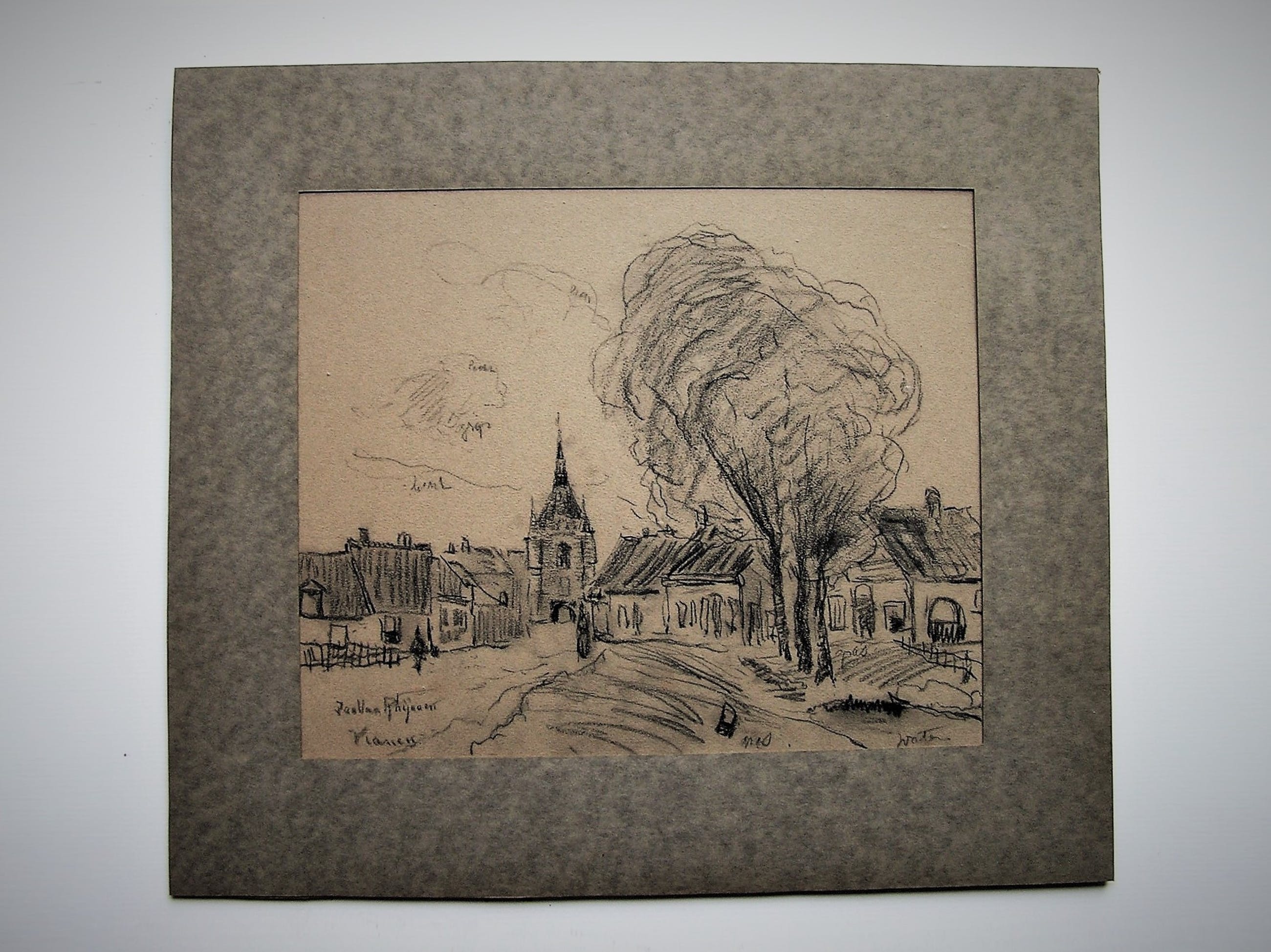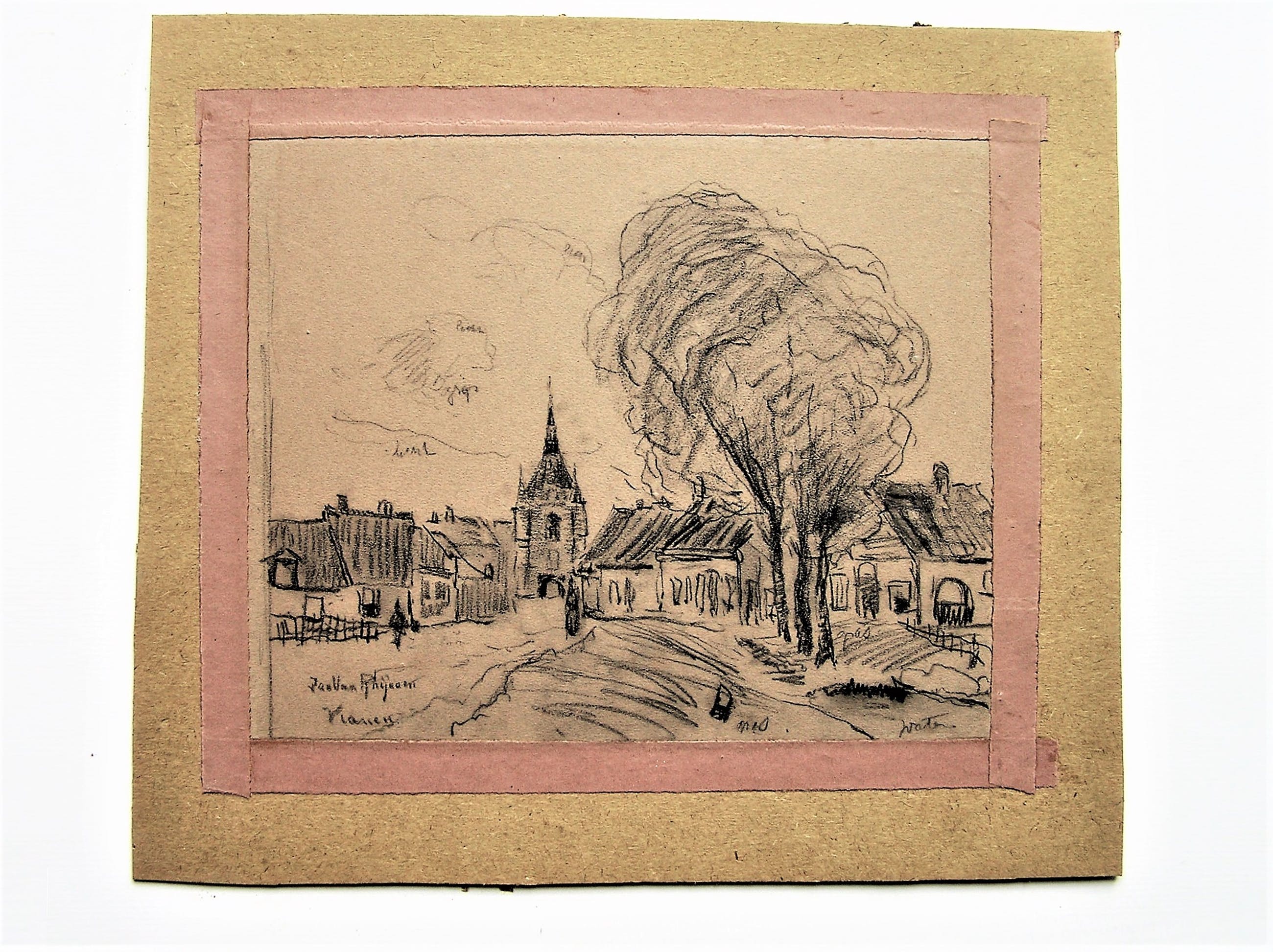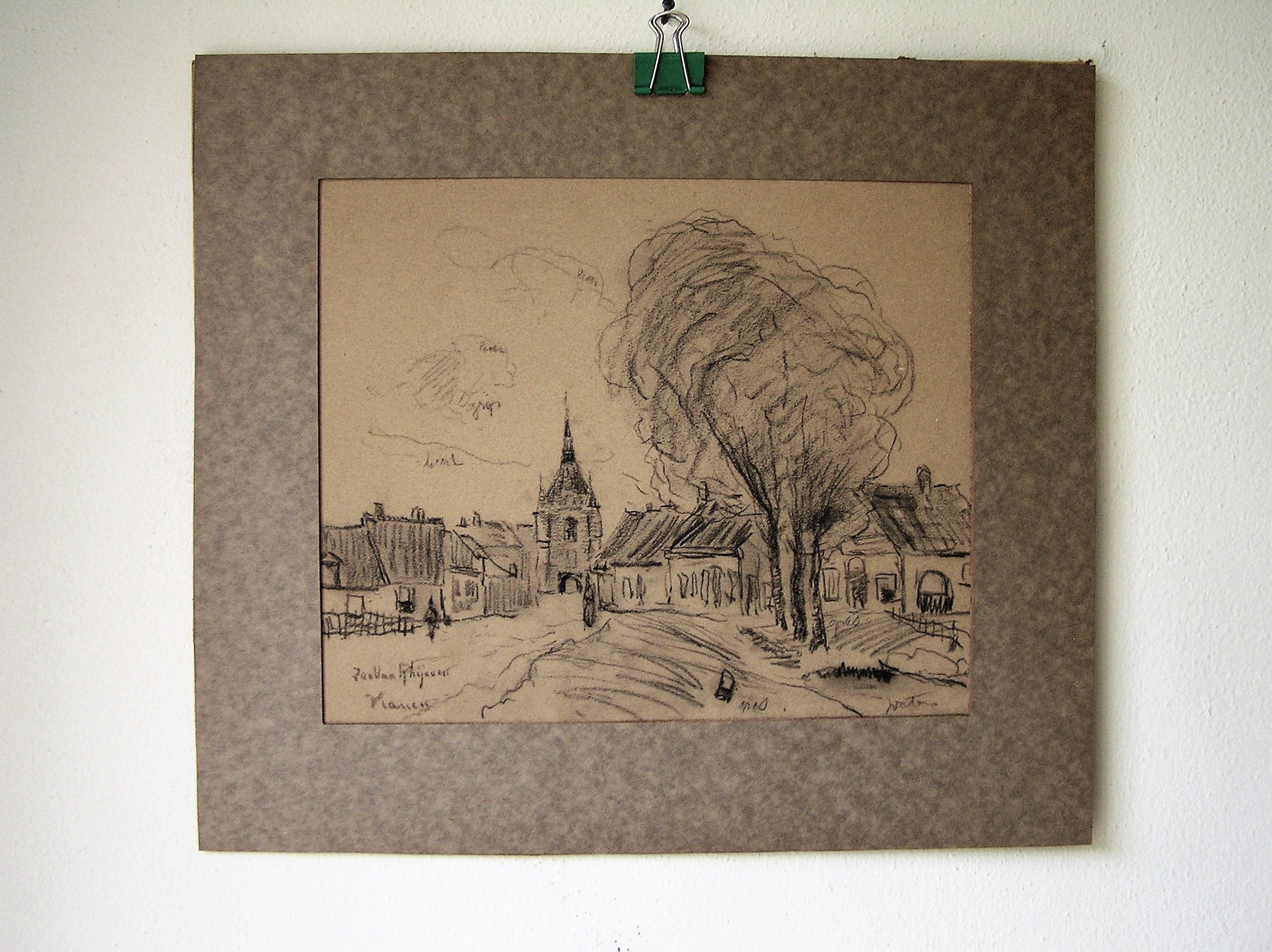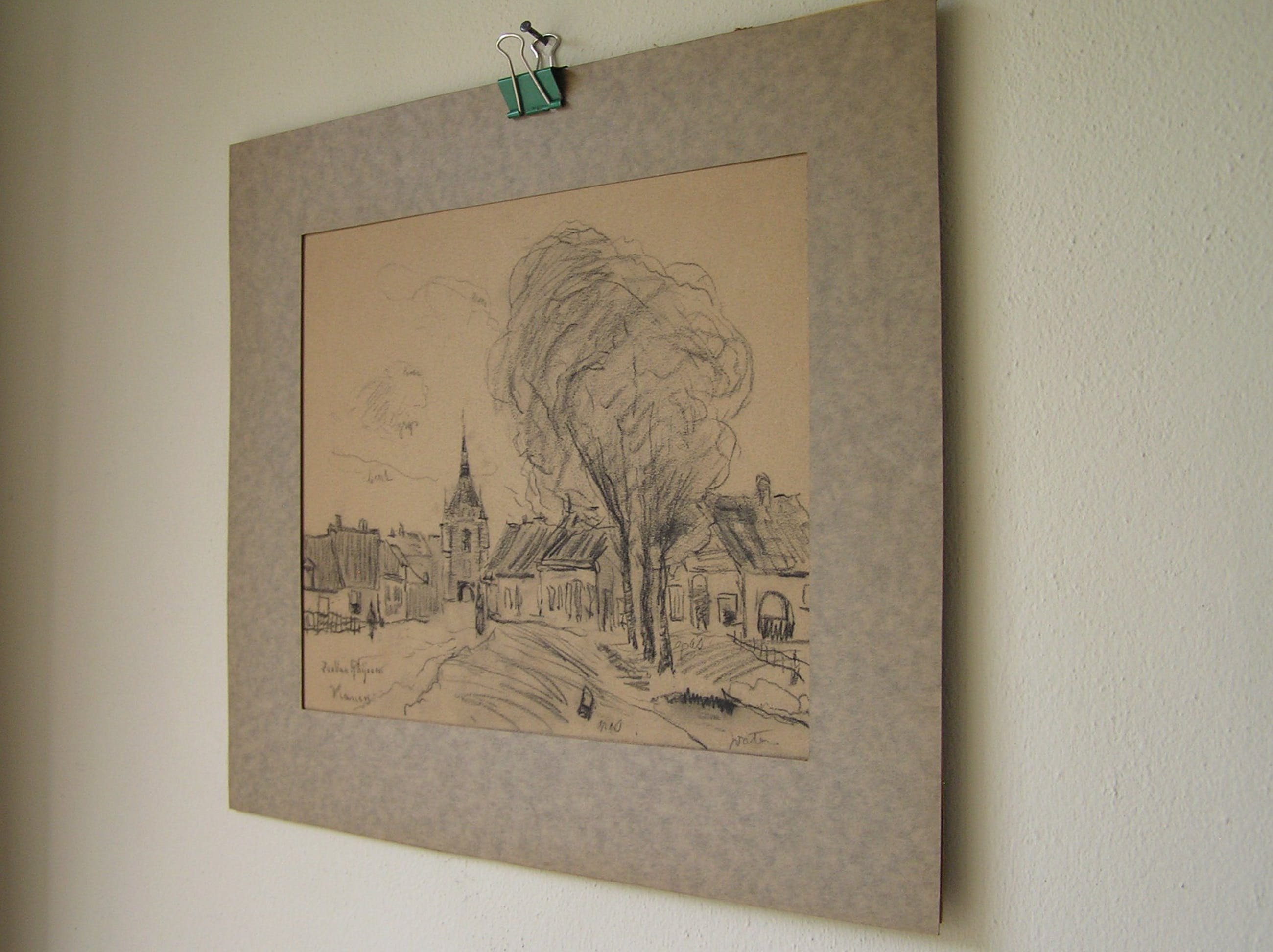 Afmetingen: 25 cm x 30 cm (beeld), 26 c, x 32 cm (papier), 36.5 cm x 42 cm (passepartout). Conditie: de tekening bevindt zich in goede staat,