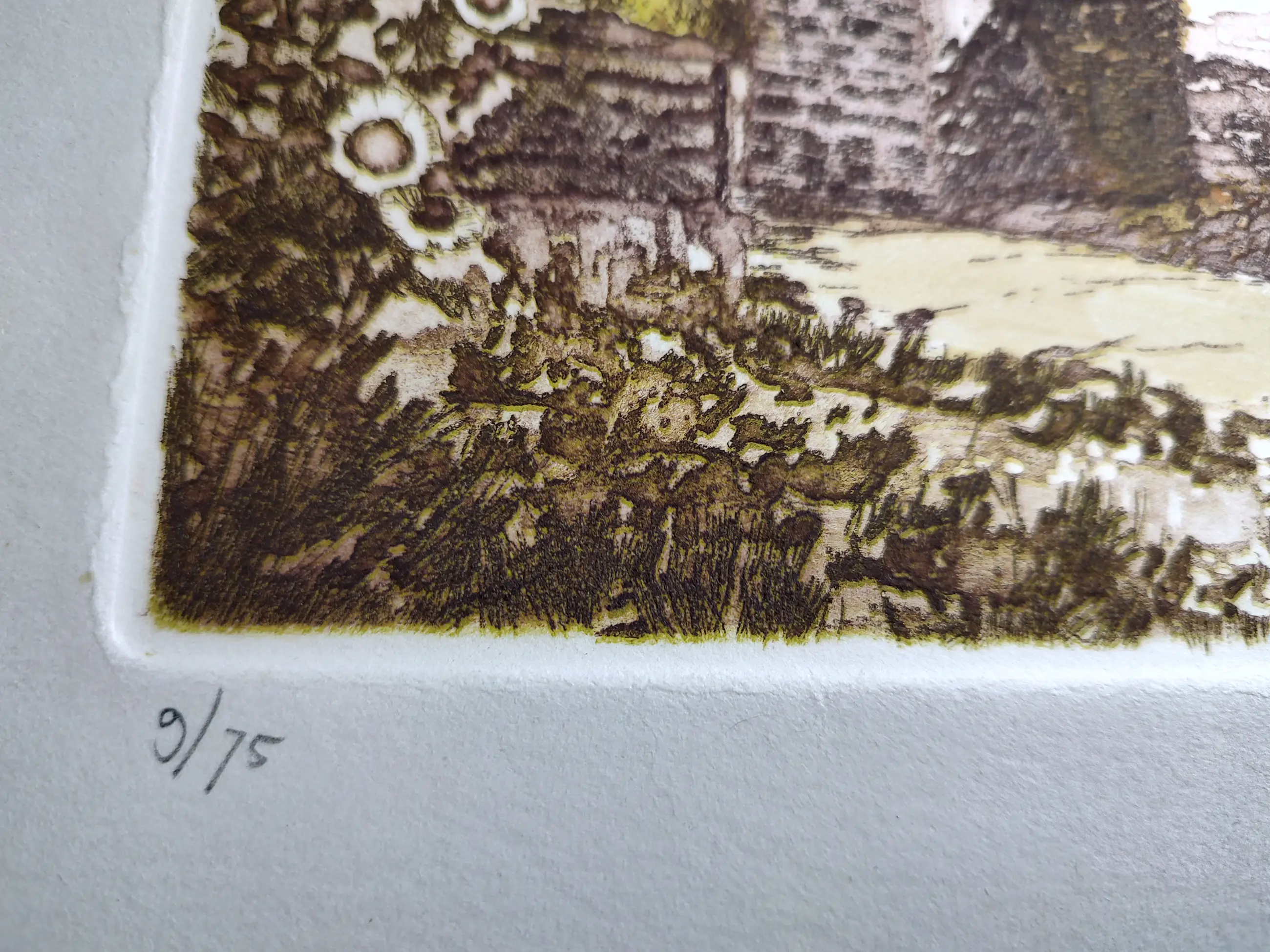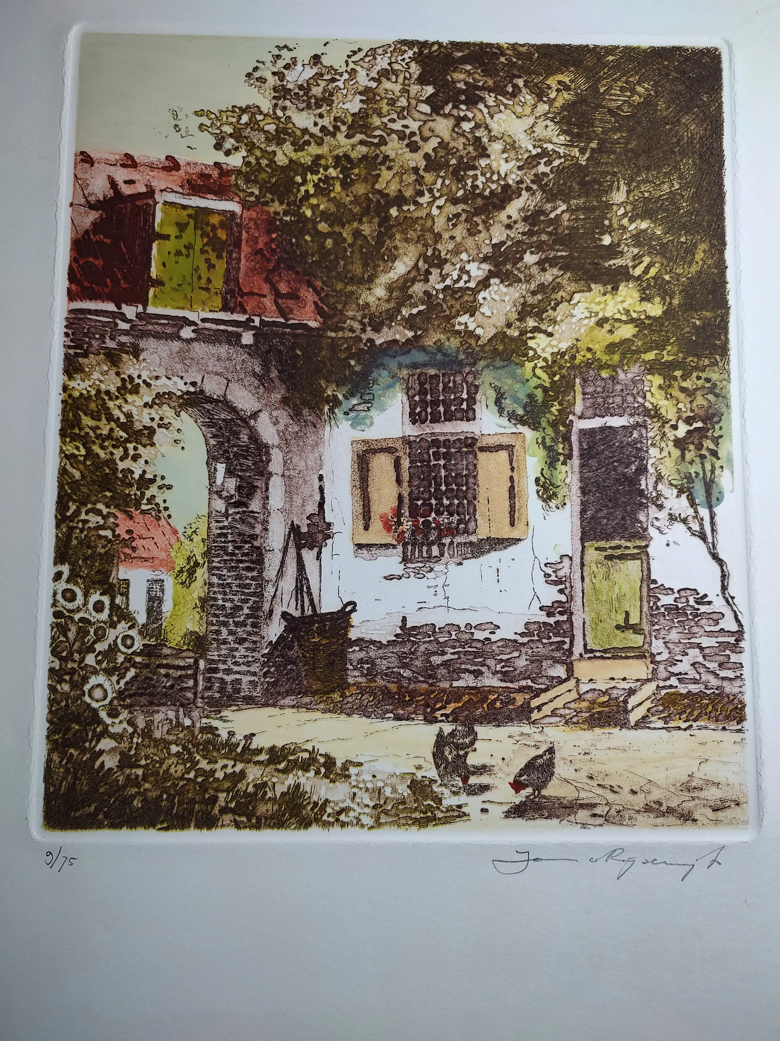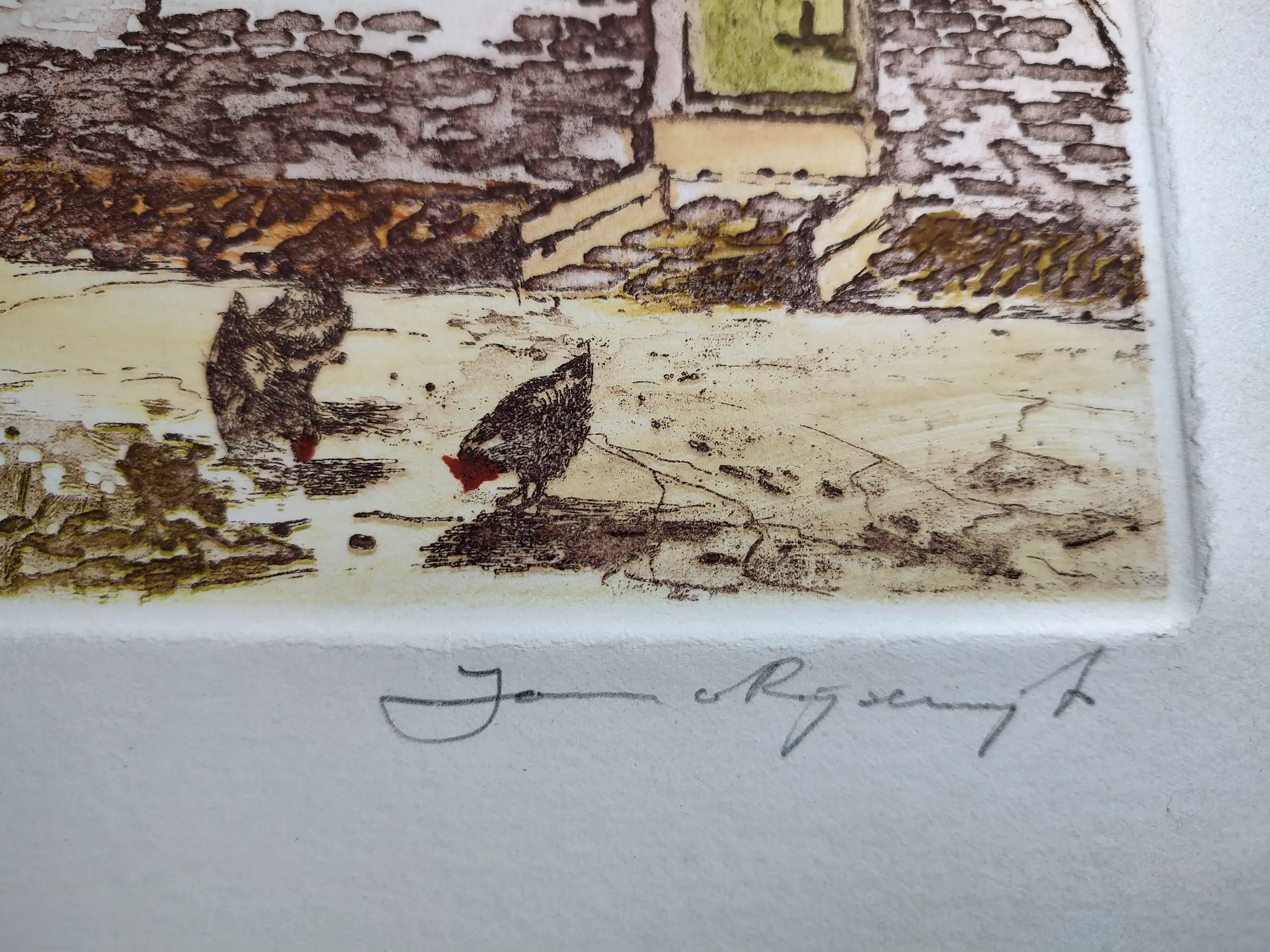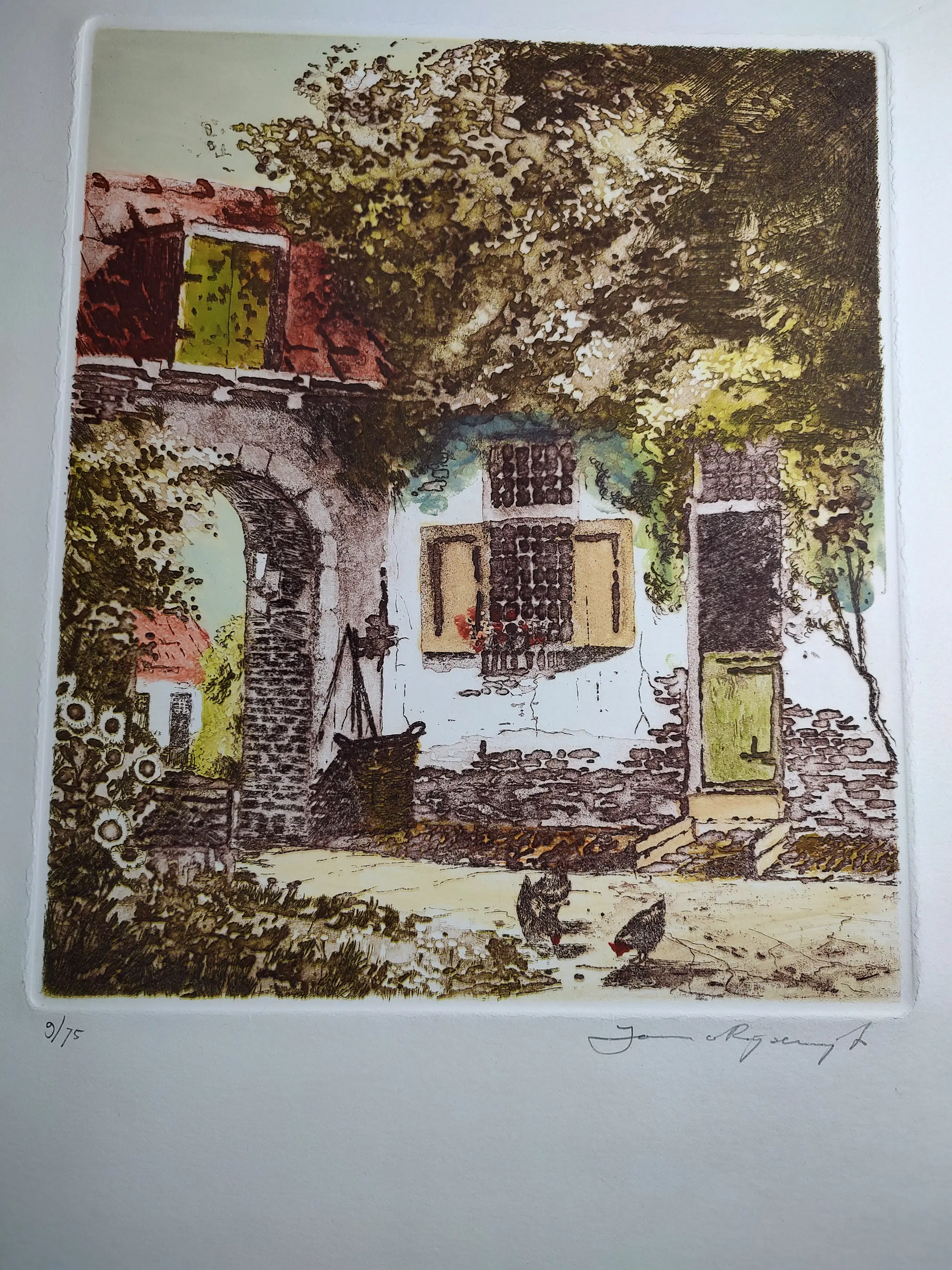 Ingekleurde Ets van rustiek hofje met poort en kippetjes. De ets is niet ingelijst en de buitenmaten van het papier zijn 69x33 cm